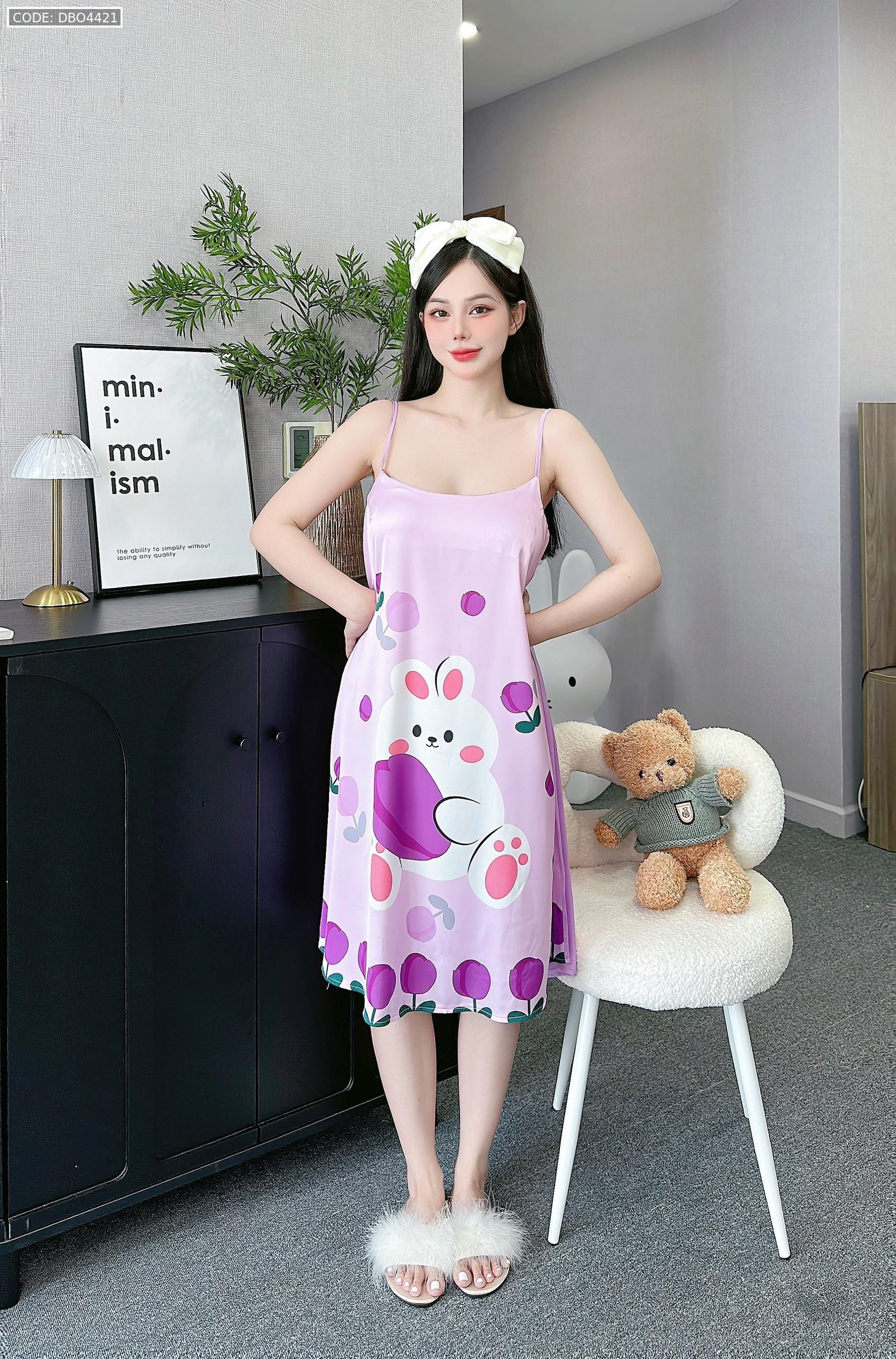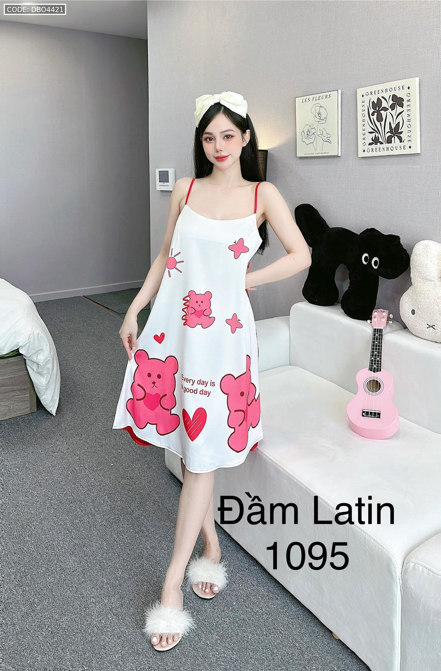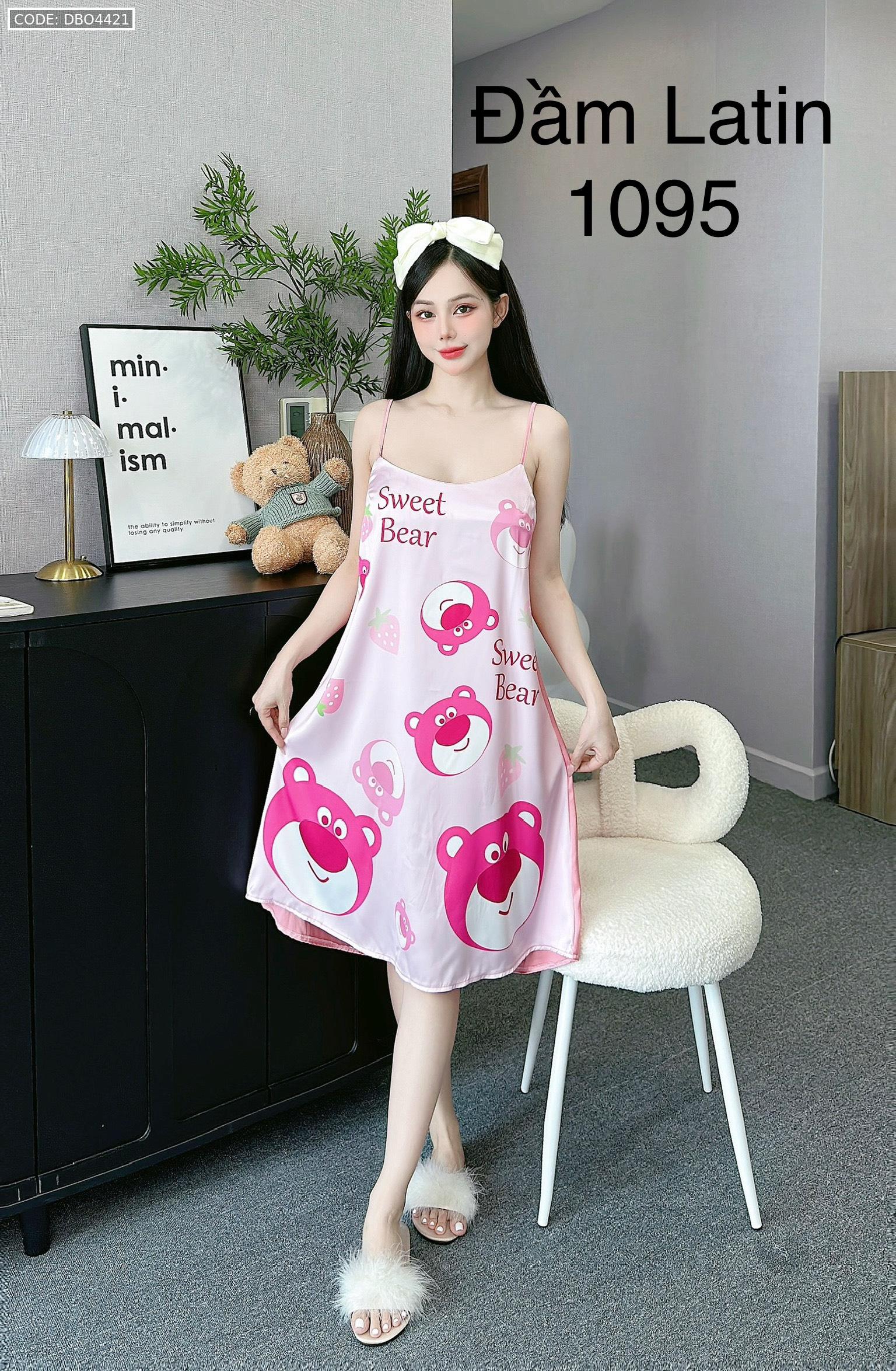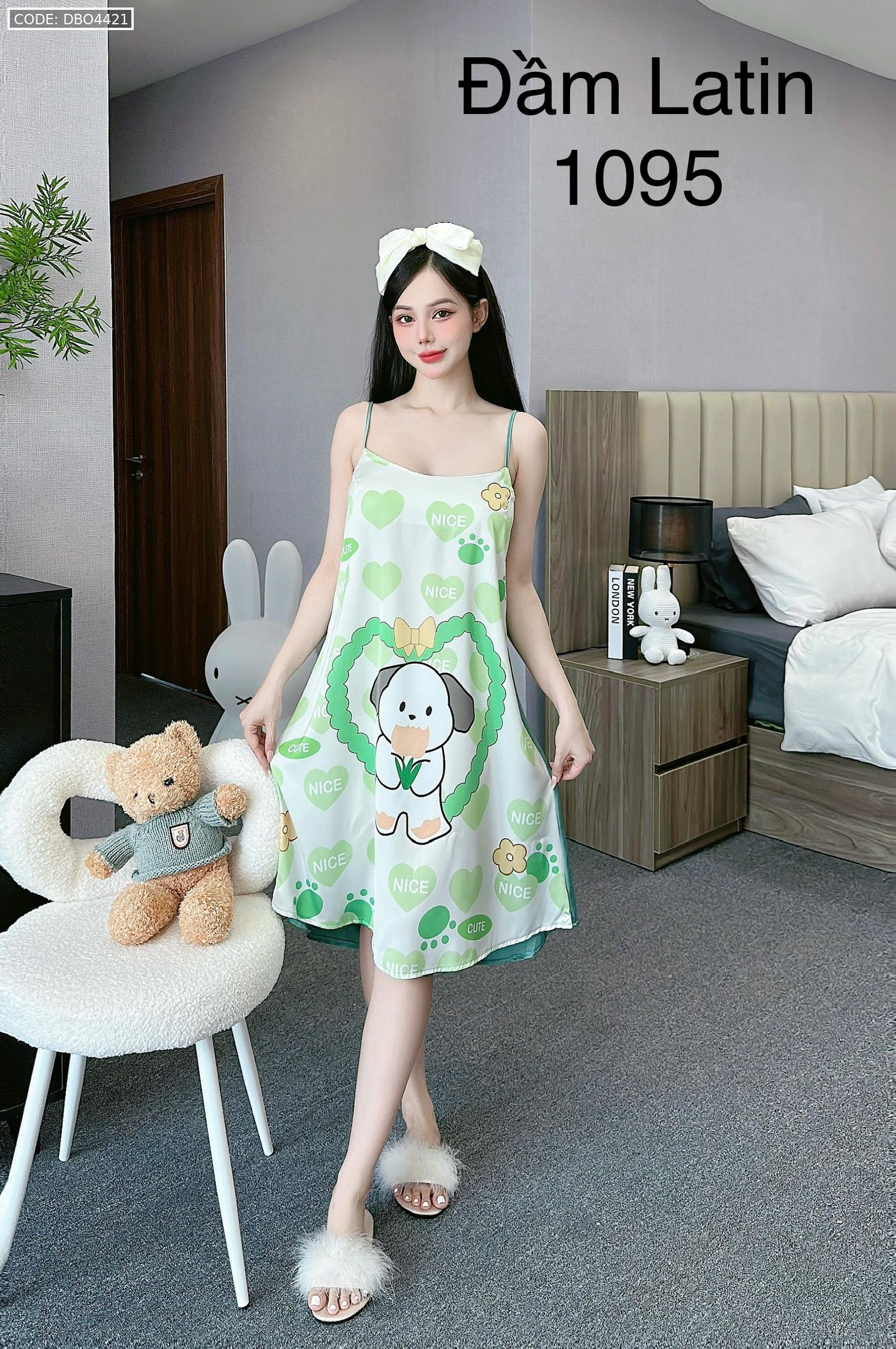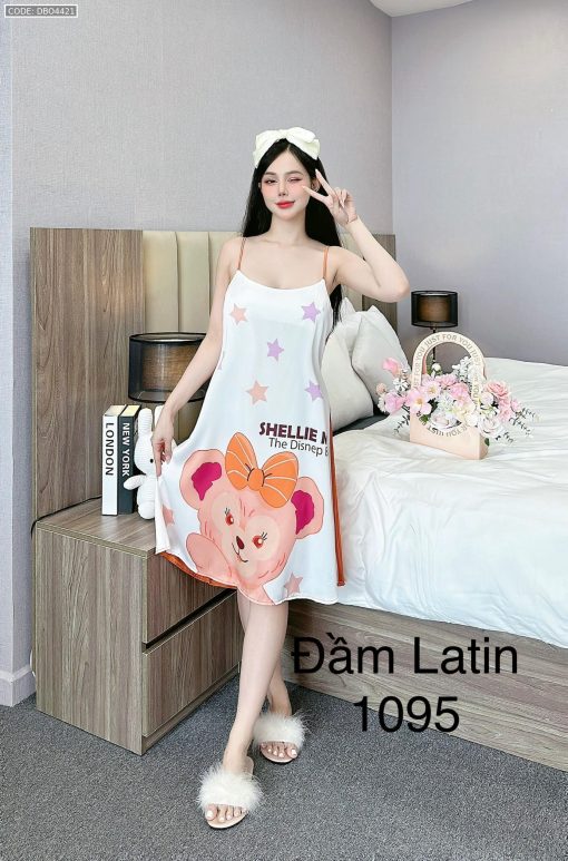 Đầm latin mặc nhà hai dây form chữ A in hình dể thương