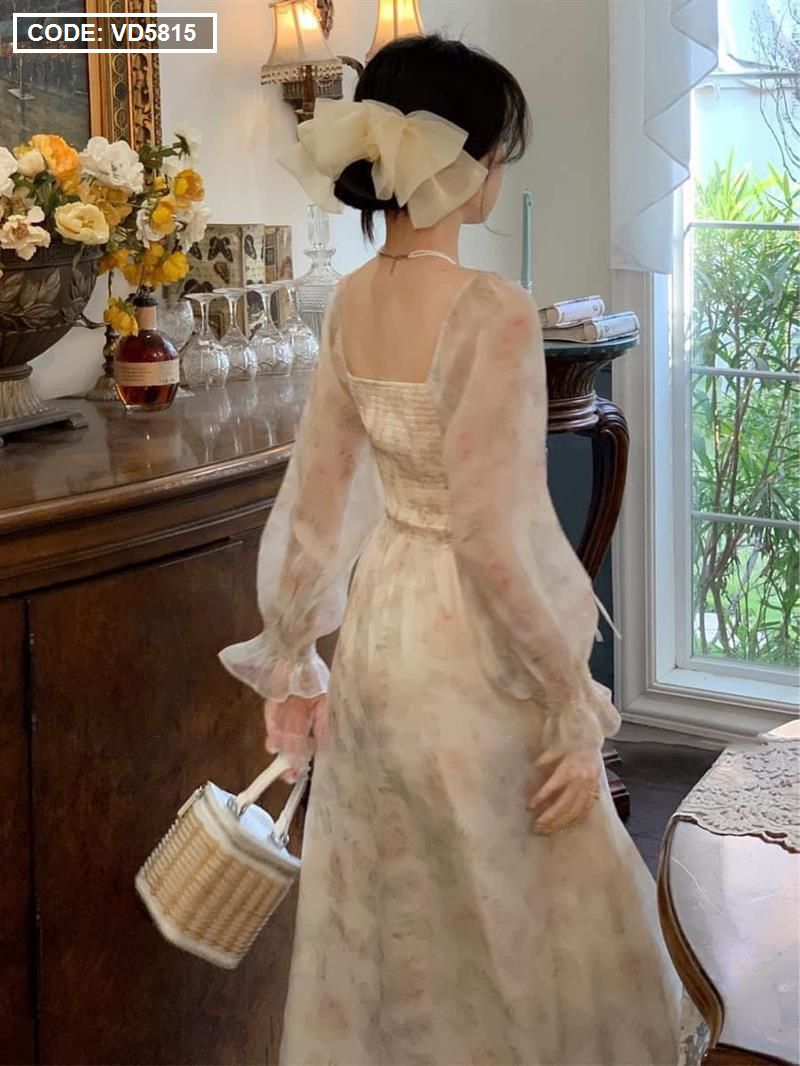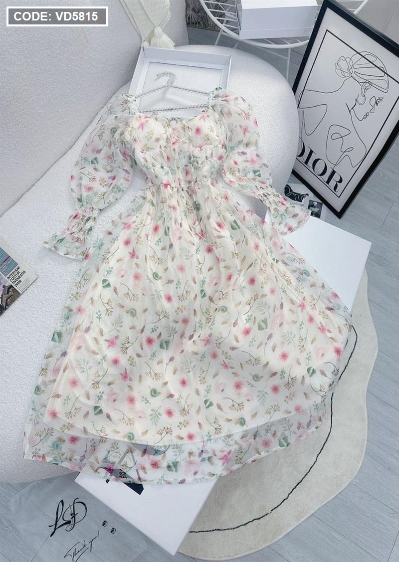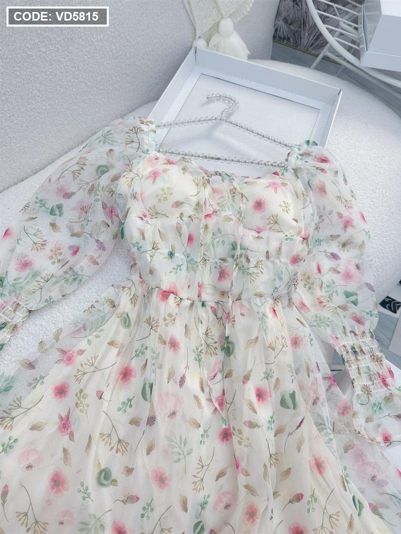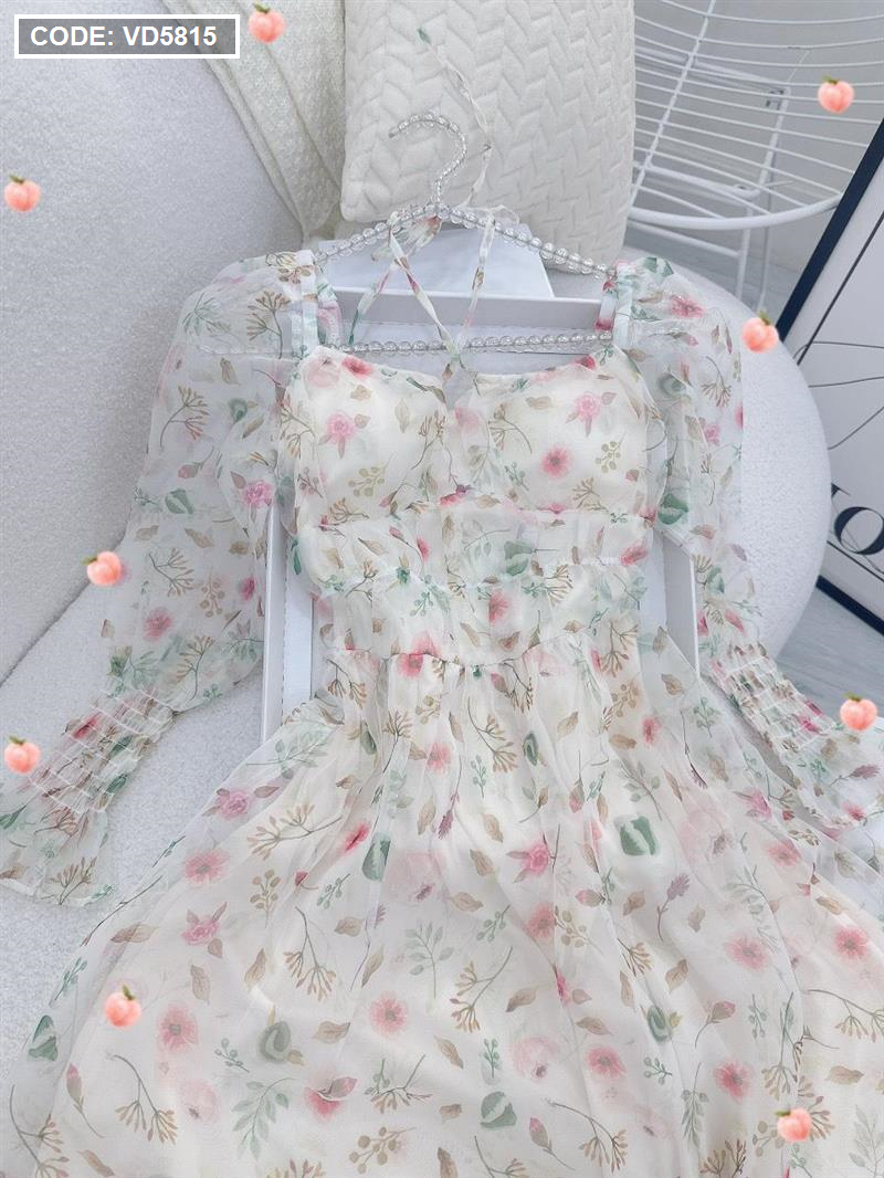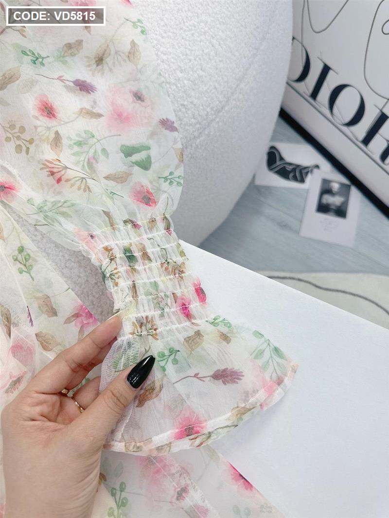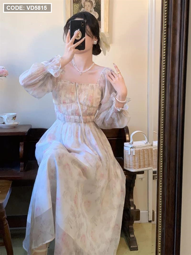 Đầm maxi voan hoa tay dài nhúng eo ngực