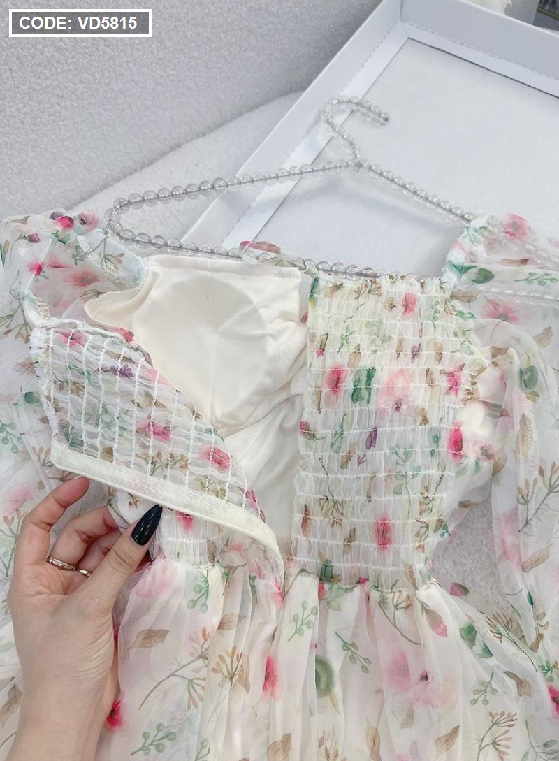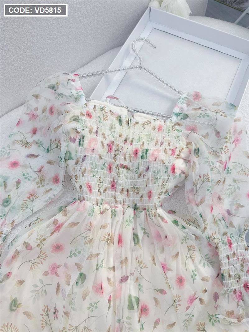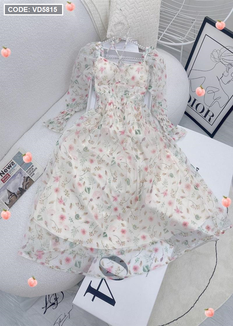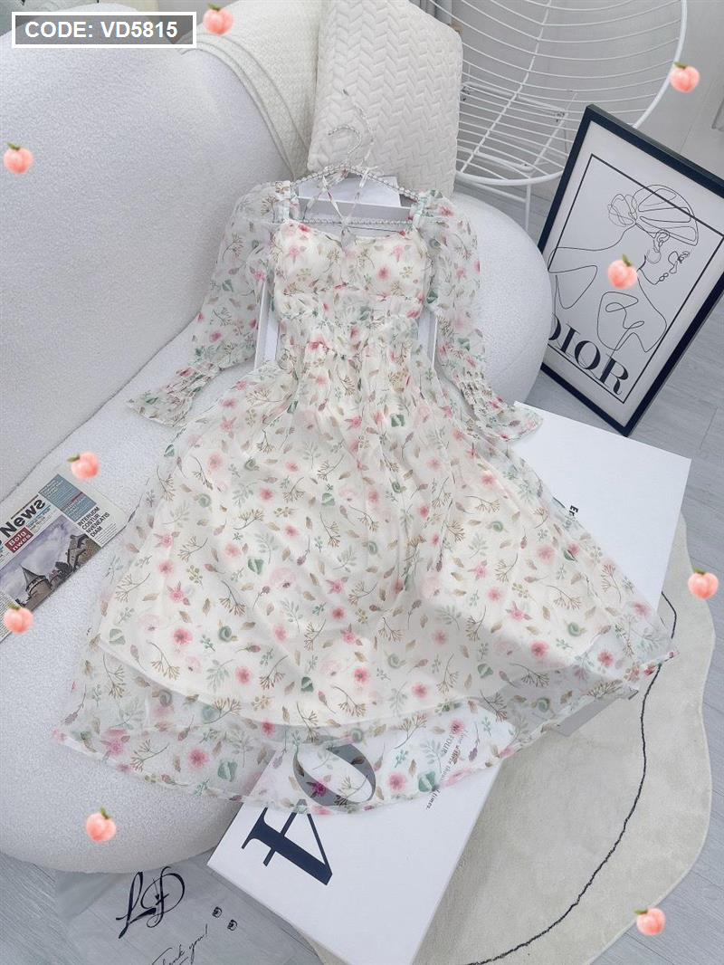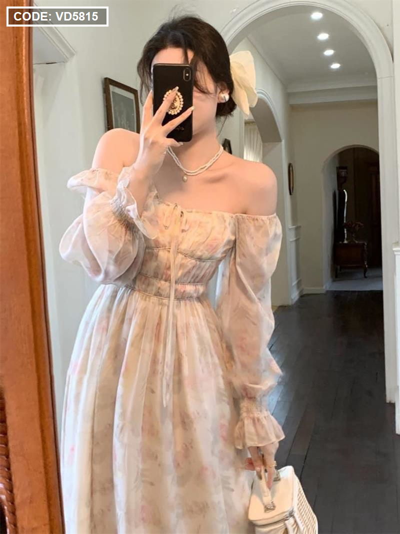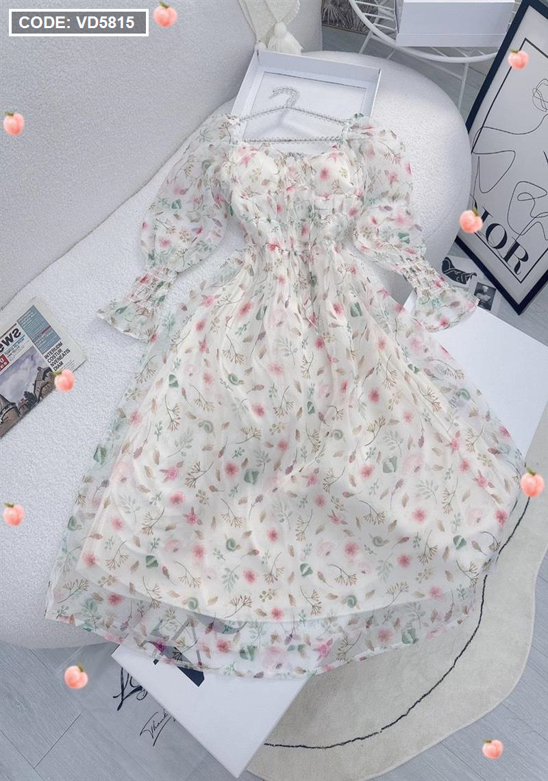 Đầm maxi voan hoa tay dài nhúng eo ngực