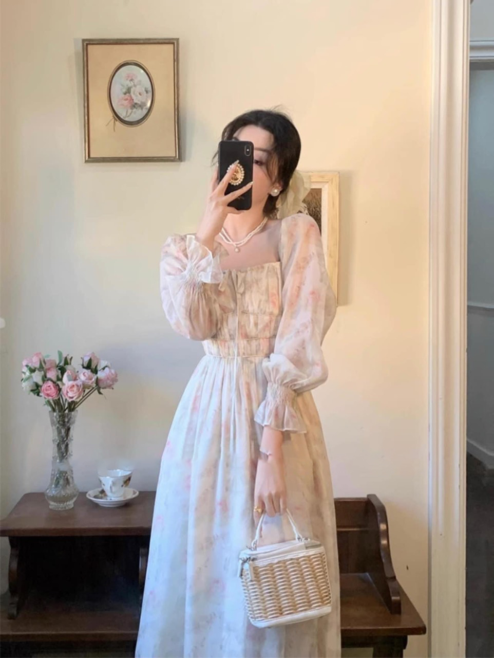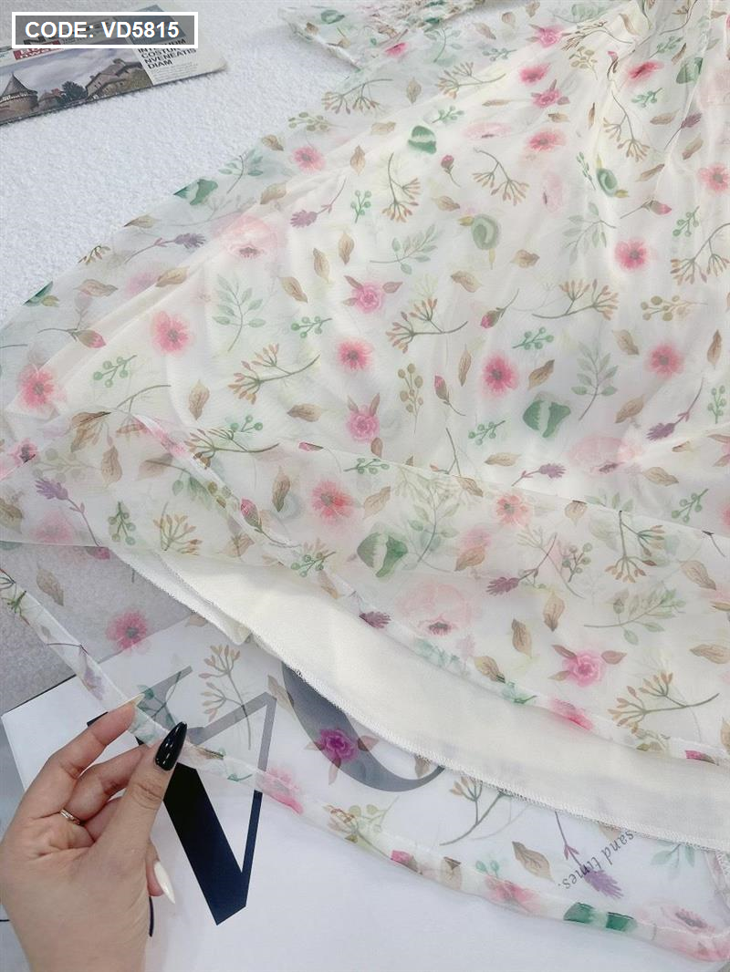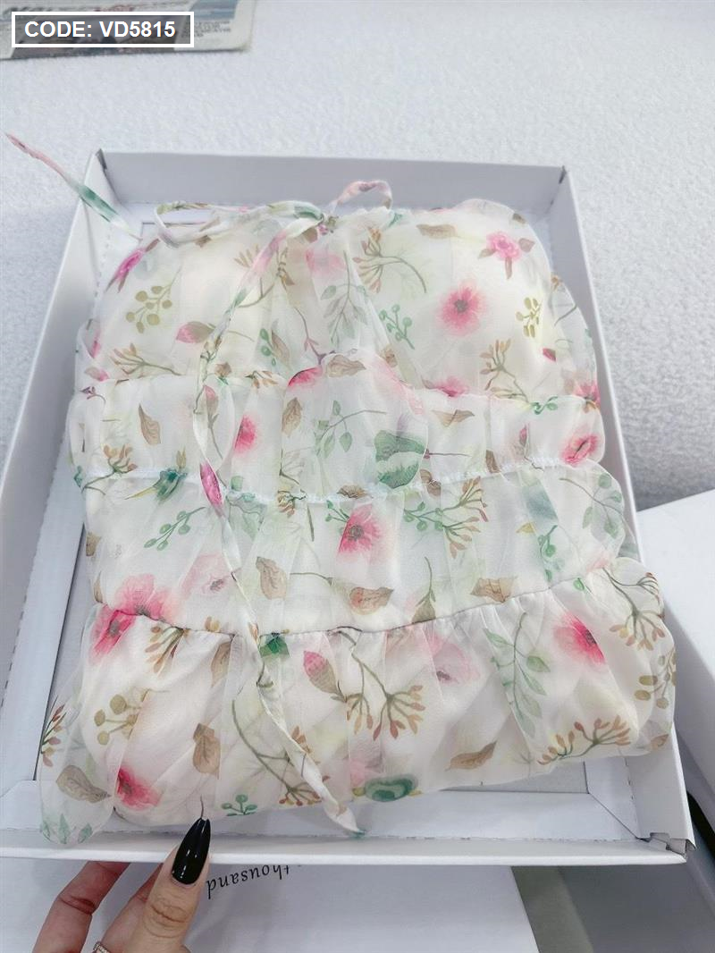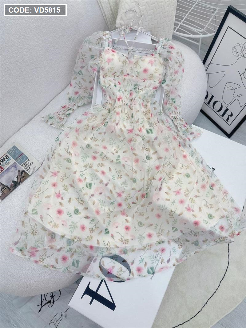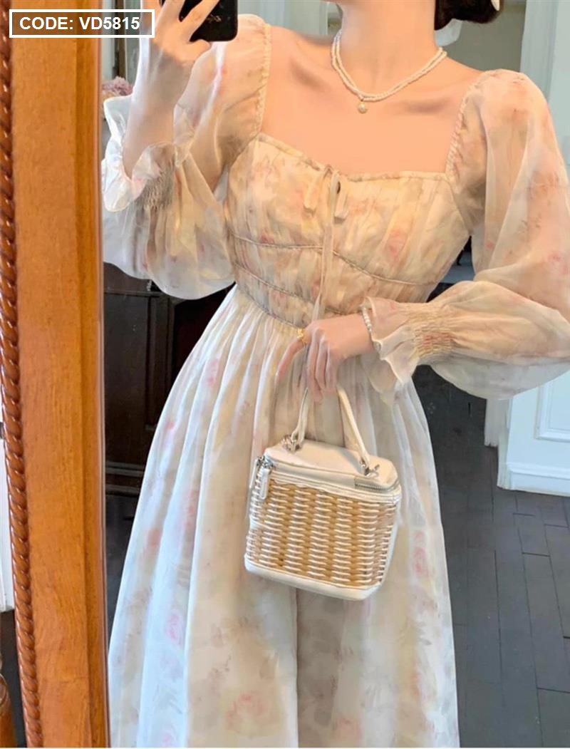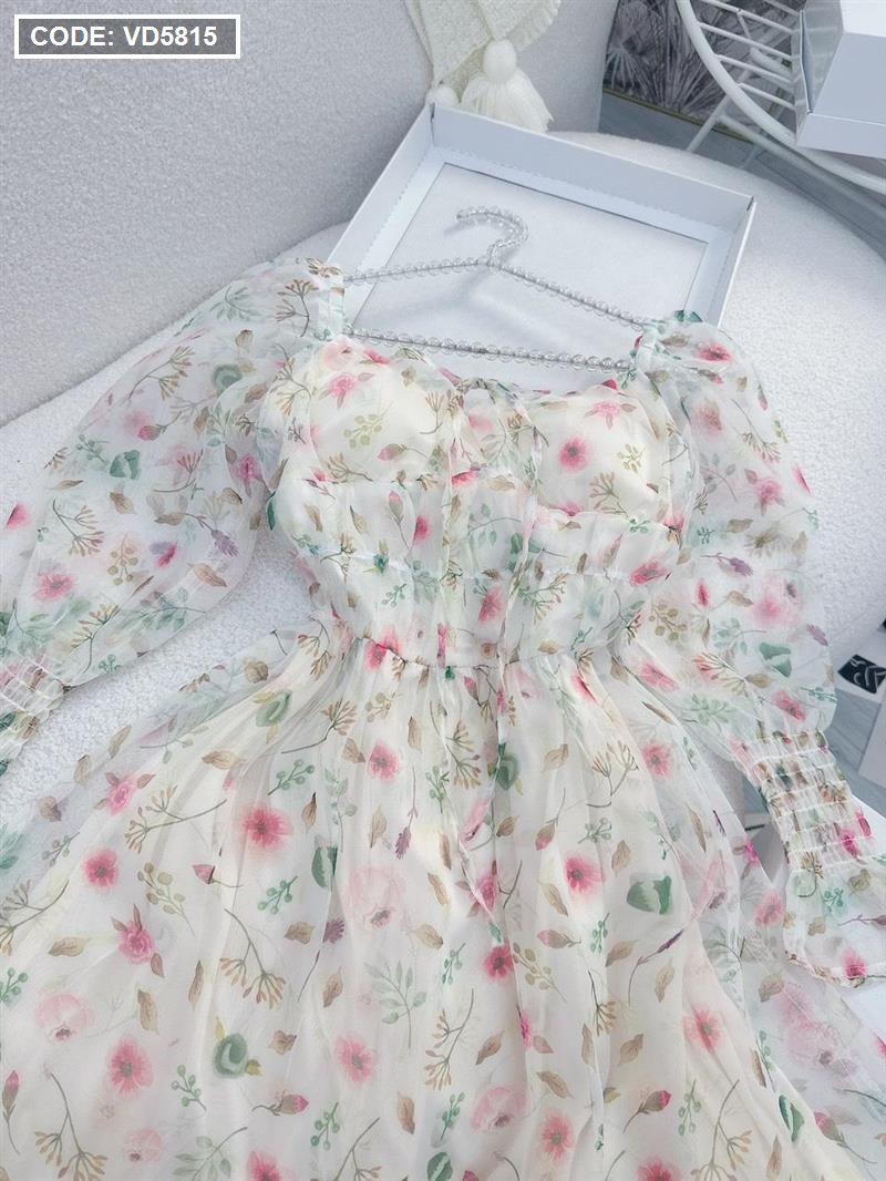 Đầm maxi voan hoa tay dài nhúng eo ngực