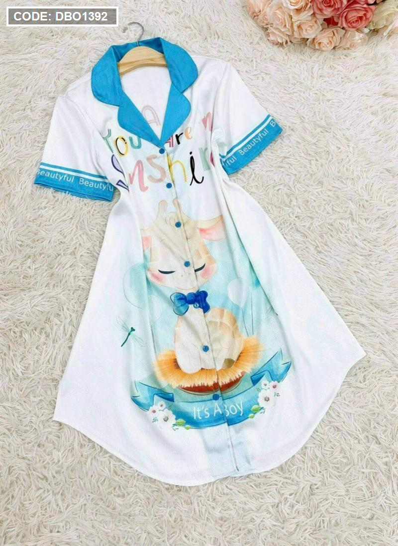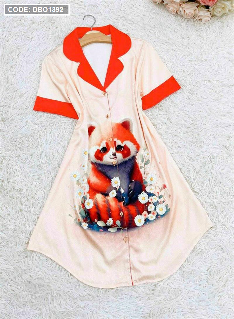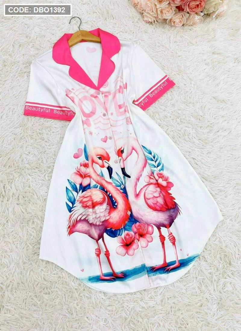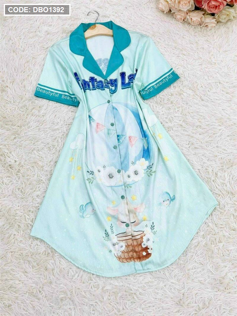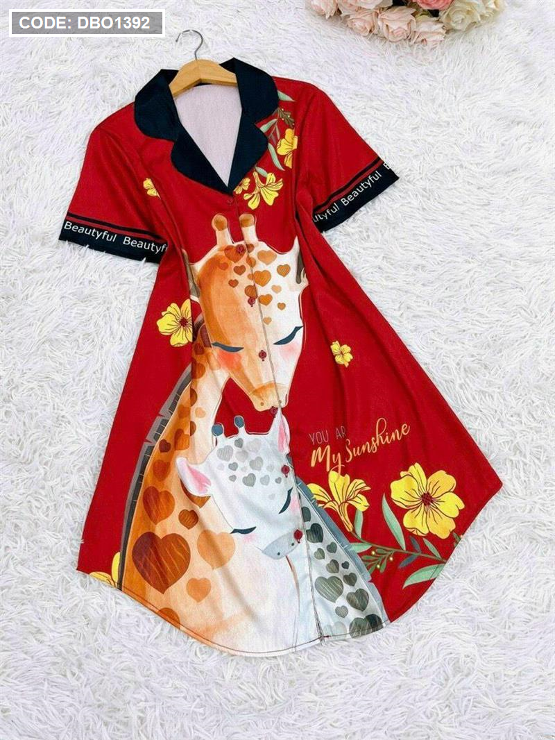 Đầm nữ satin áo cổ bẻ tay ngắn in họa tiết 3D