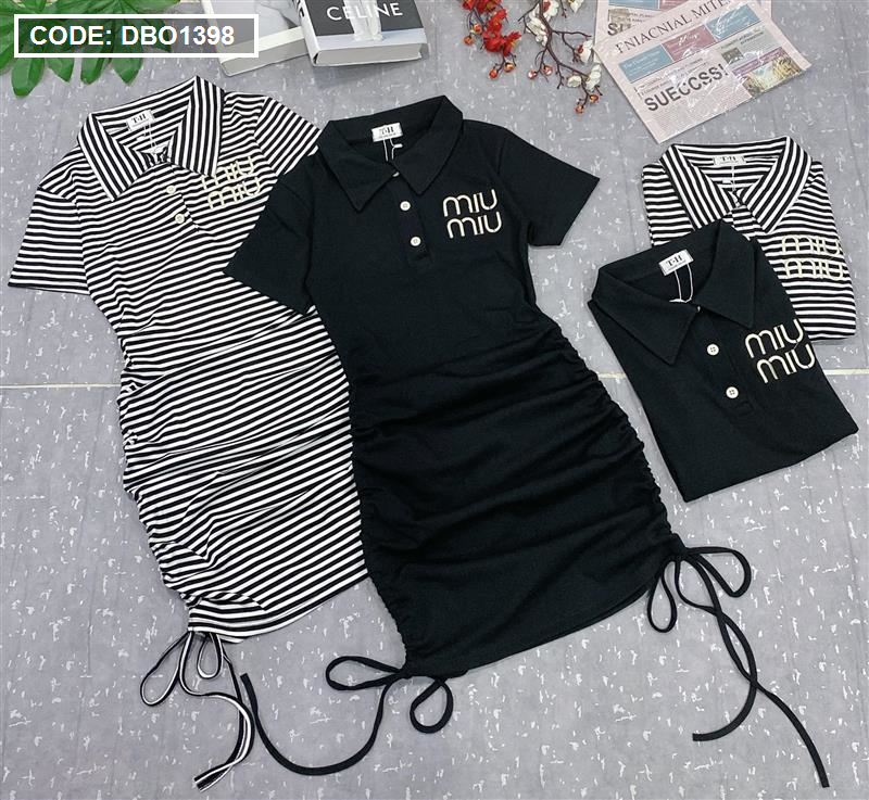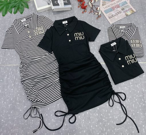 Đầm thun cotton nữ ôm dây rút 2 bên cổ bẻ in chữ miu miu