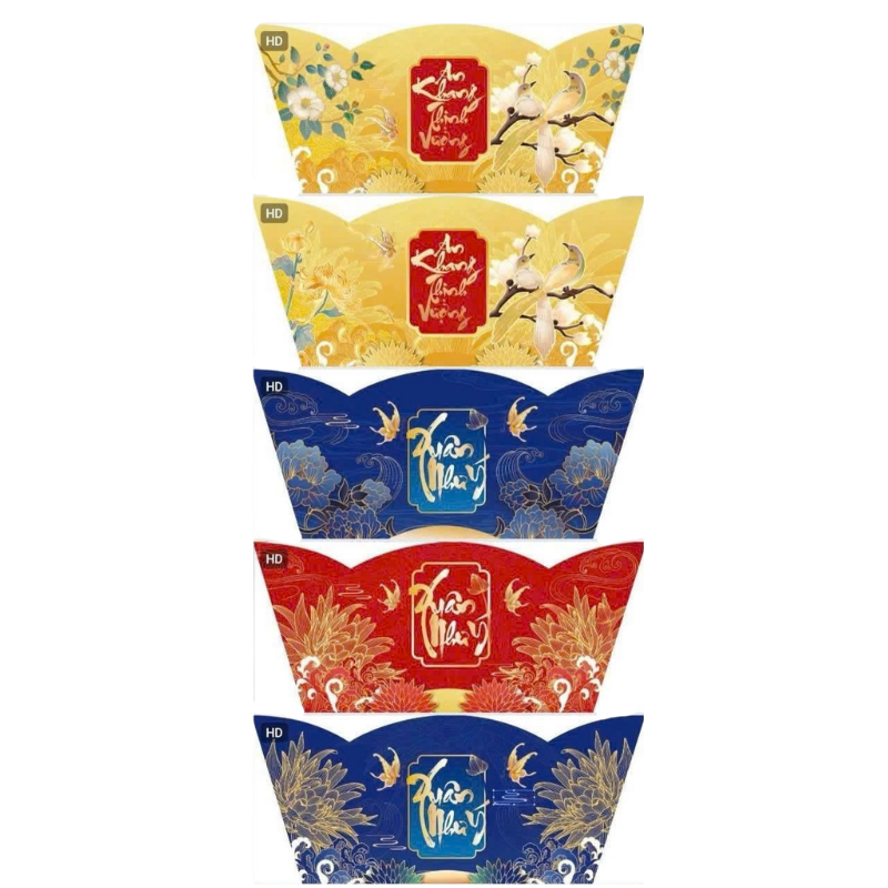 - Thiết kế hoa văn Tết truyền thống: Phúc Lộc Thọ, chim én, hoa mai – hoa đào, chữ thư pháp