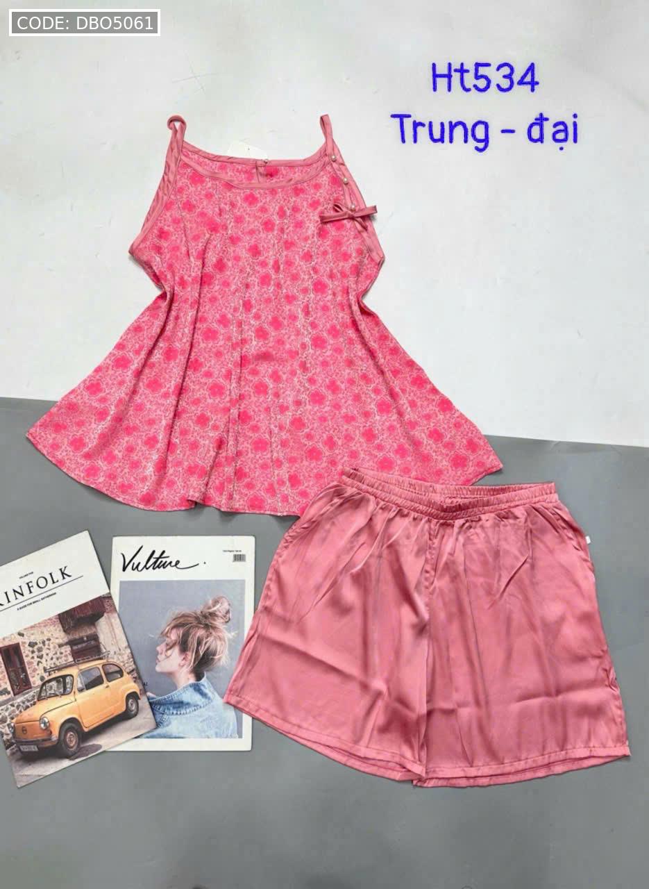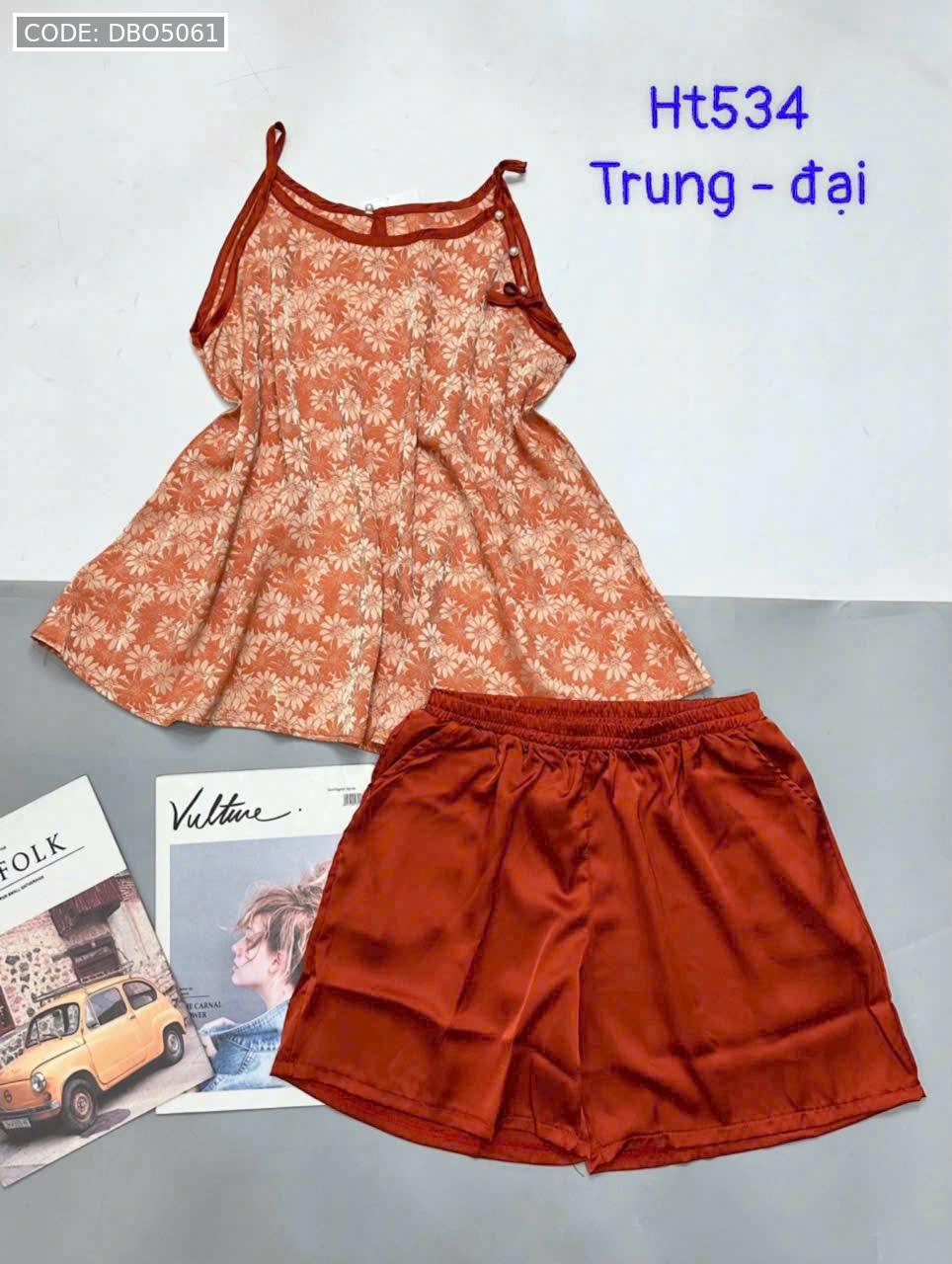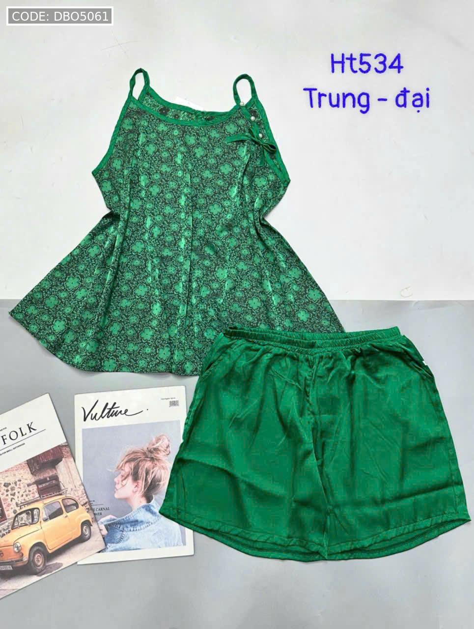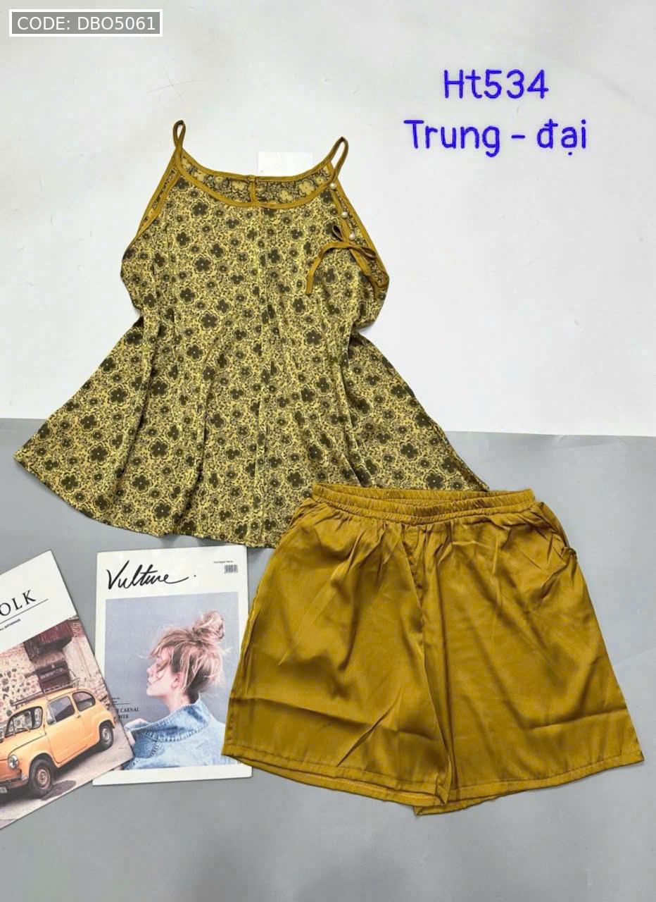 Đồ bộ gấm phối lụa mờ quần đùi trơn áo yếm 2 dây có nút trung