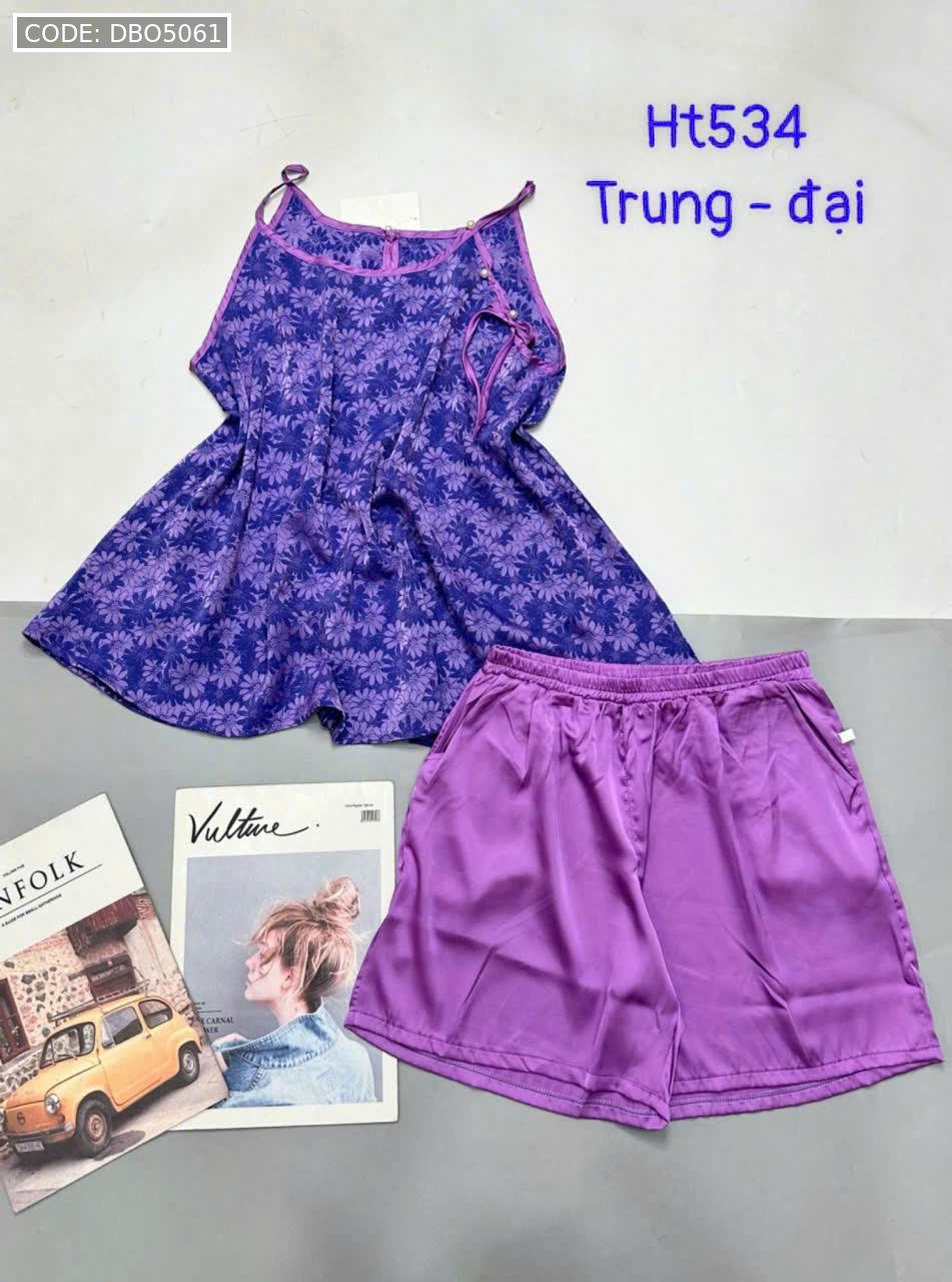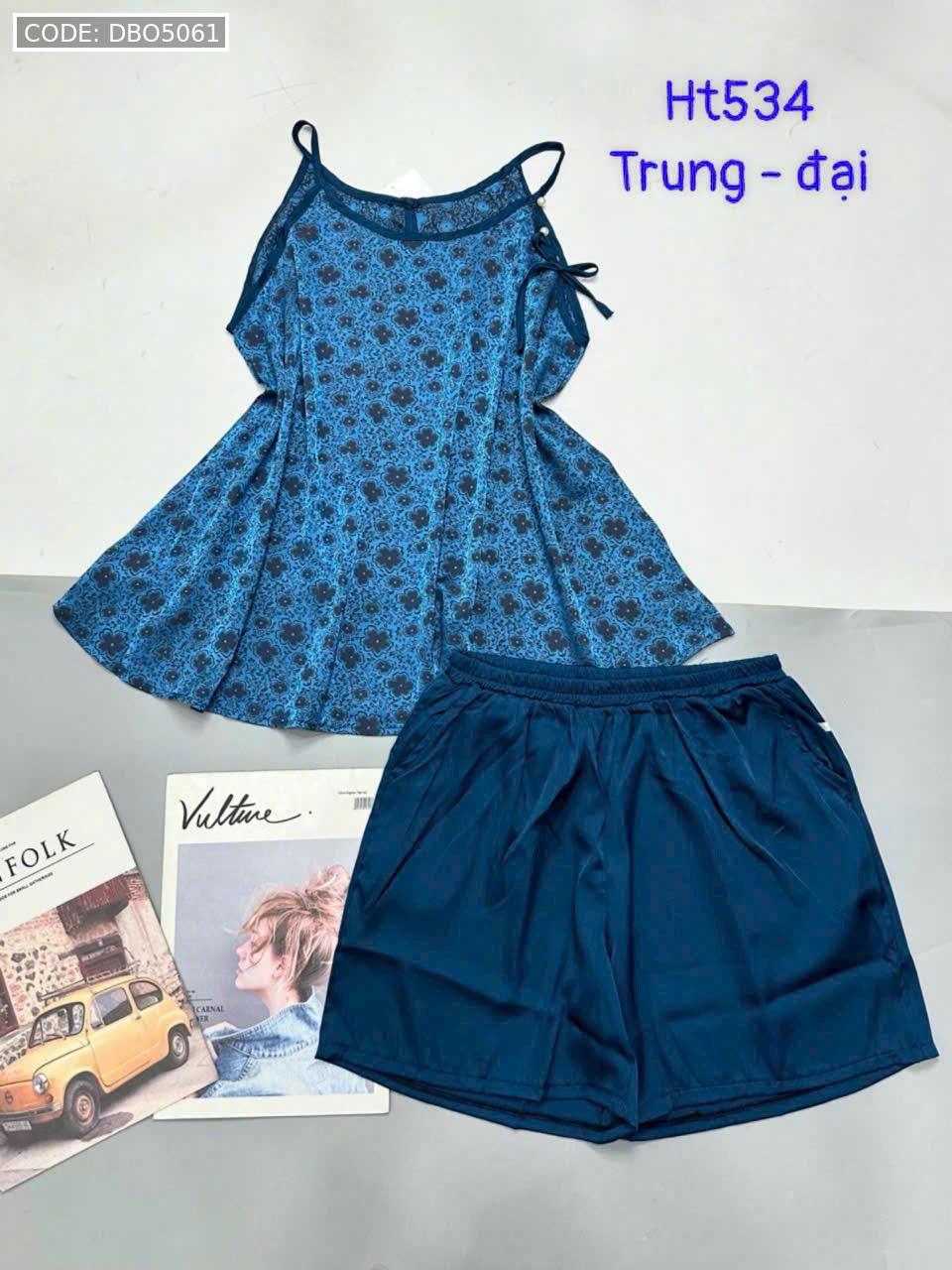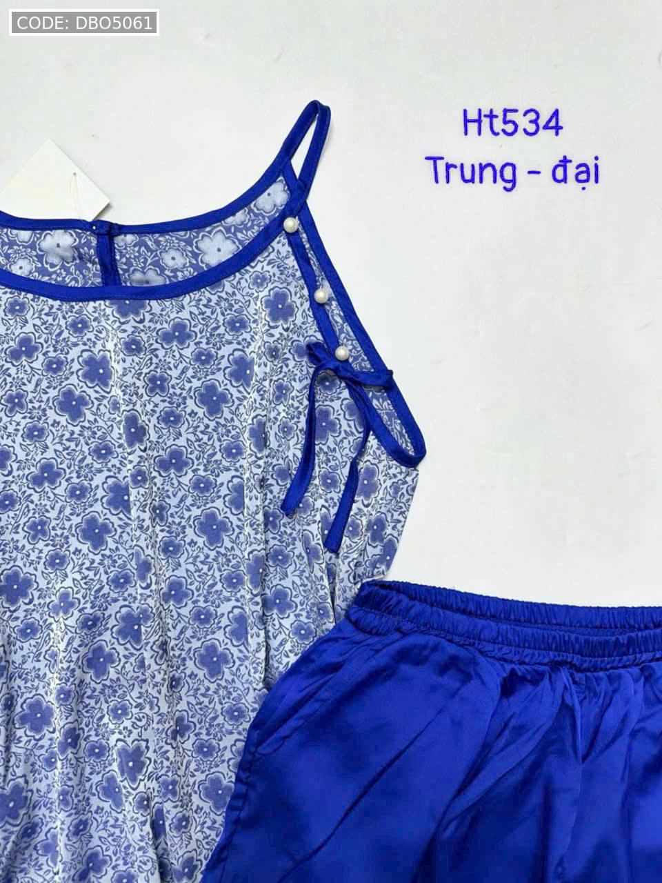 Đồ bộ gấm phối lụa mờ quần đùi trơn áo yếm 2 dây có nút trung