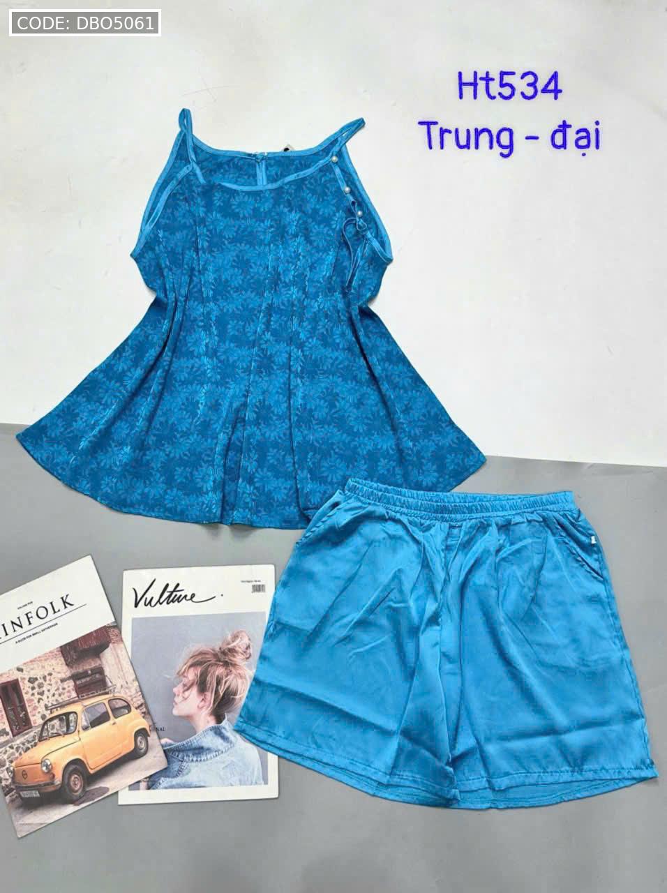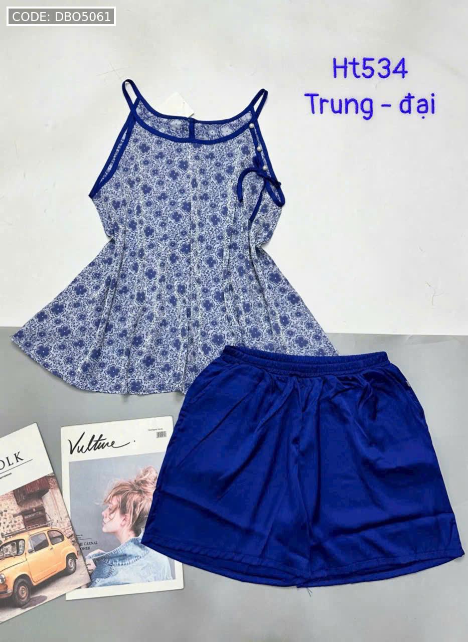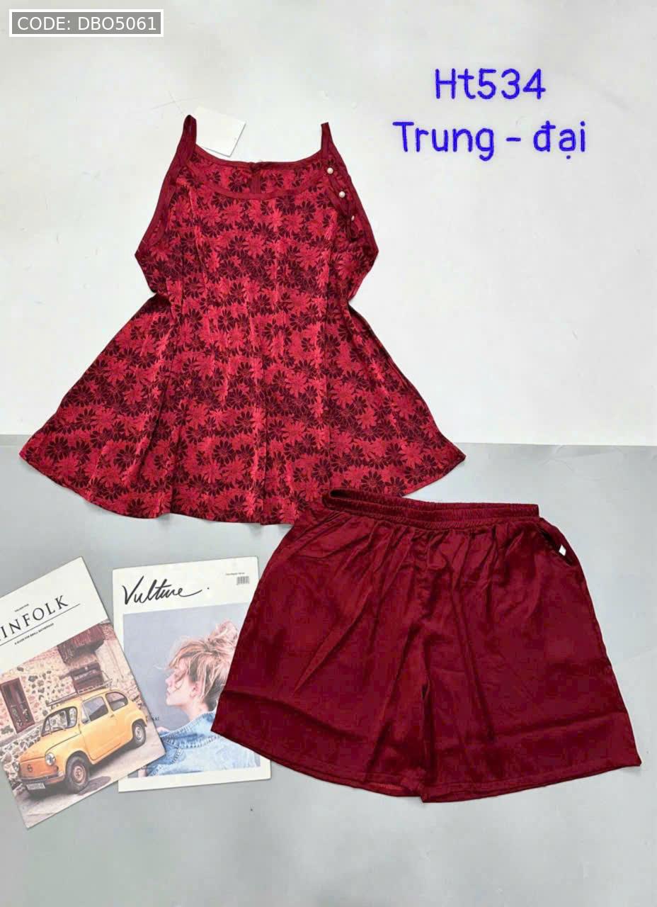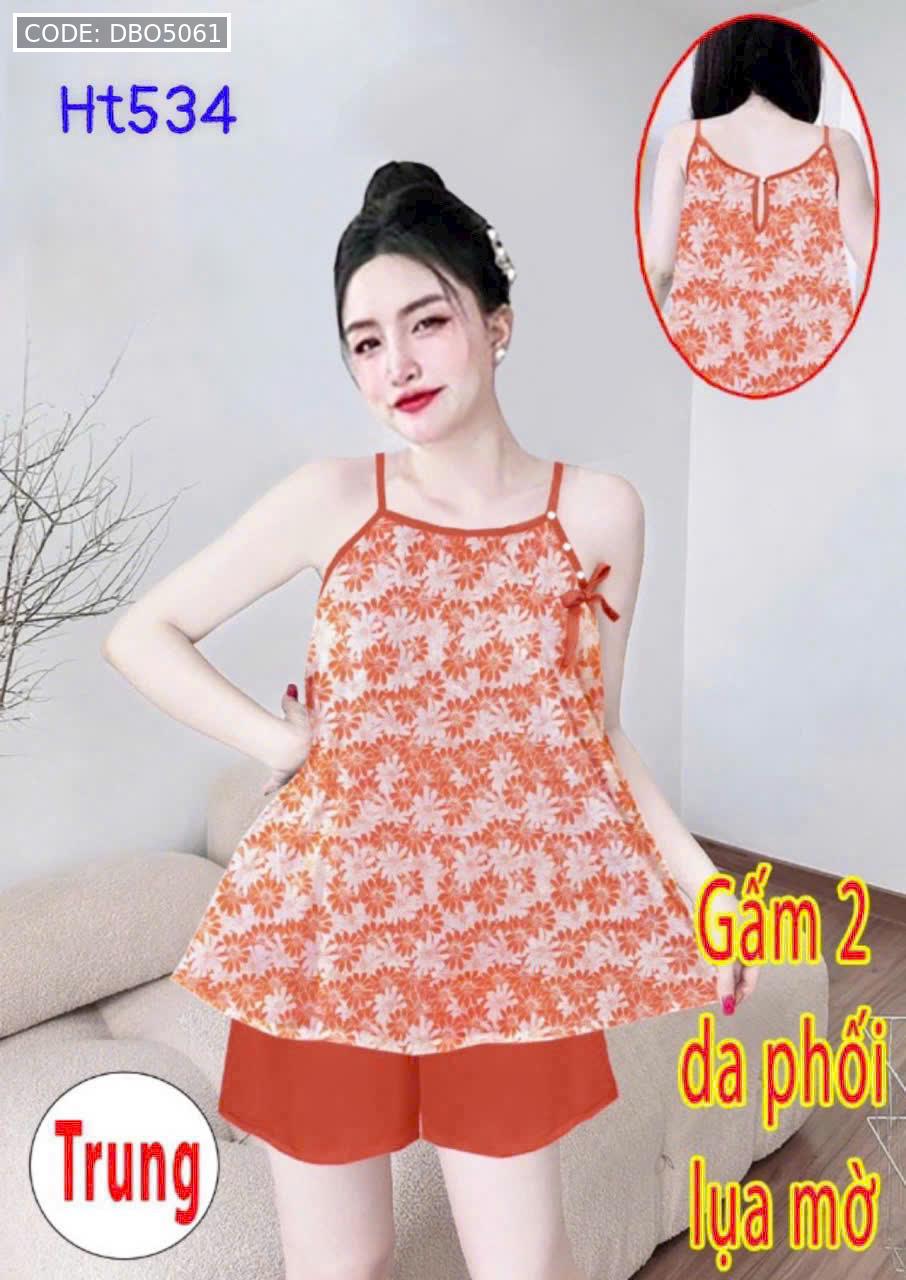 Đồ bộ gấm phối lụa mờ quần đùi trơn áo yếm 2 dây có nút trung