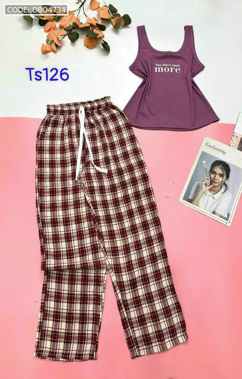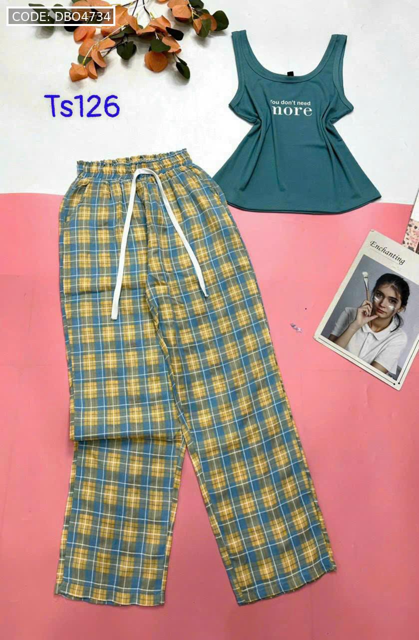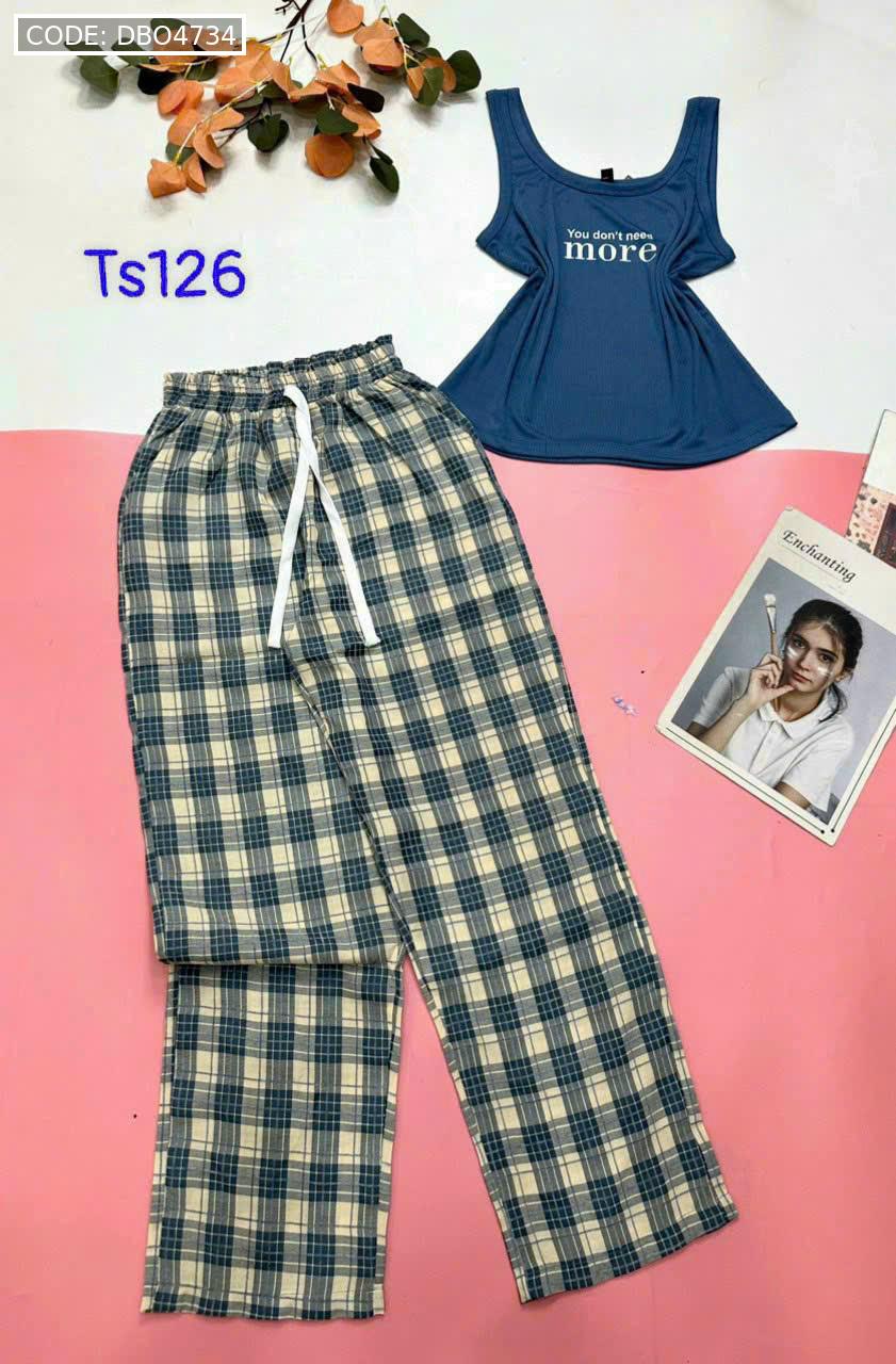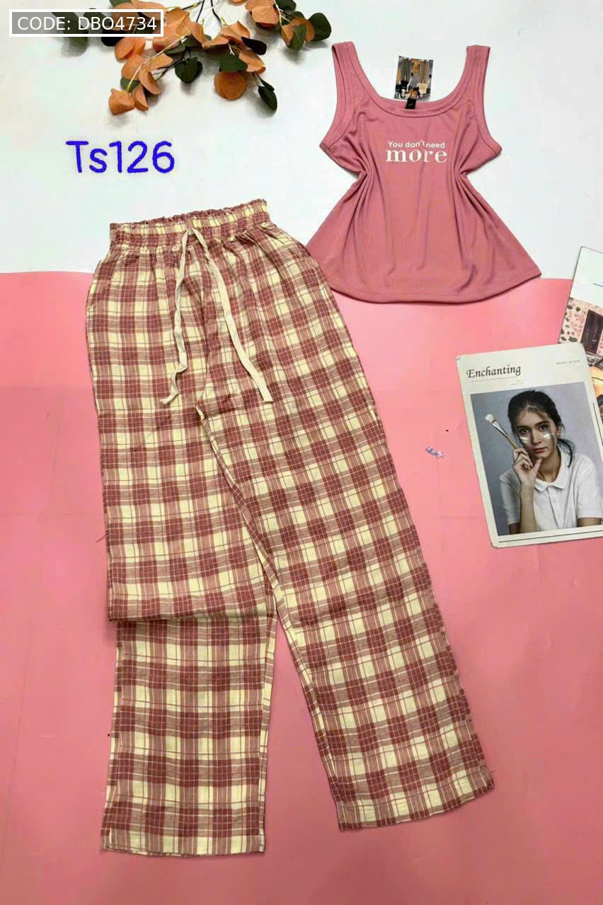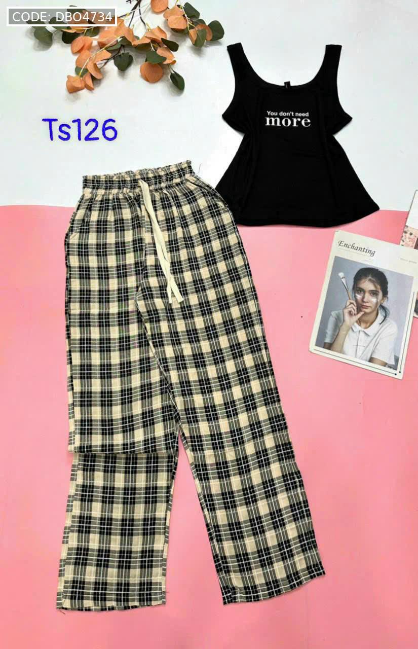 Đồ bộ mặc nhà quần dài carô áo dây bản chữ More