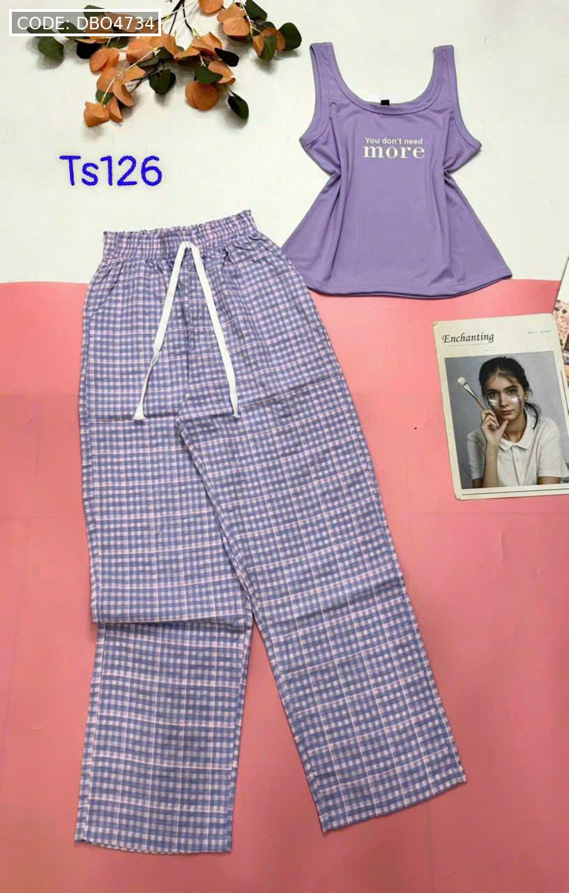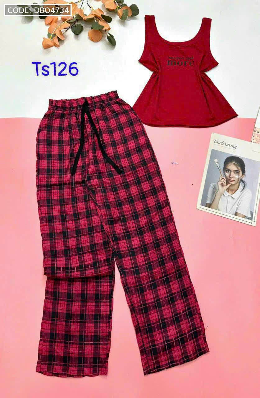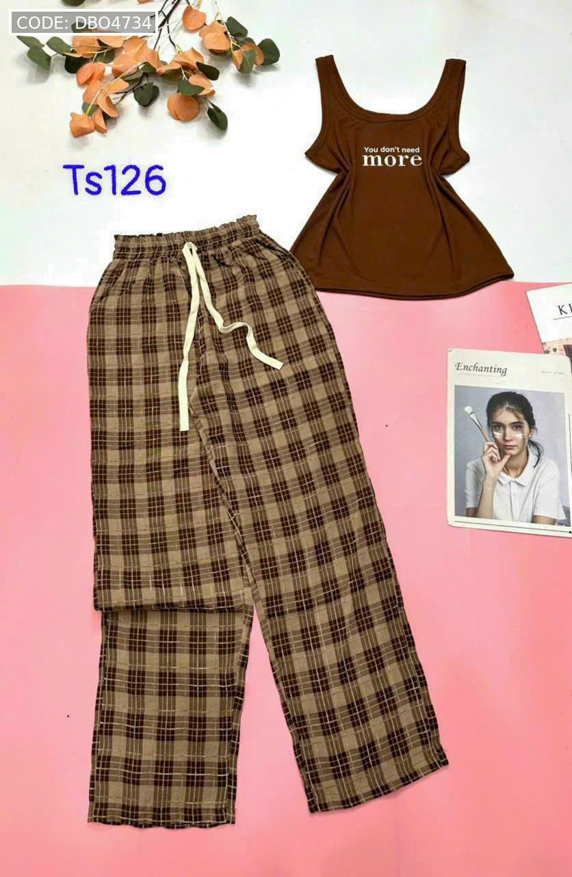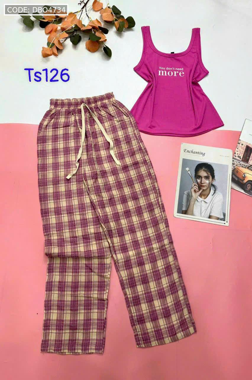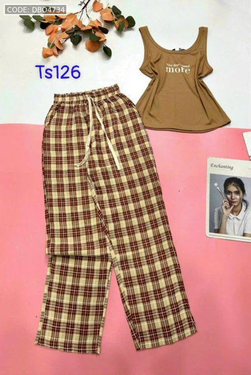 Đồ bộ mặc nhà quần dài carô áo dây bản chữ More