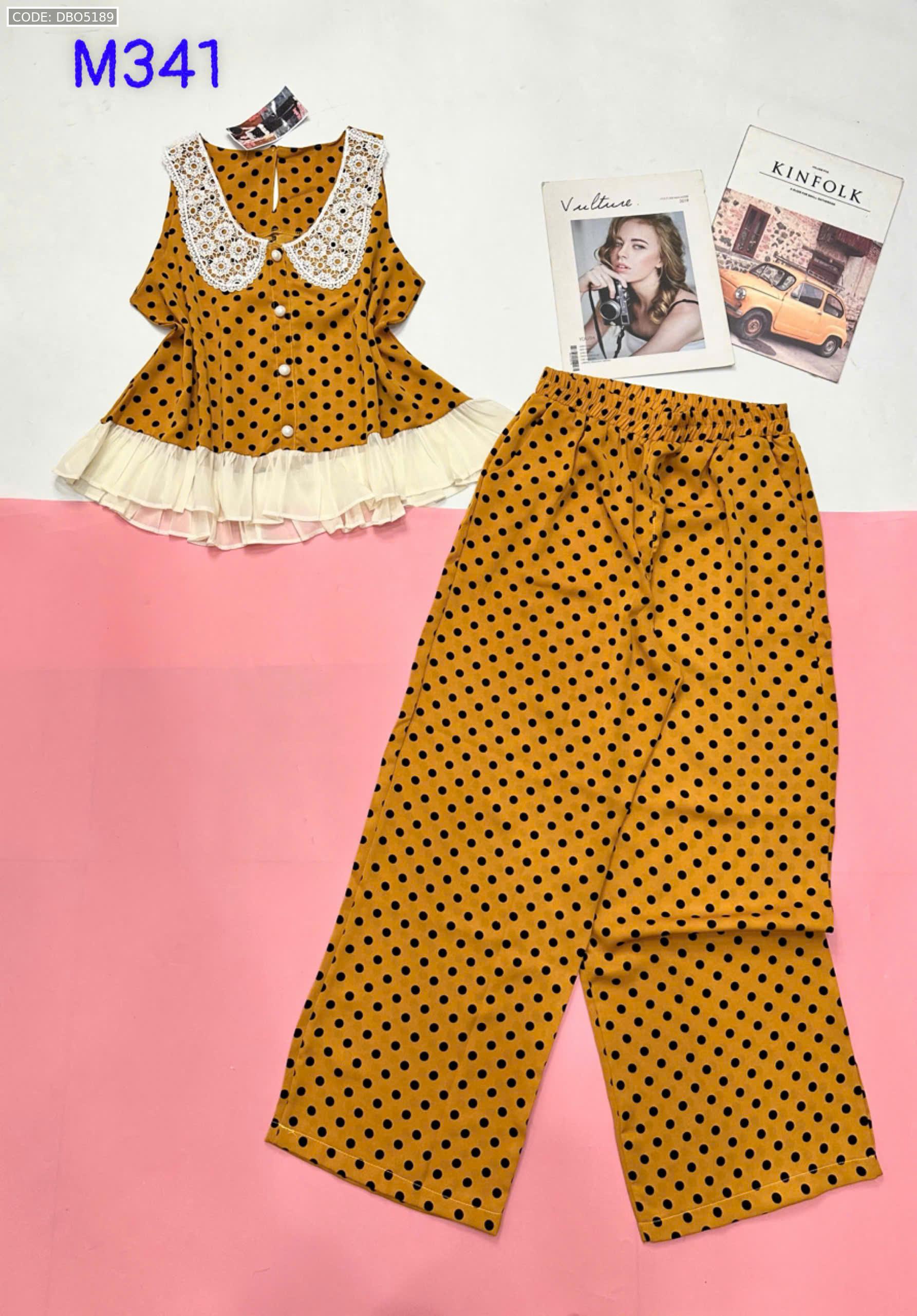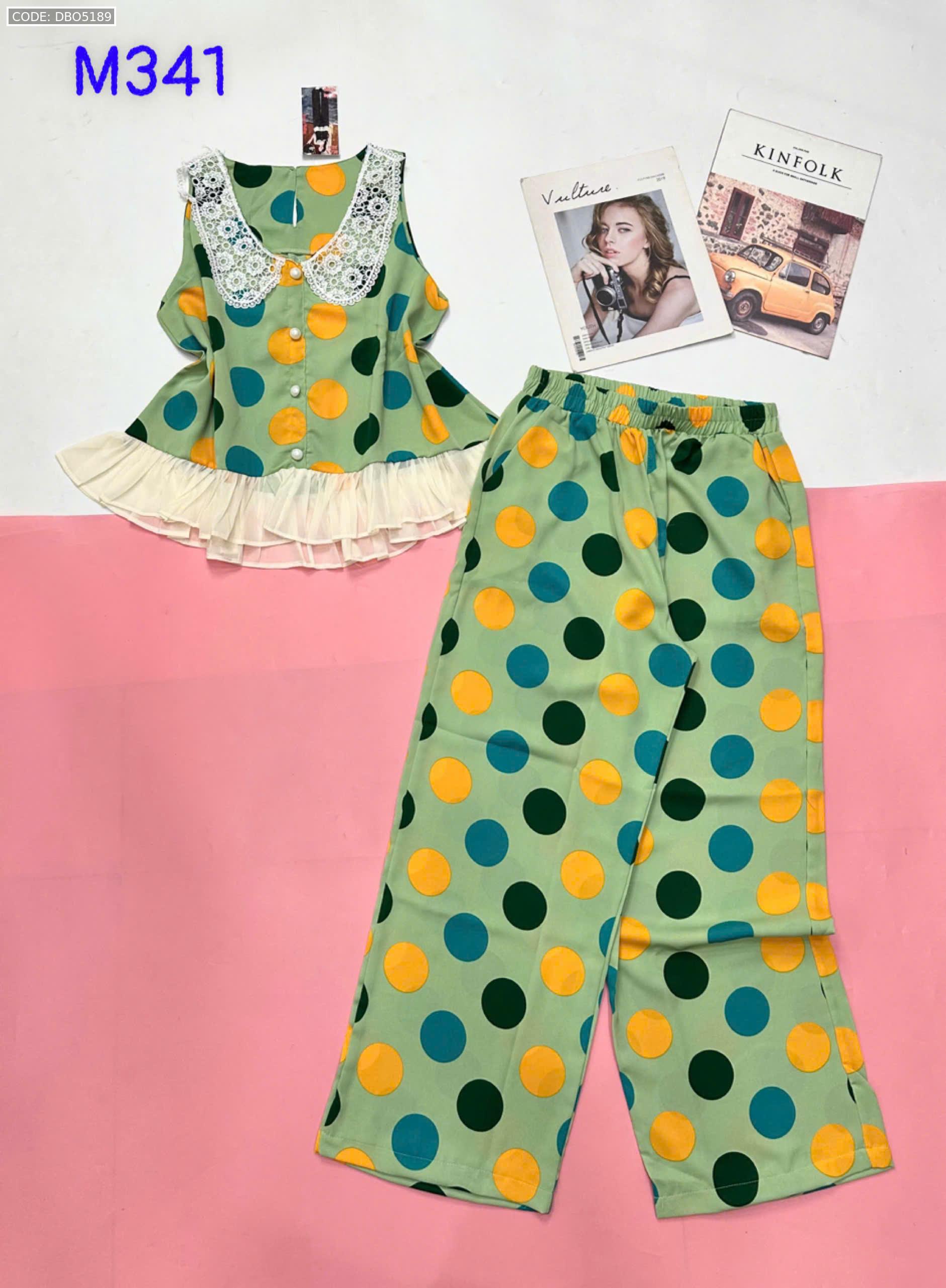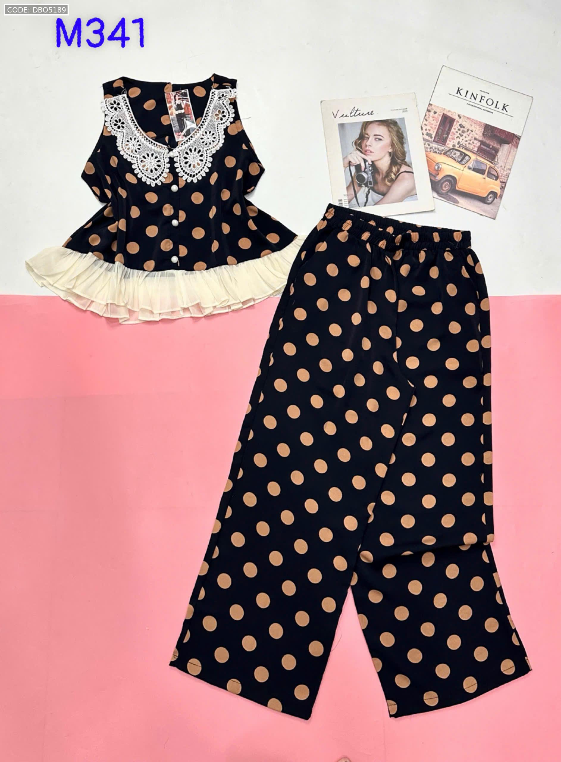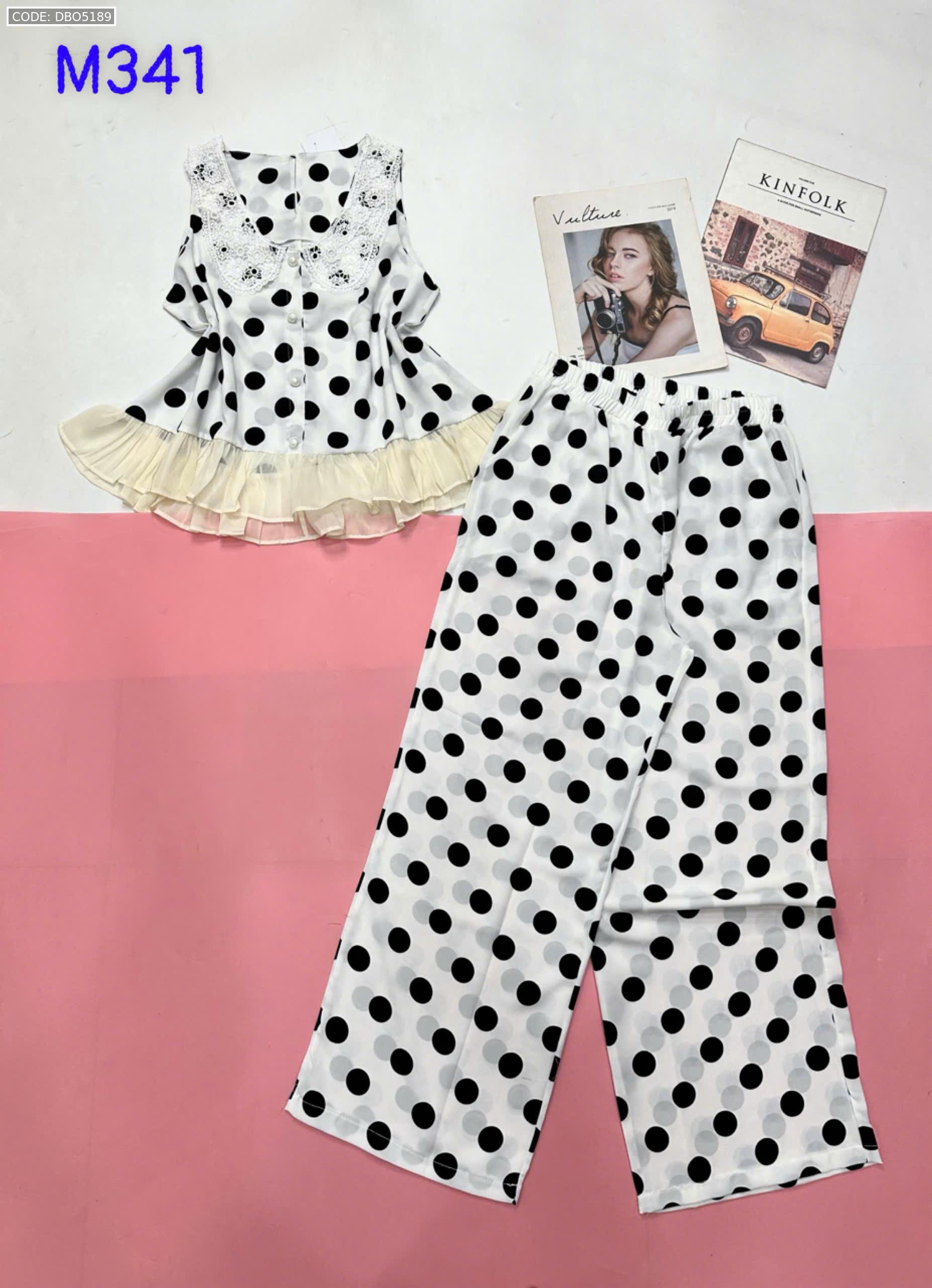 Đồ bộ mango áo ba lỗ cổ bèo ren quần ống rộng in chấm bi