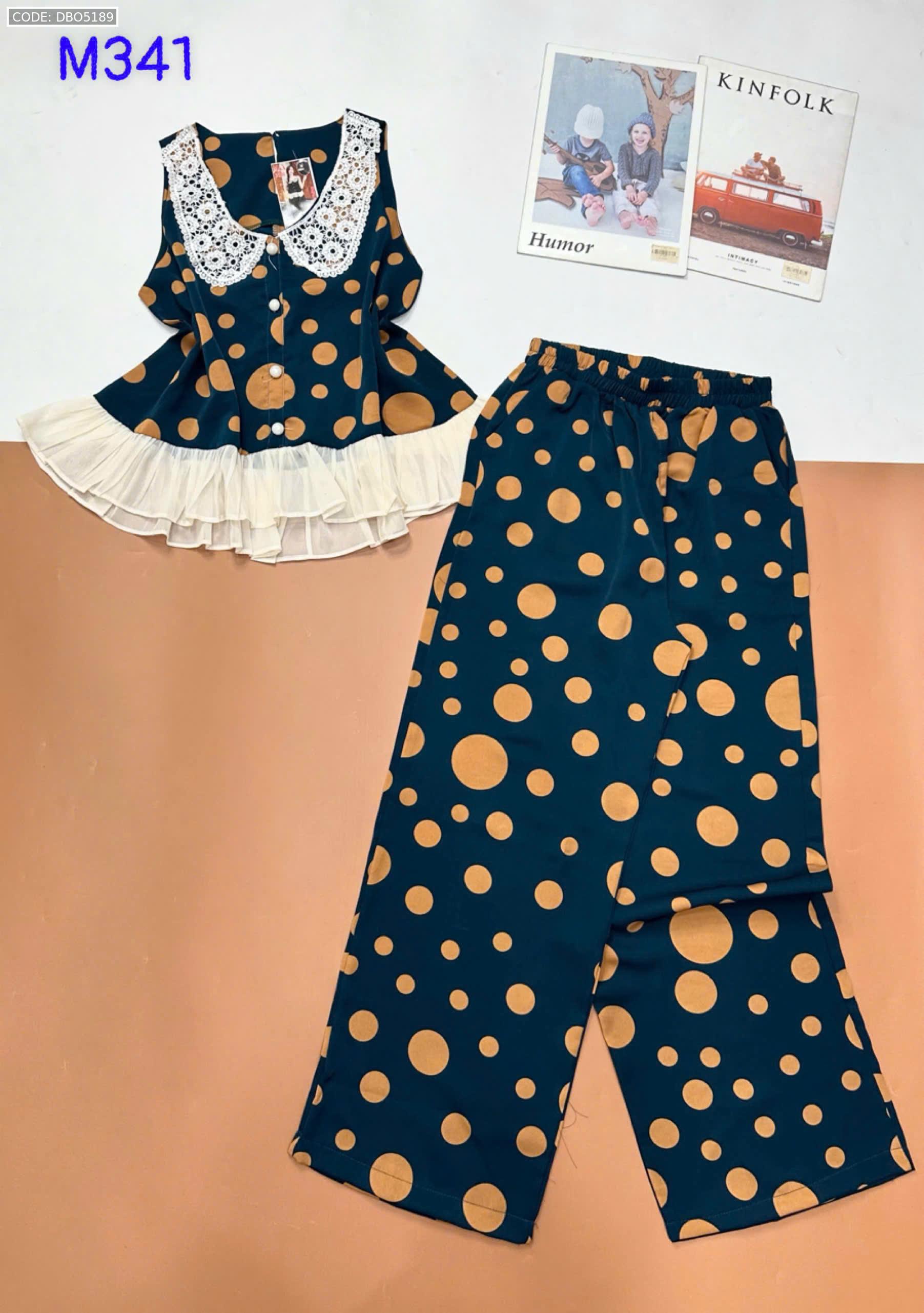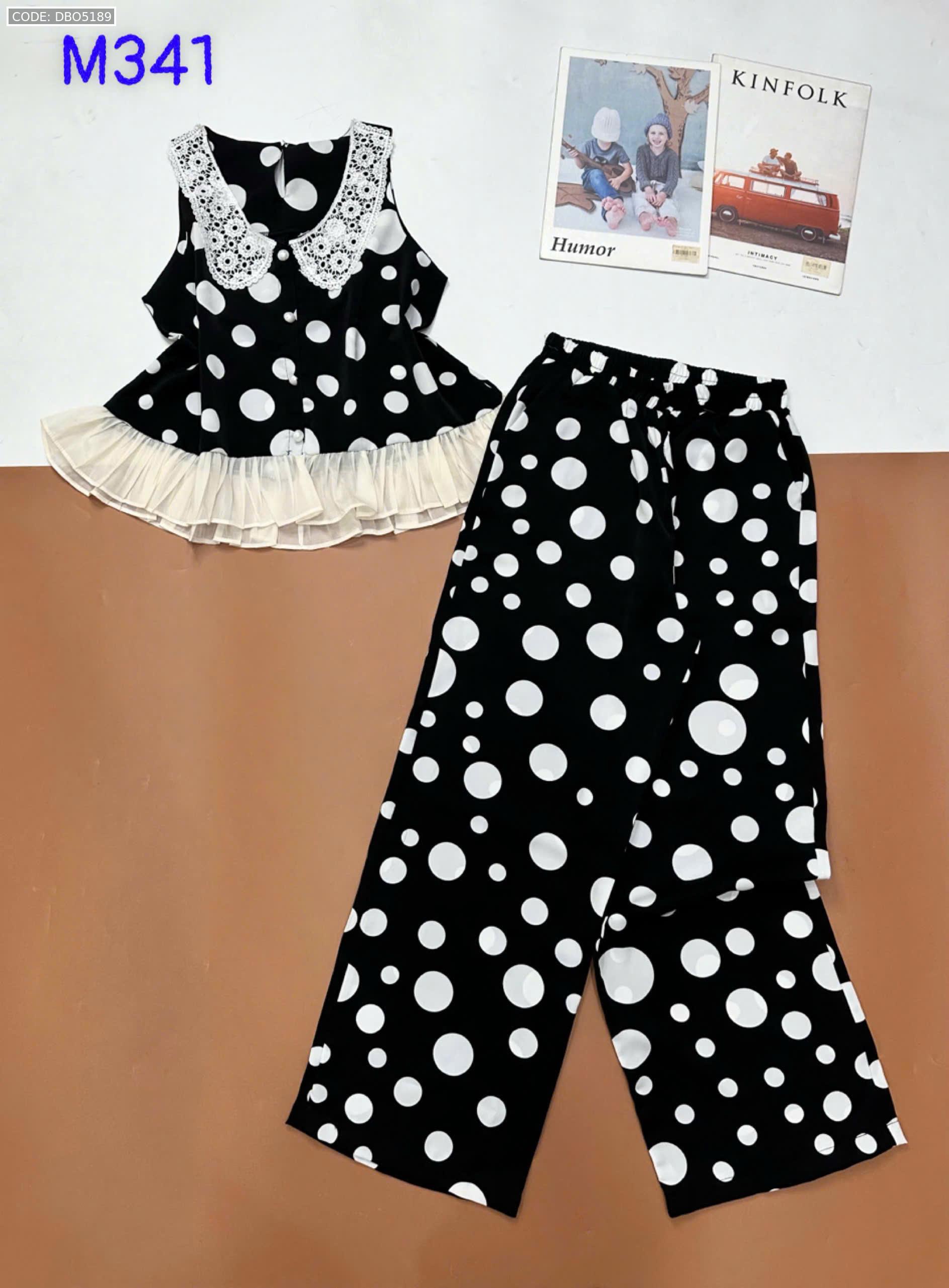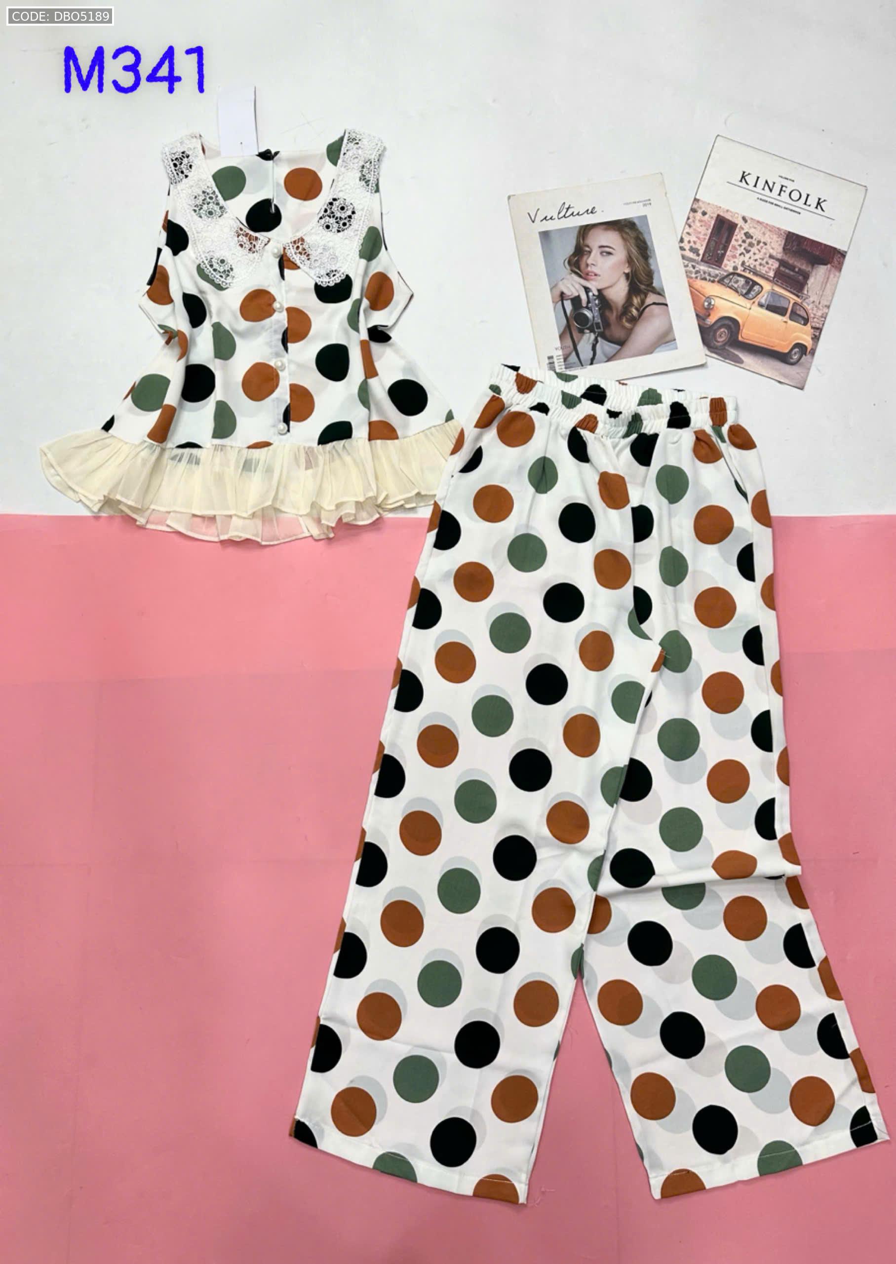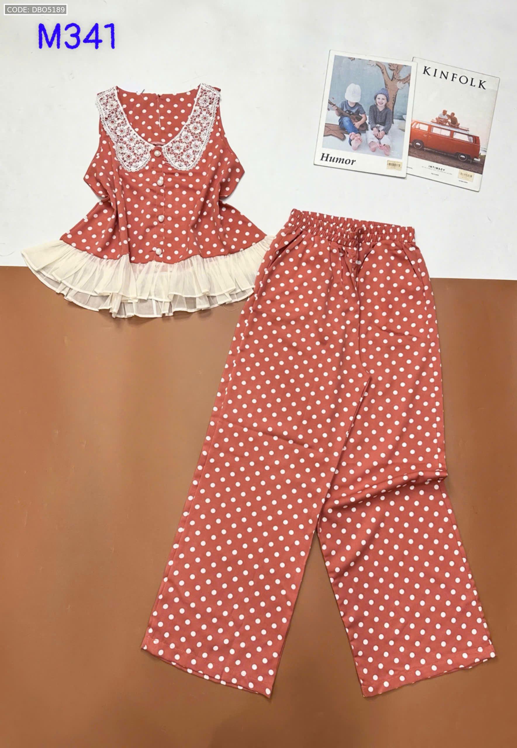 Đồ bộ mango áo ba lỗ cổ bèo ren quần ống rộng in chấm bi