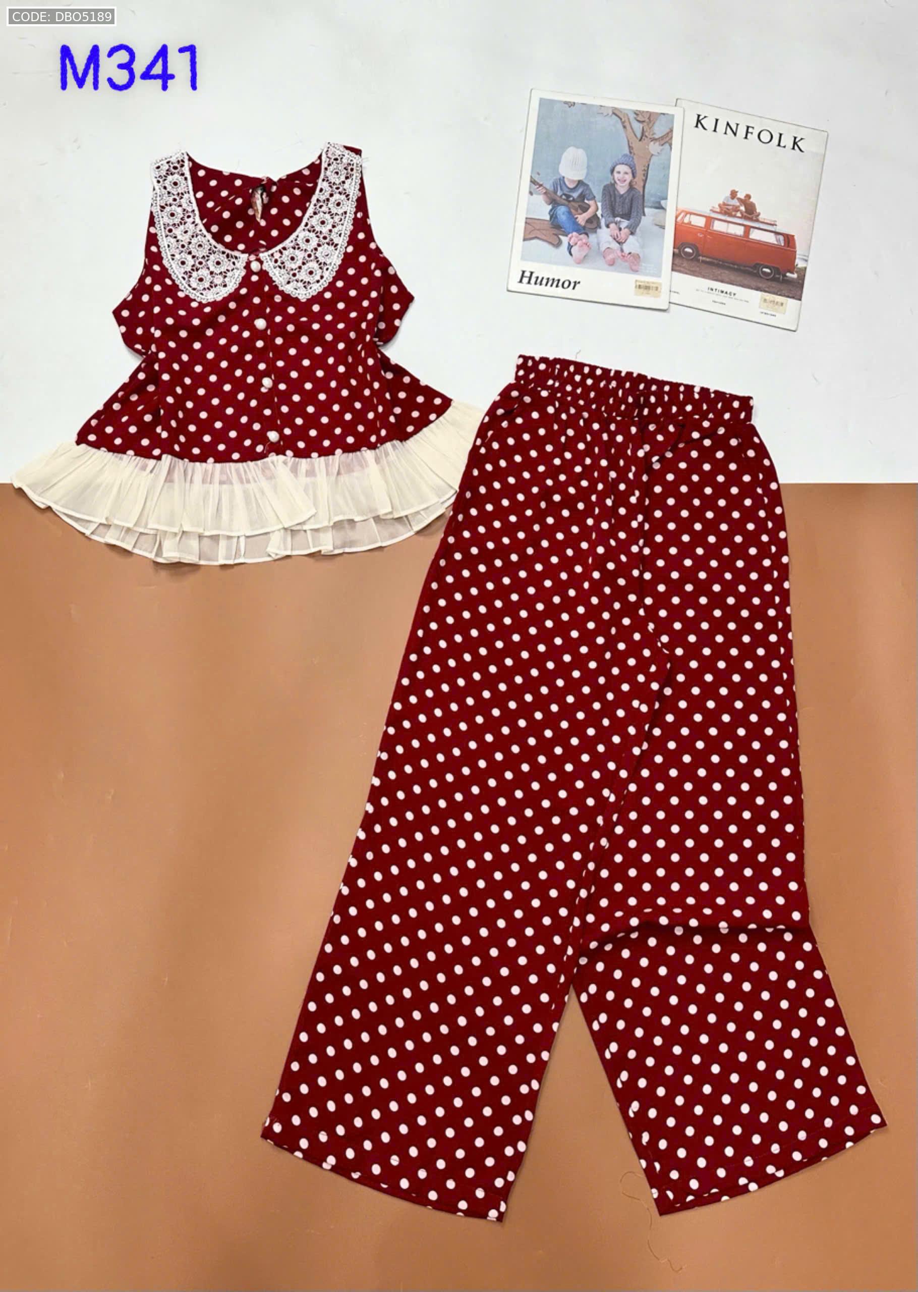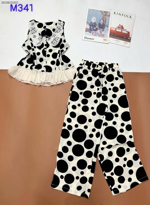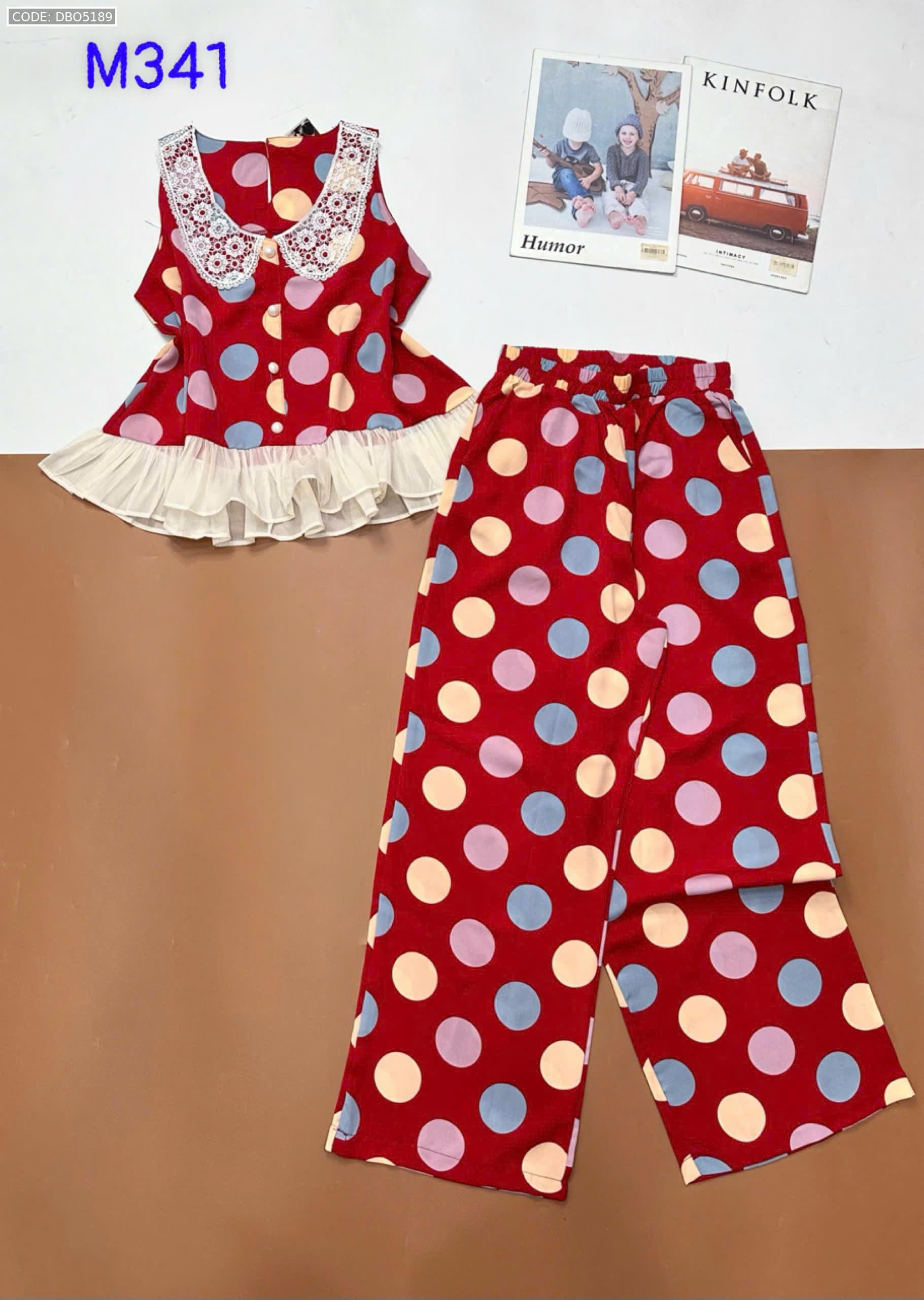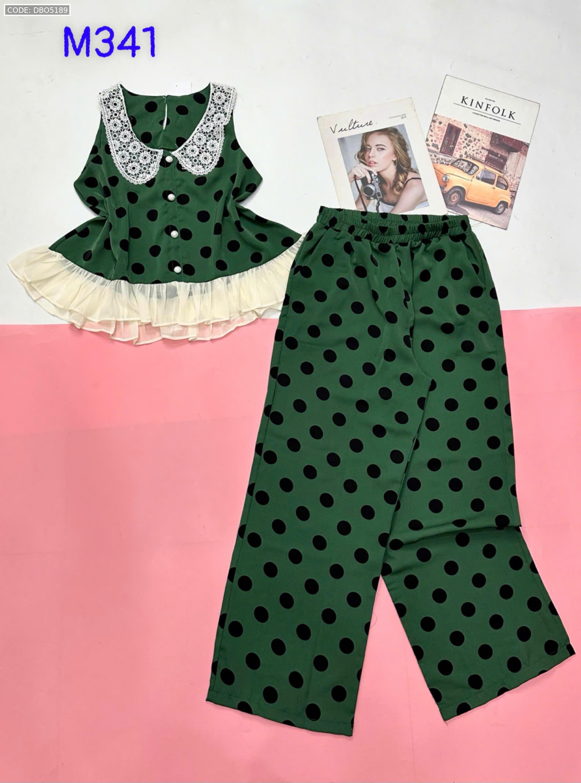 Đồ bộ mango áo ba lỗ cổ bèo ren quần ống rộng in chấm bi
