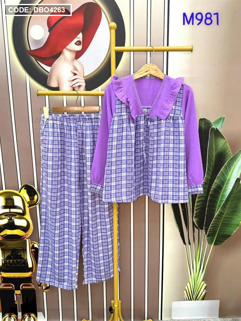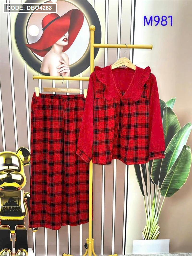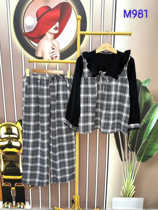 Đồ bộ mango quần dài áo tay dài cổ V bèo caro
