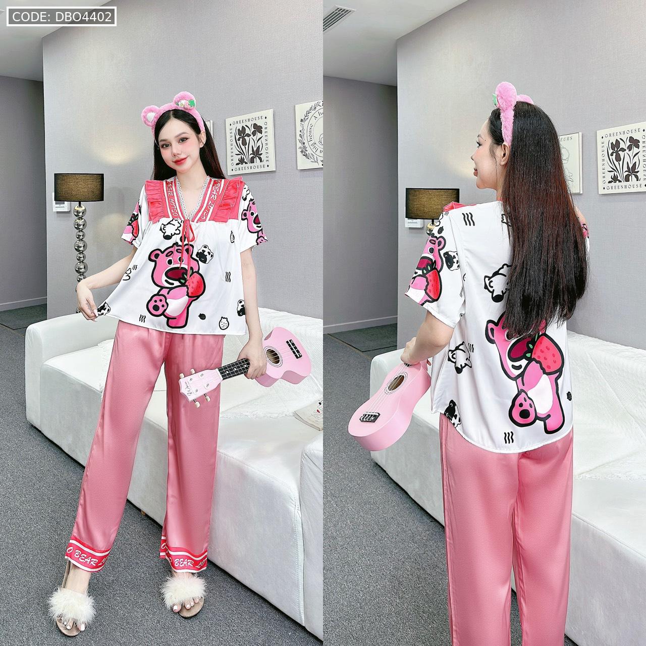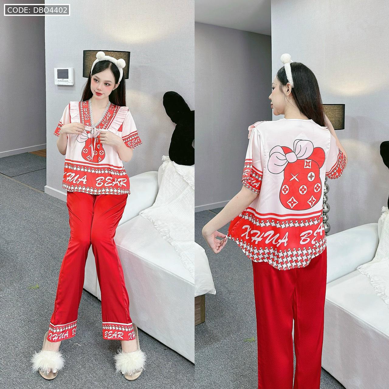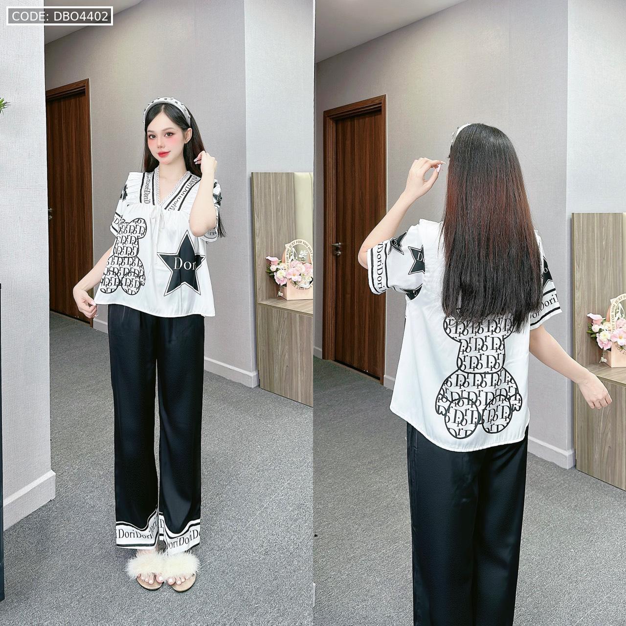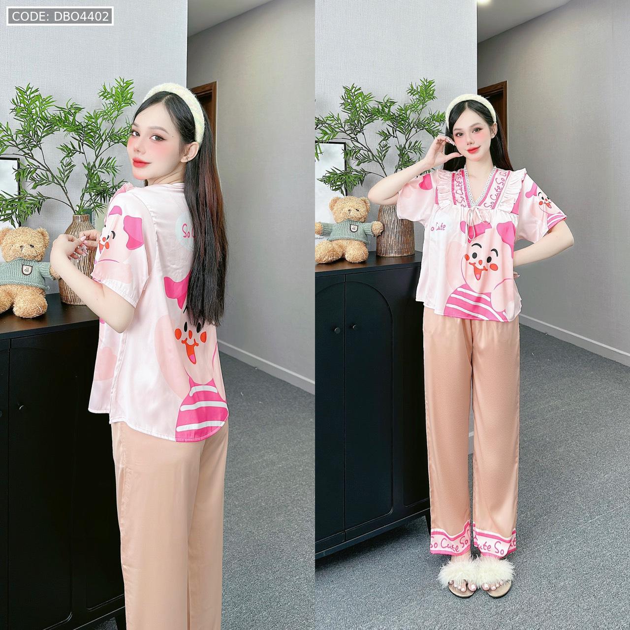 Đồ bộ pijama latin mặc nhà quần dài áo tay ngắn cổ chữ v in hình