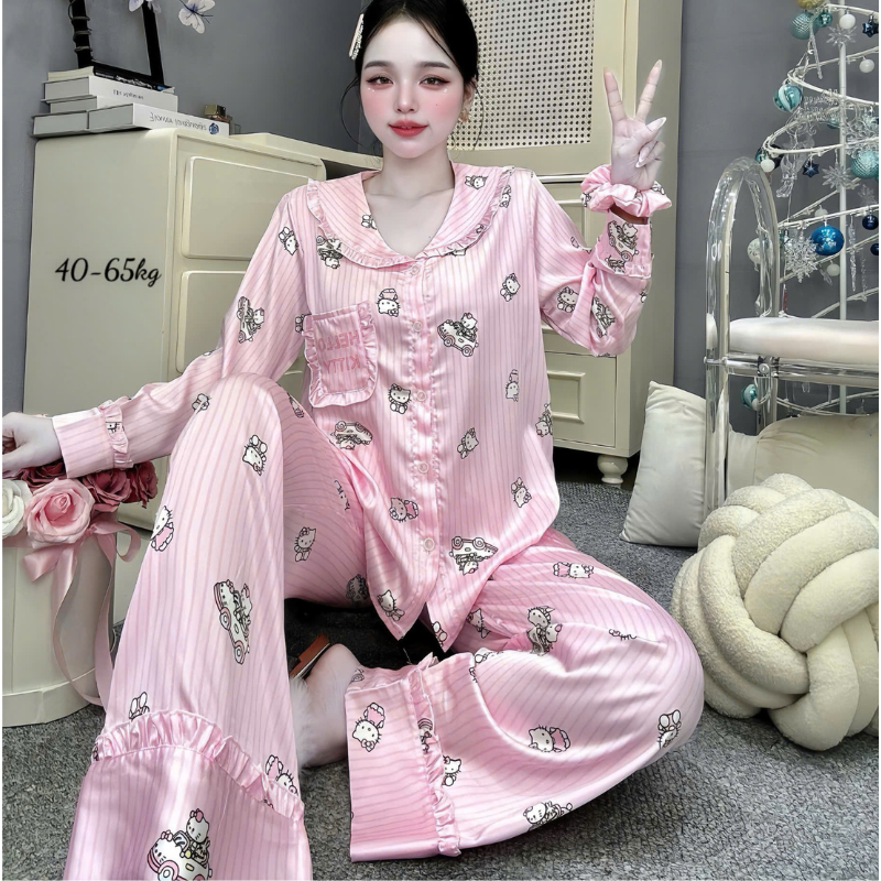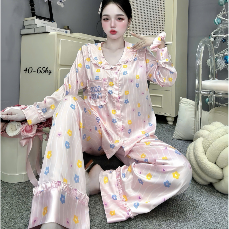 Đồ Bộ Pijama Nữ – Đồ Bộ Tay Dài Quần Dài Viền Bèo Họa Tiết Nhí Size 40-65kg