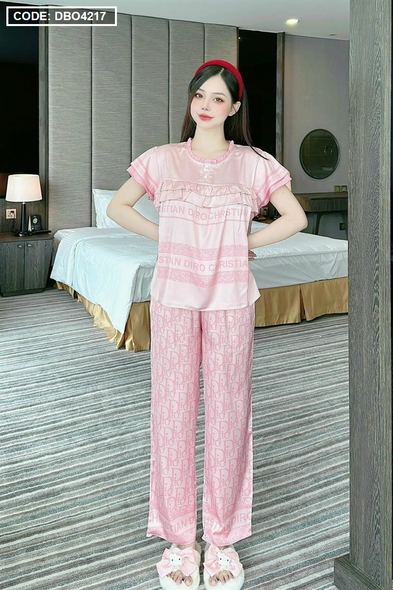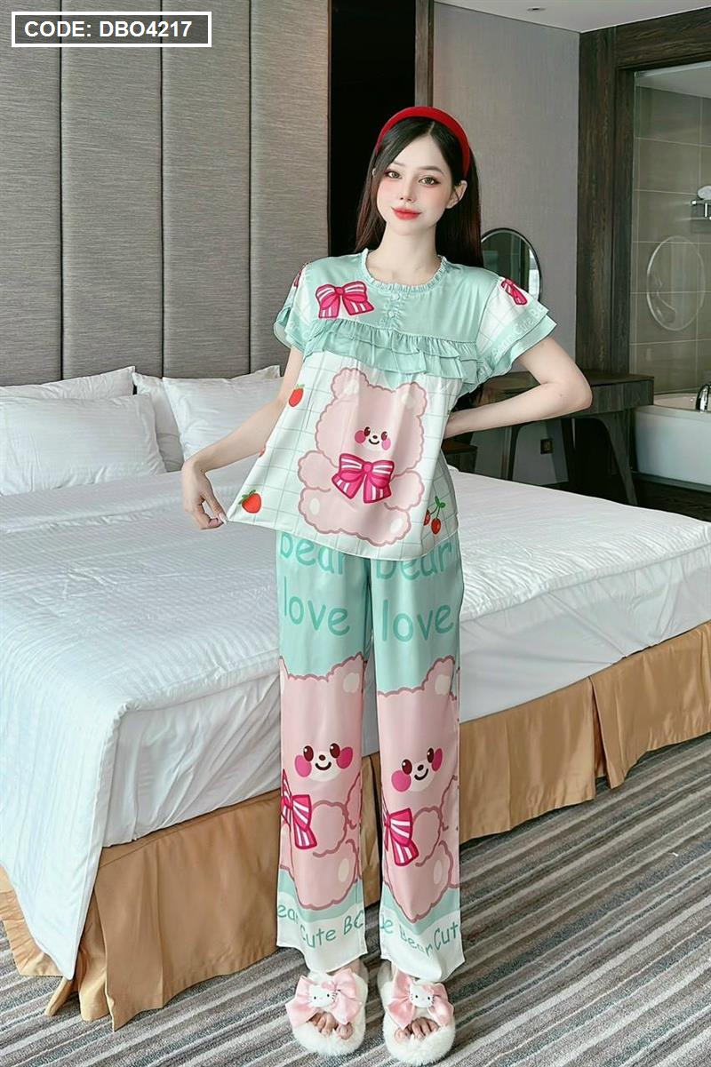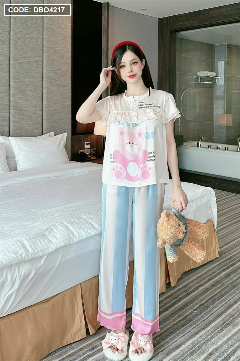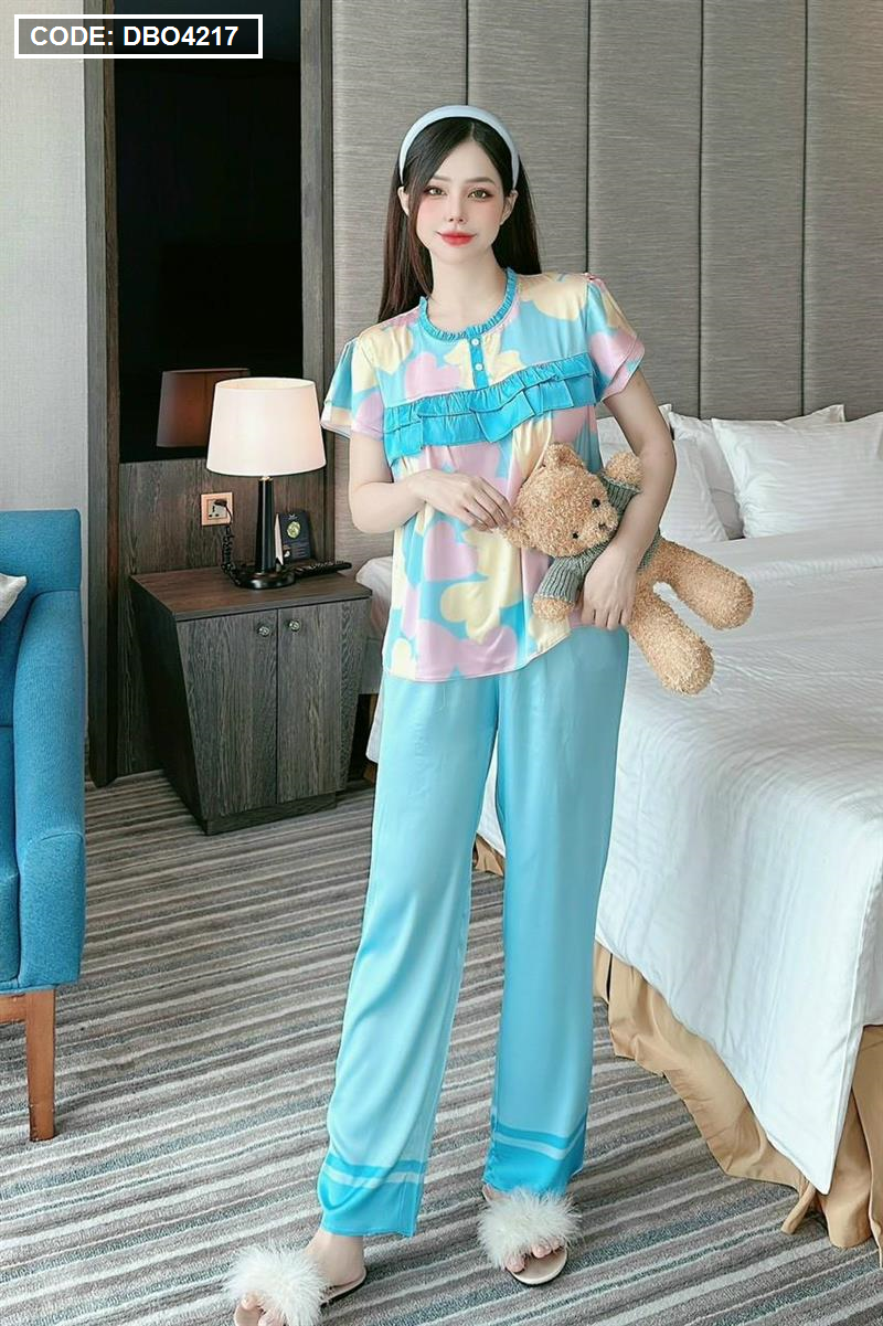 Đồ bộ pijama quần dài áo tay ngắn cổ tròn viền nhún in hoạ tiết