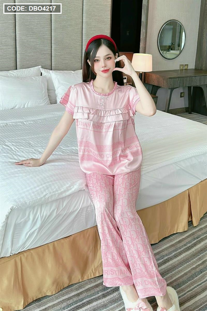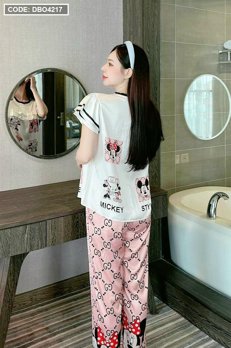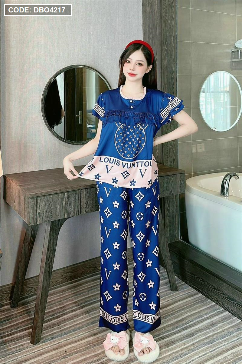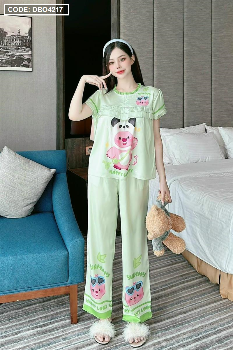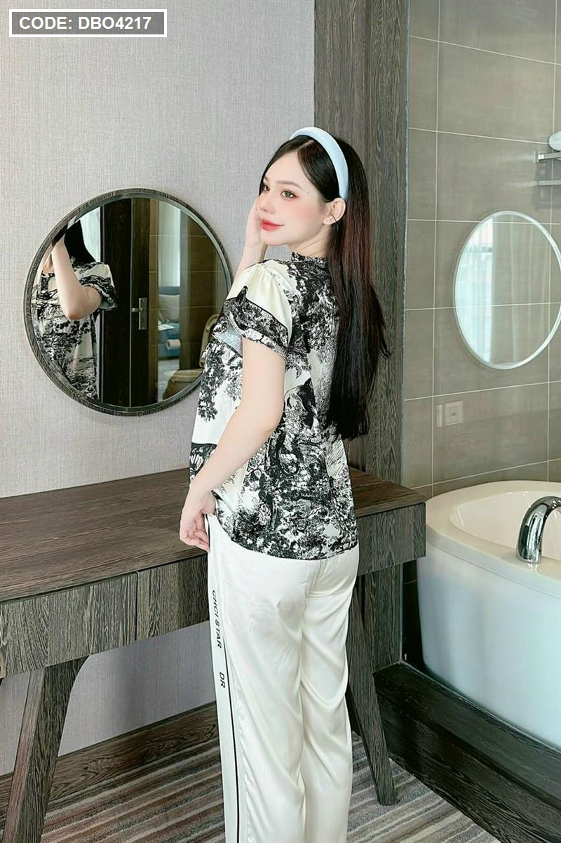 Đồ bộ pijama quần dài áo tay ngắn cổ tròn viền nhún in hoạ tiết