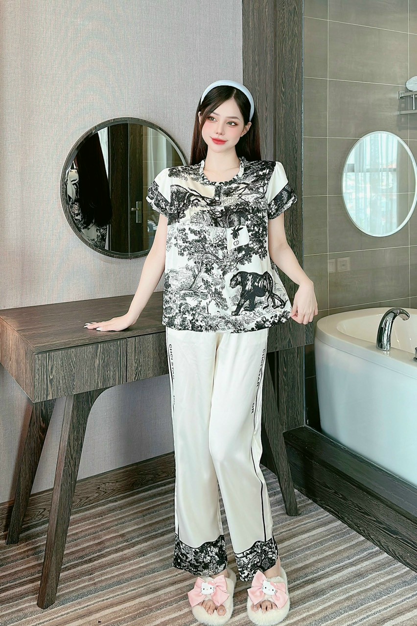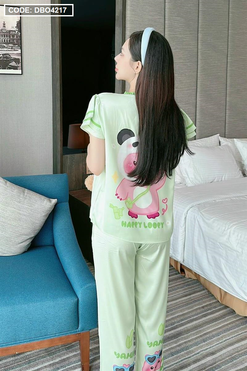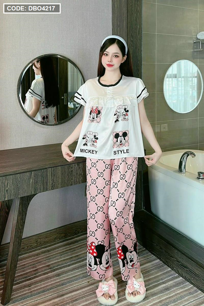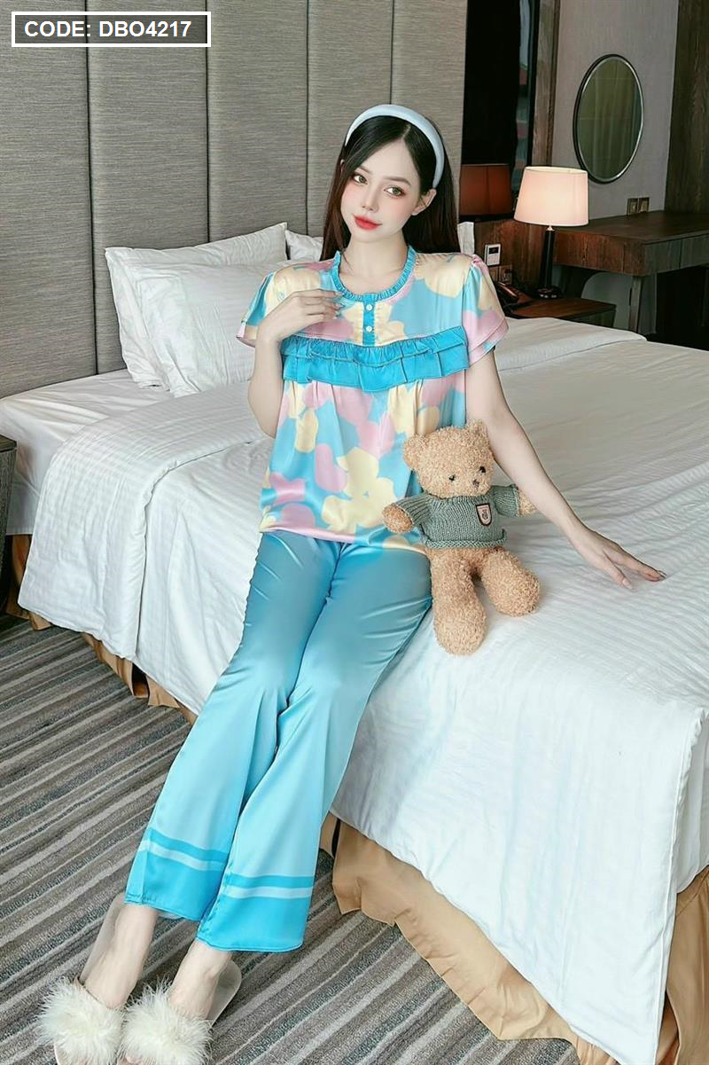 Đồ bộ pijama quần dài áo tay ngắn cổ tròn viền nhún in hoạ tiết