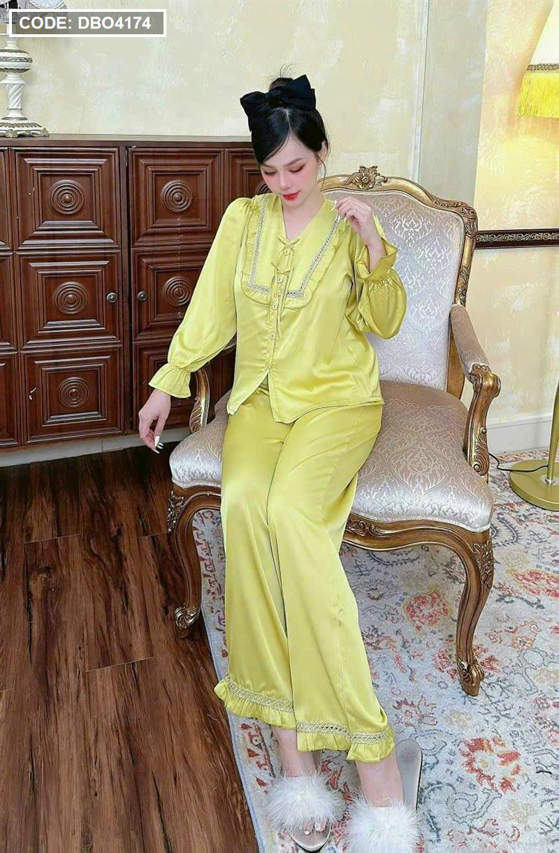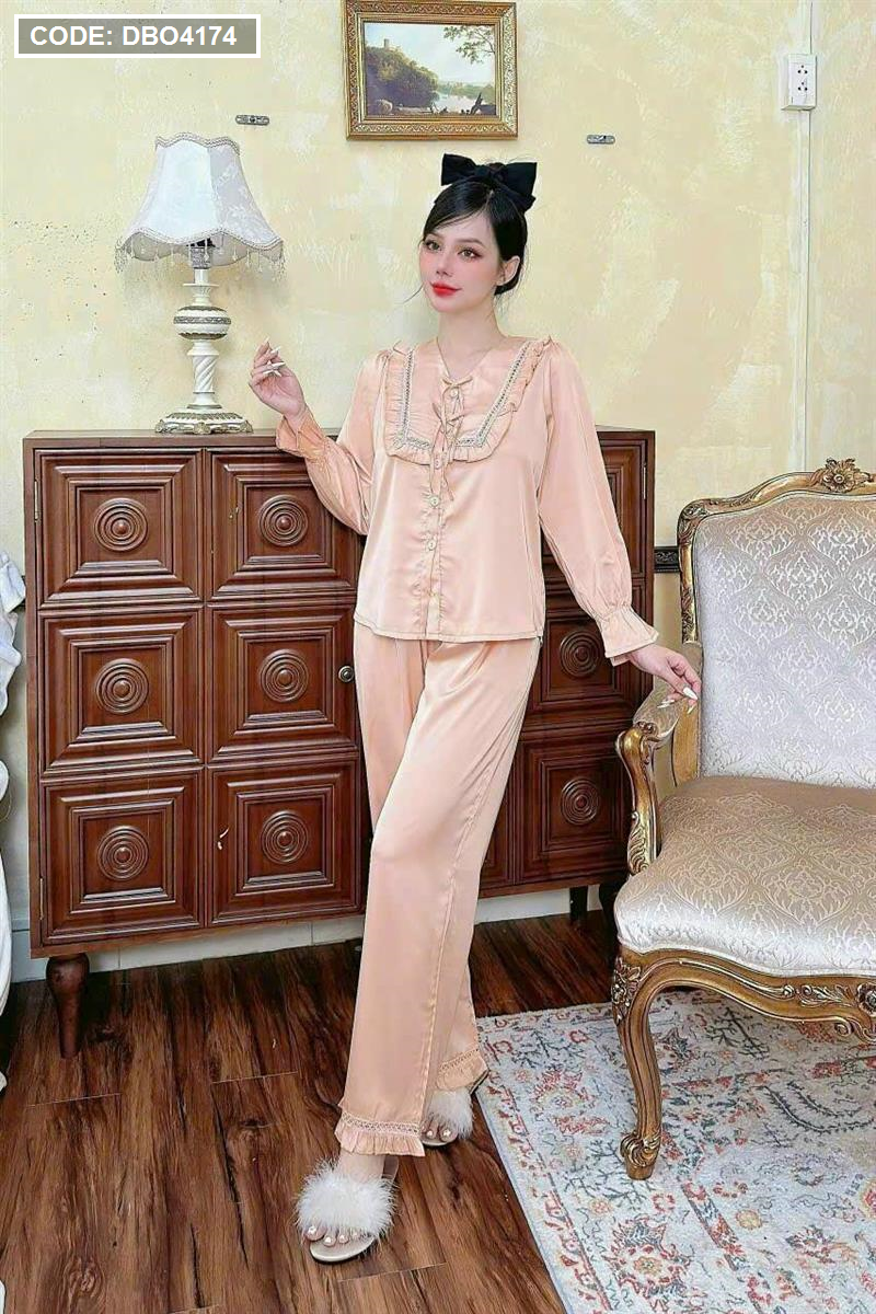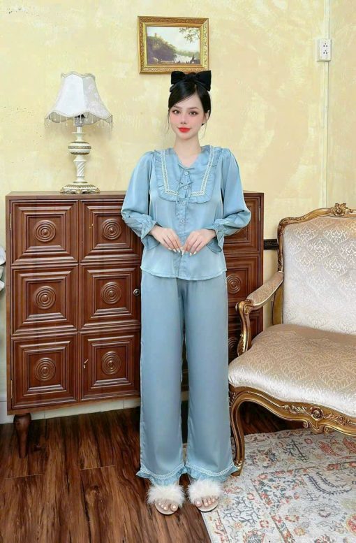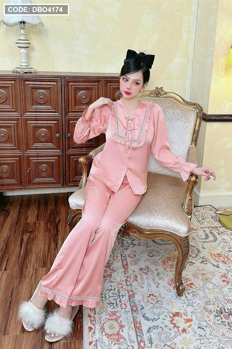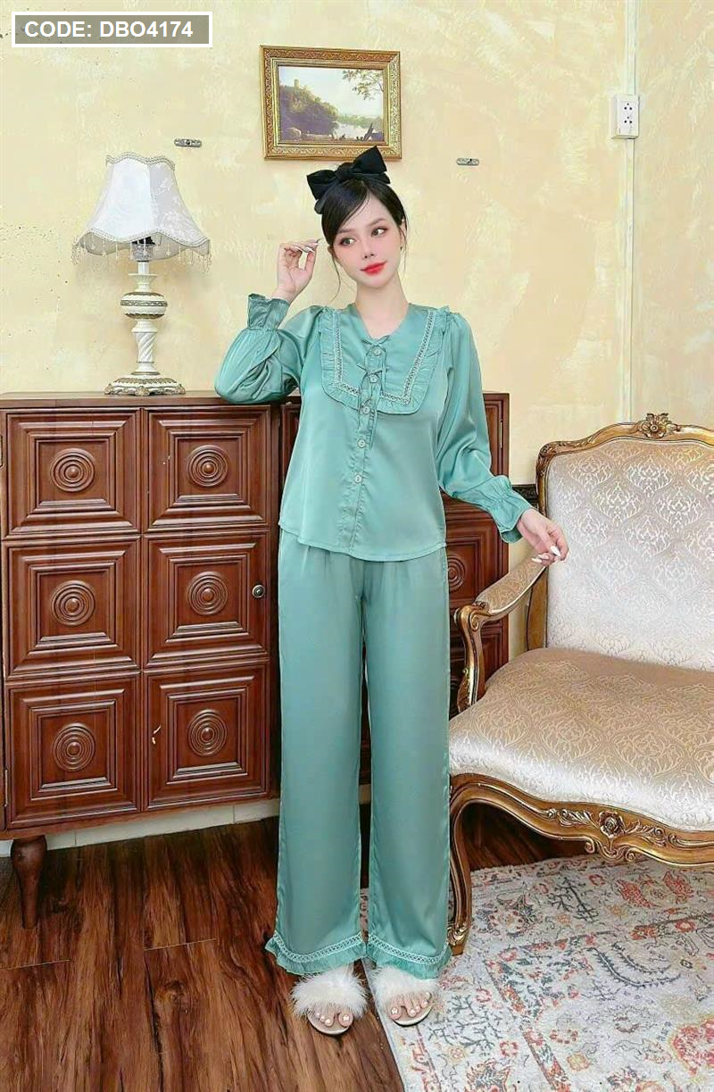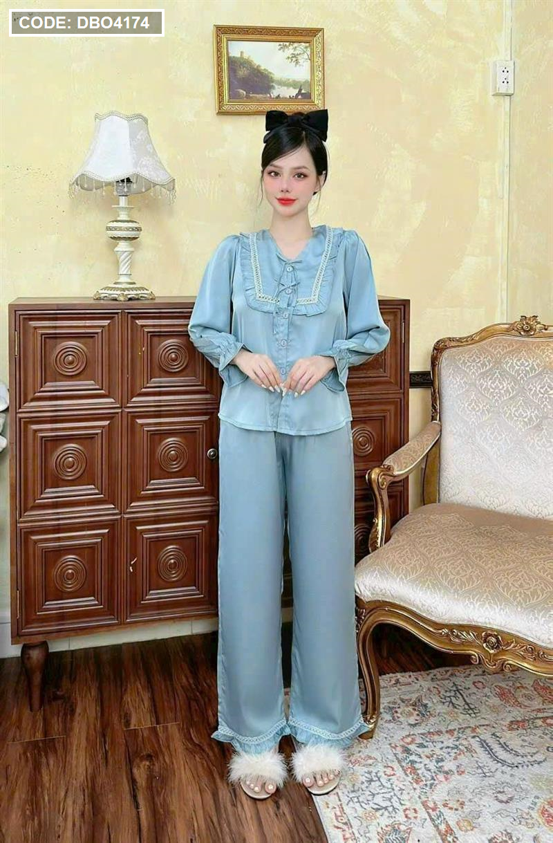 Đồ bộ quần dài áo tay dài bèo cổ v bèo màu trơn