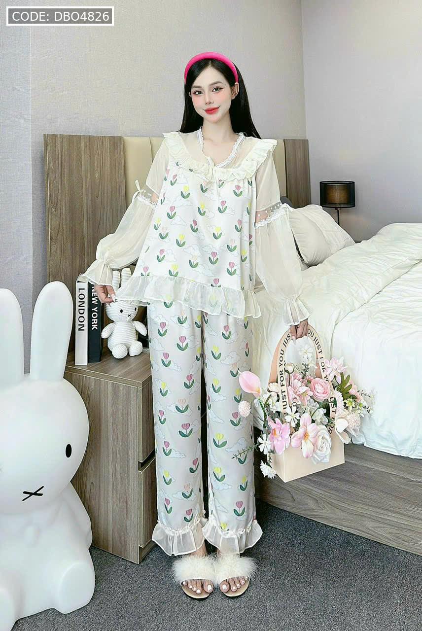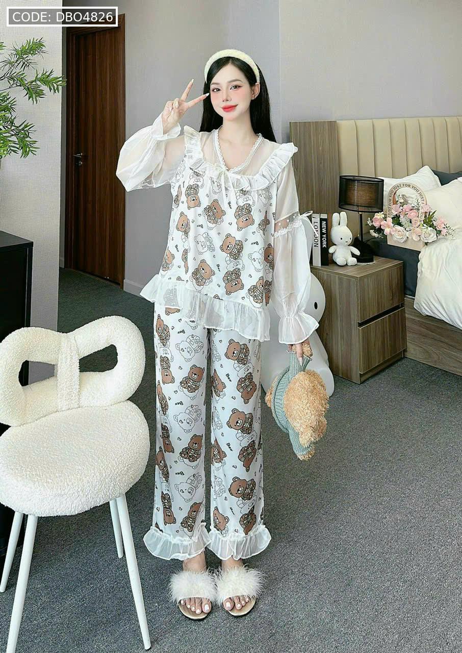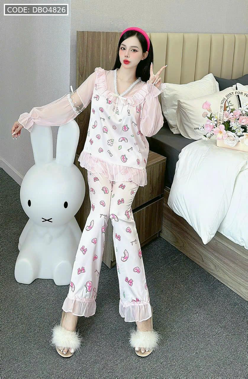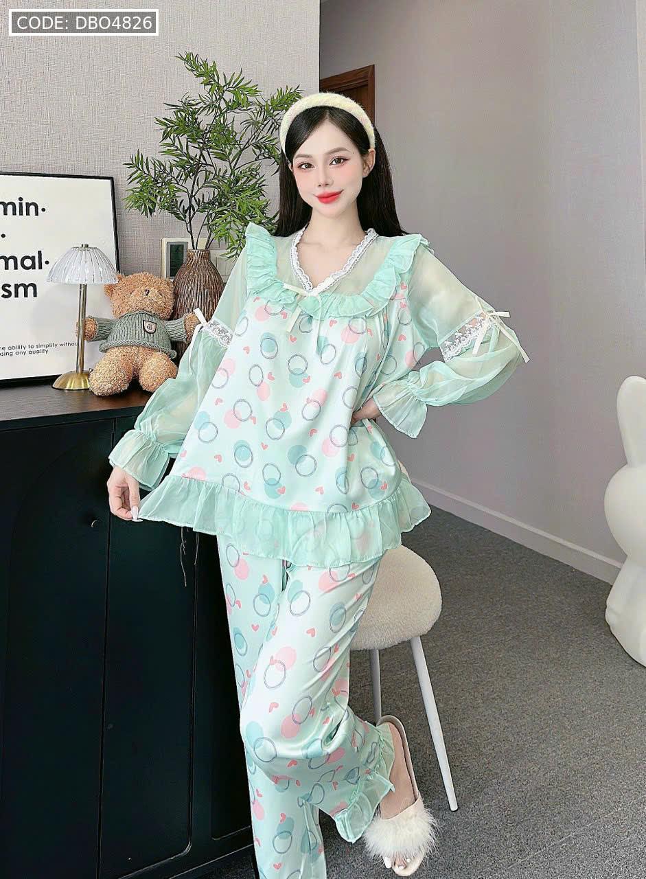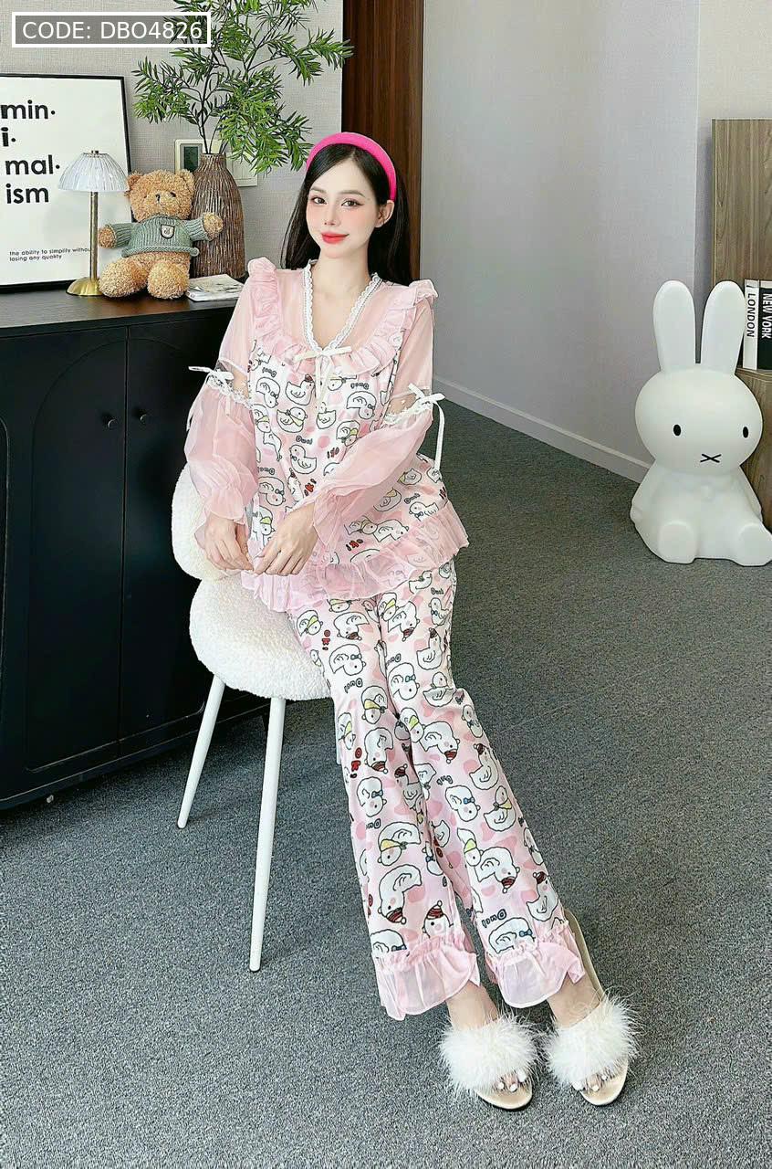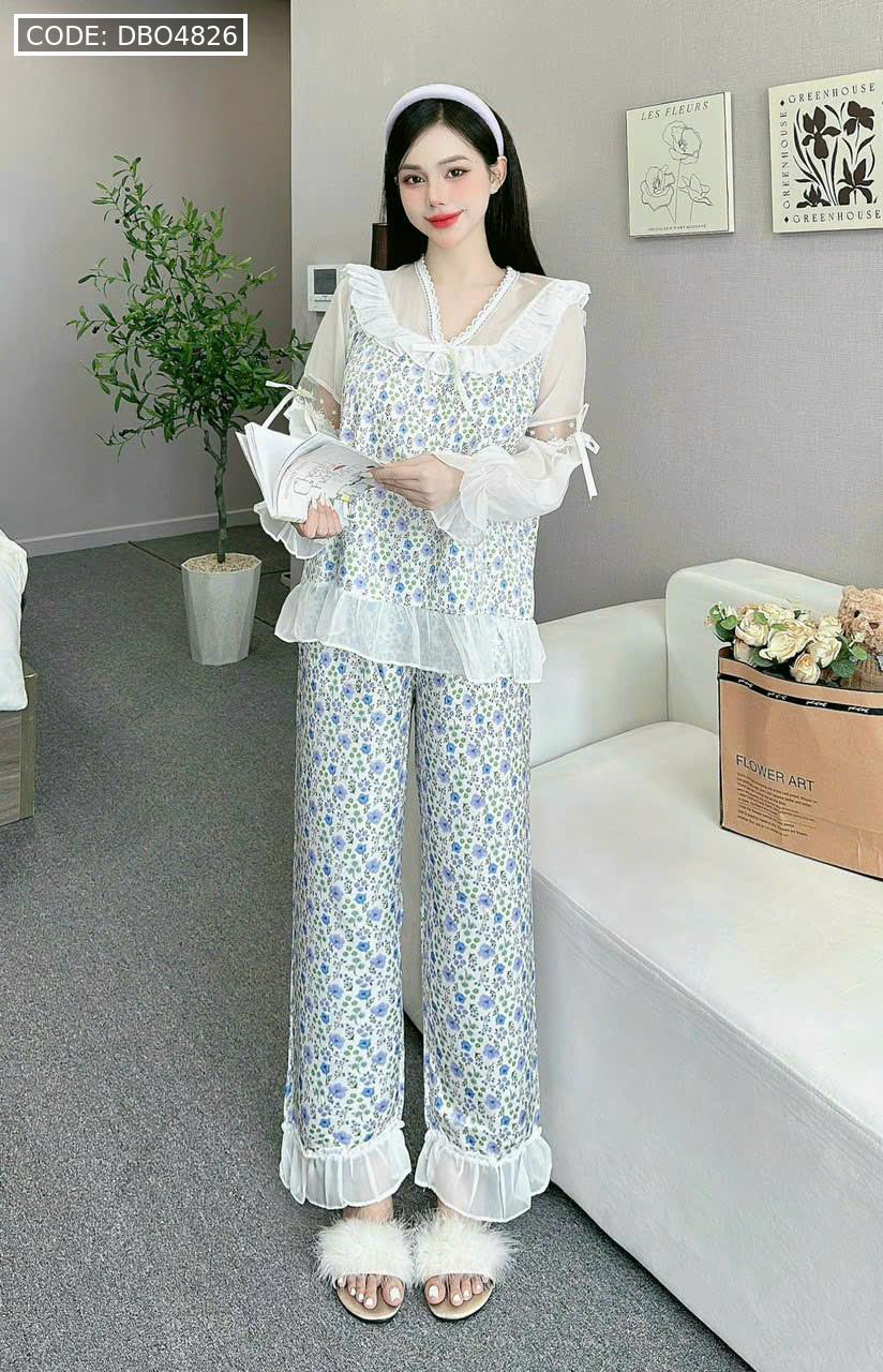 đồ bộ quần dài áo tay dài vải latin phối ren nơ