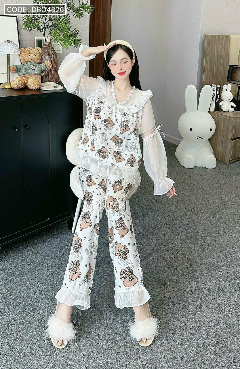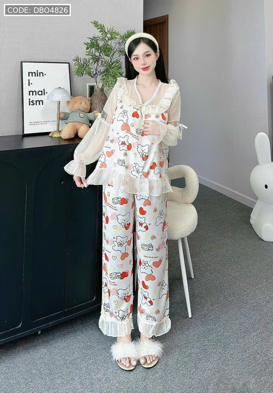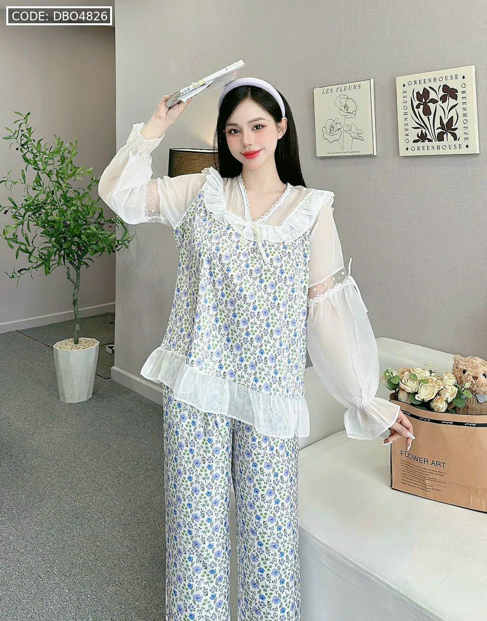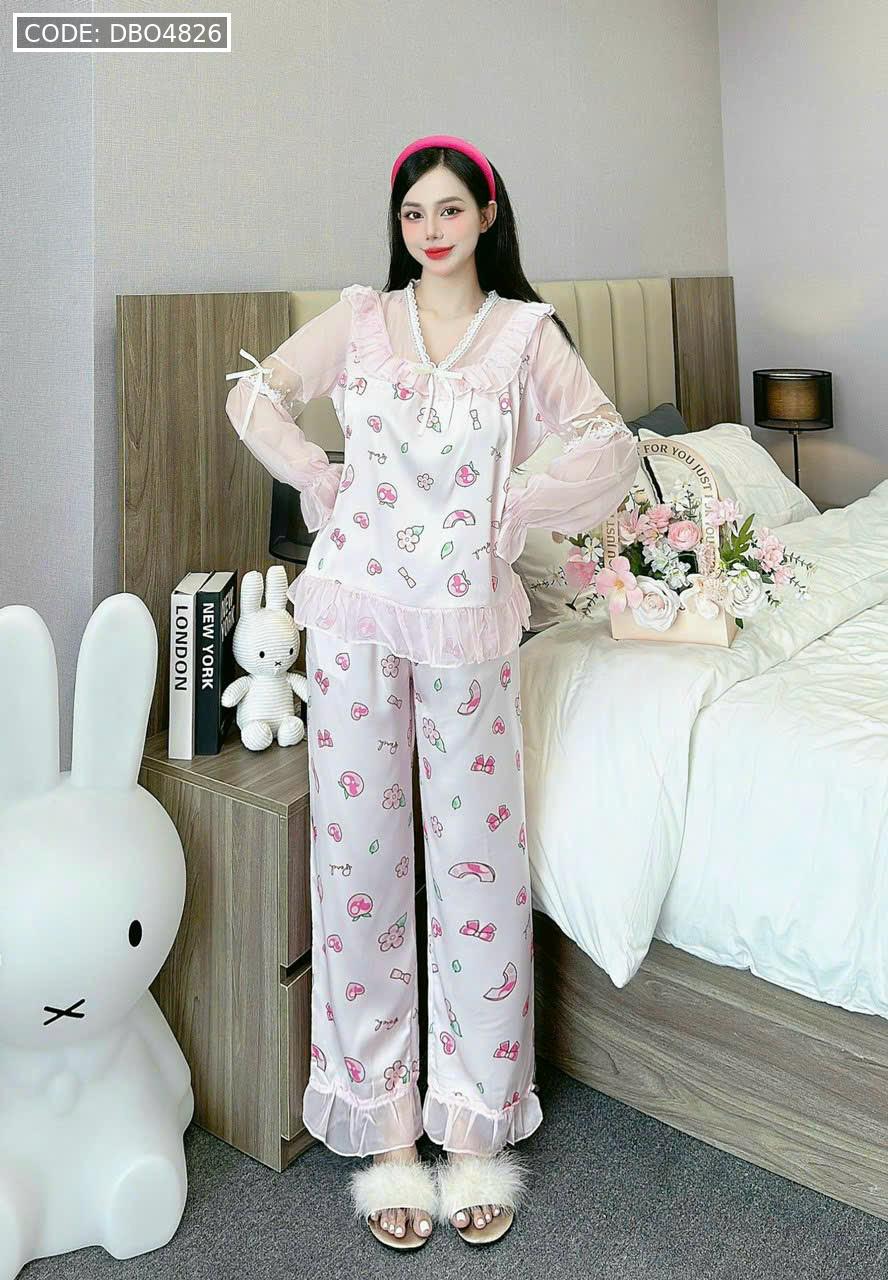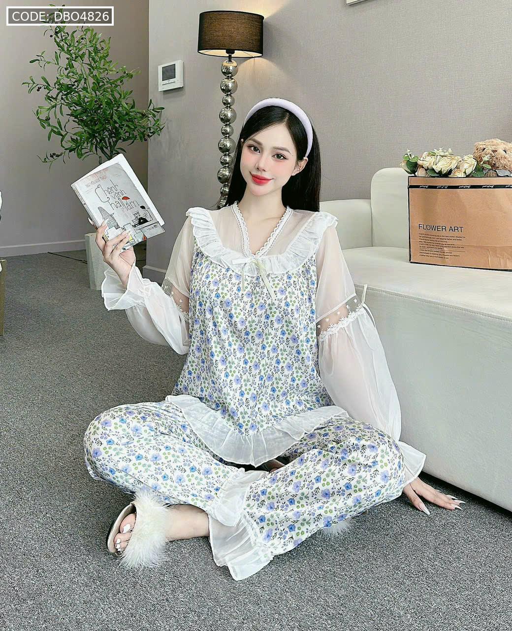 đồ bộ quần dài áo tay dài vải latin phối ren nơ