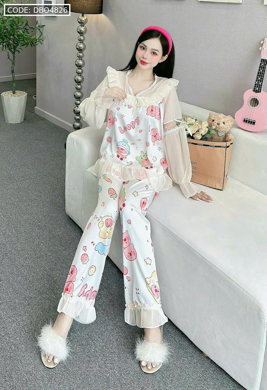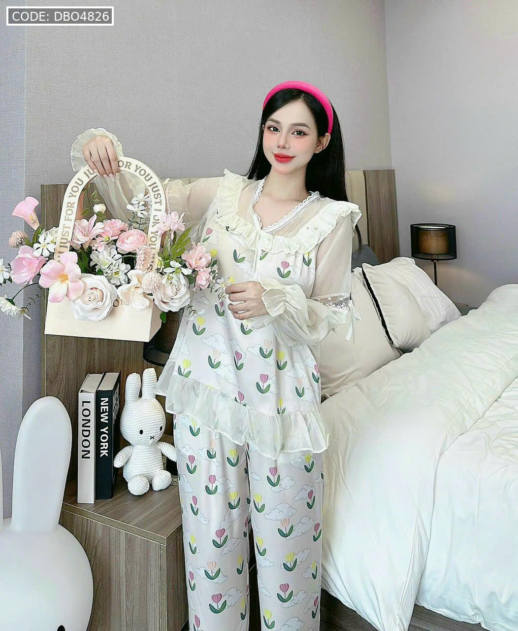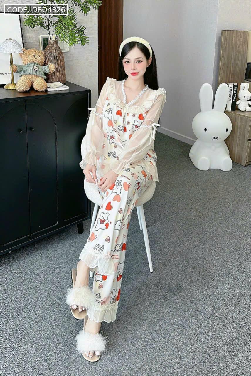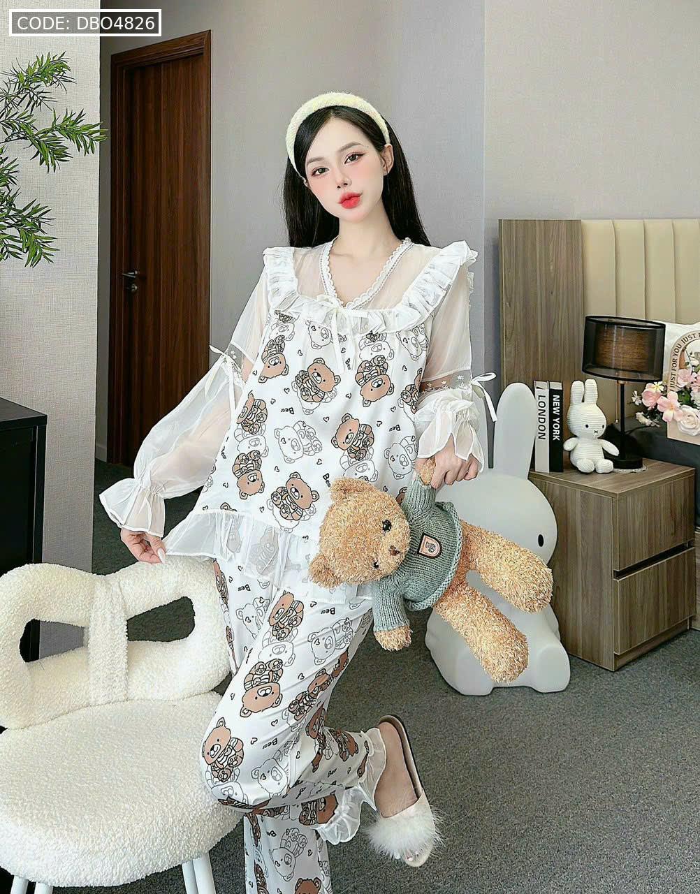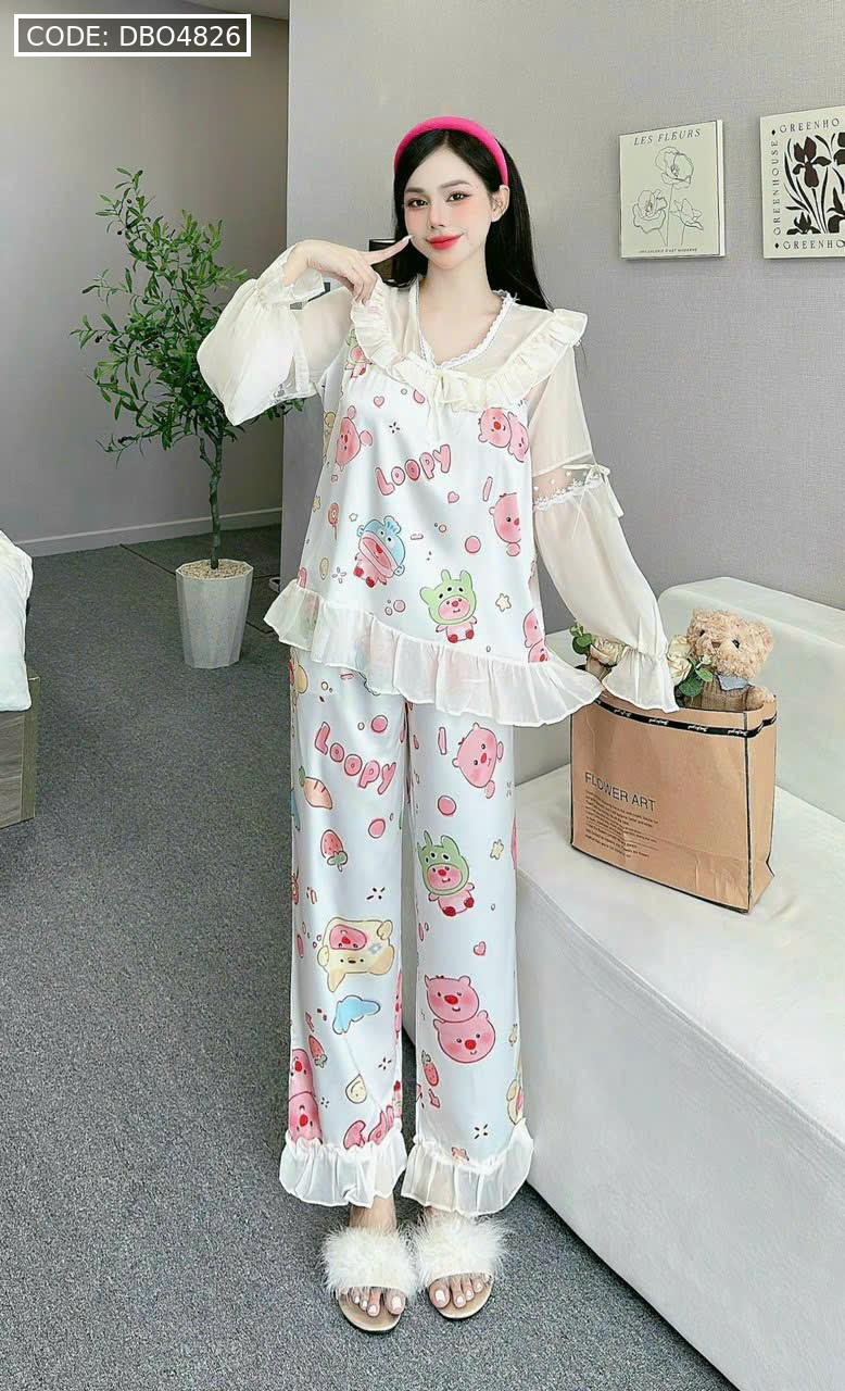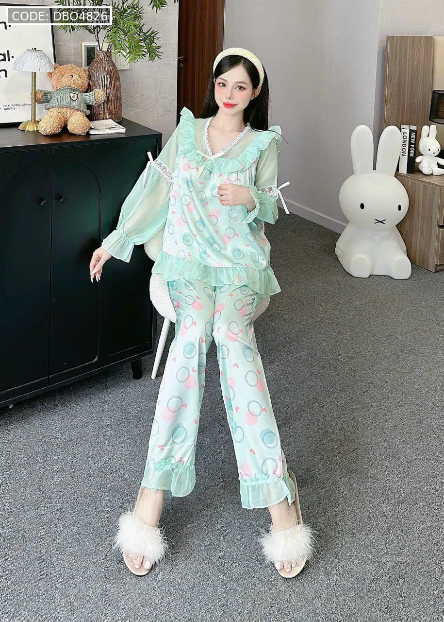 đồ bộ quần dài áo tay dài vải latin phối ren nơ