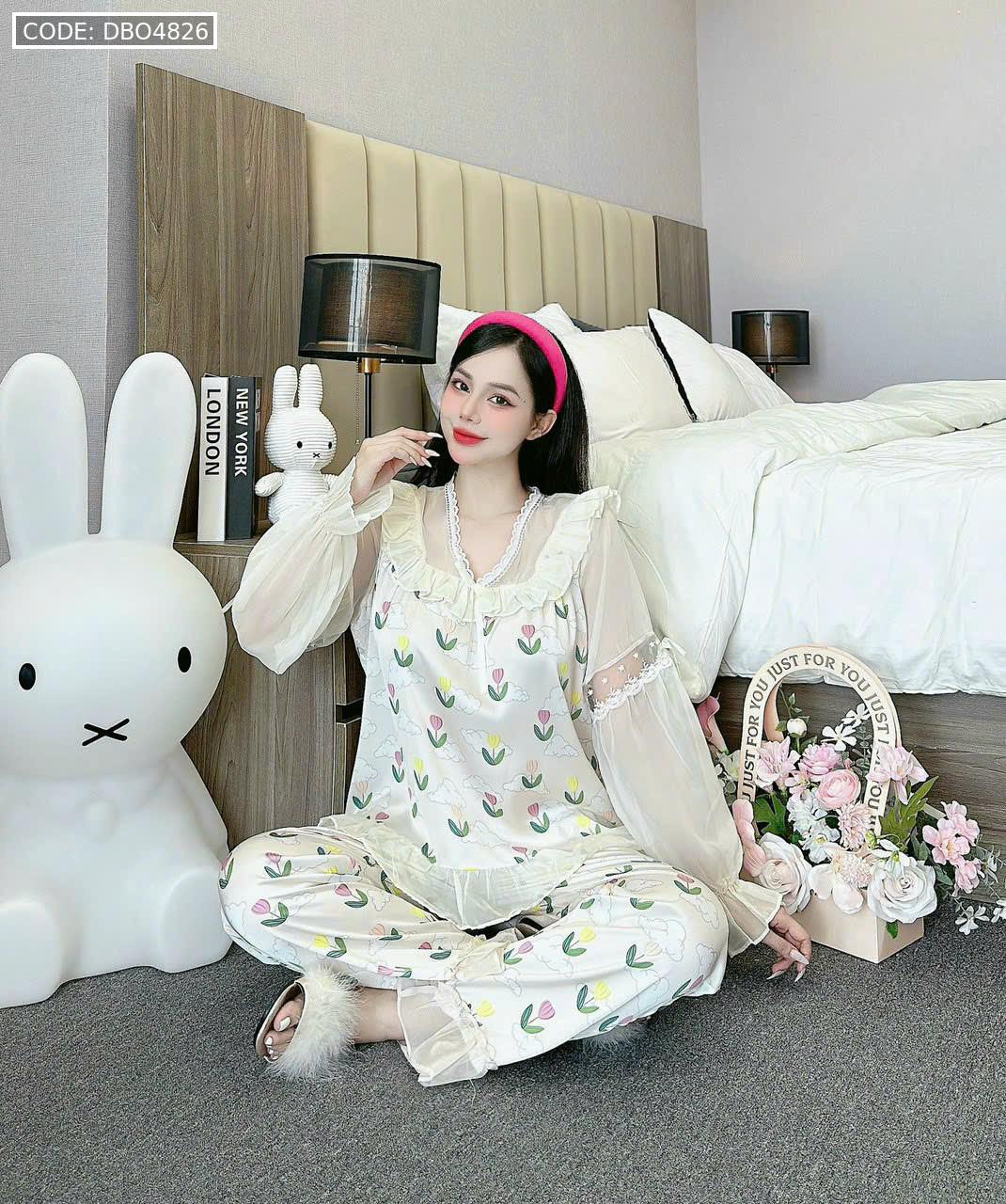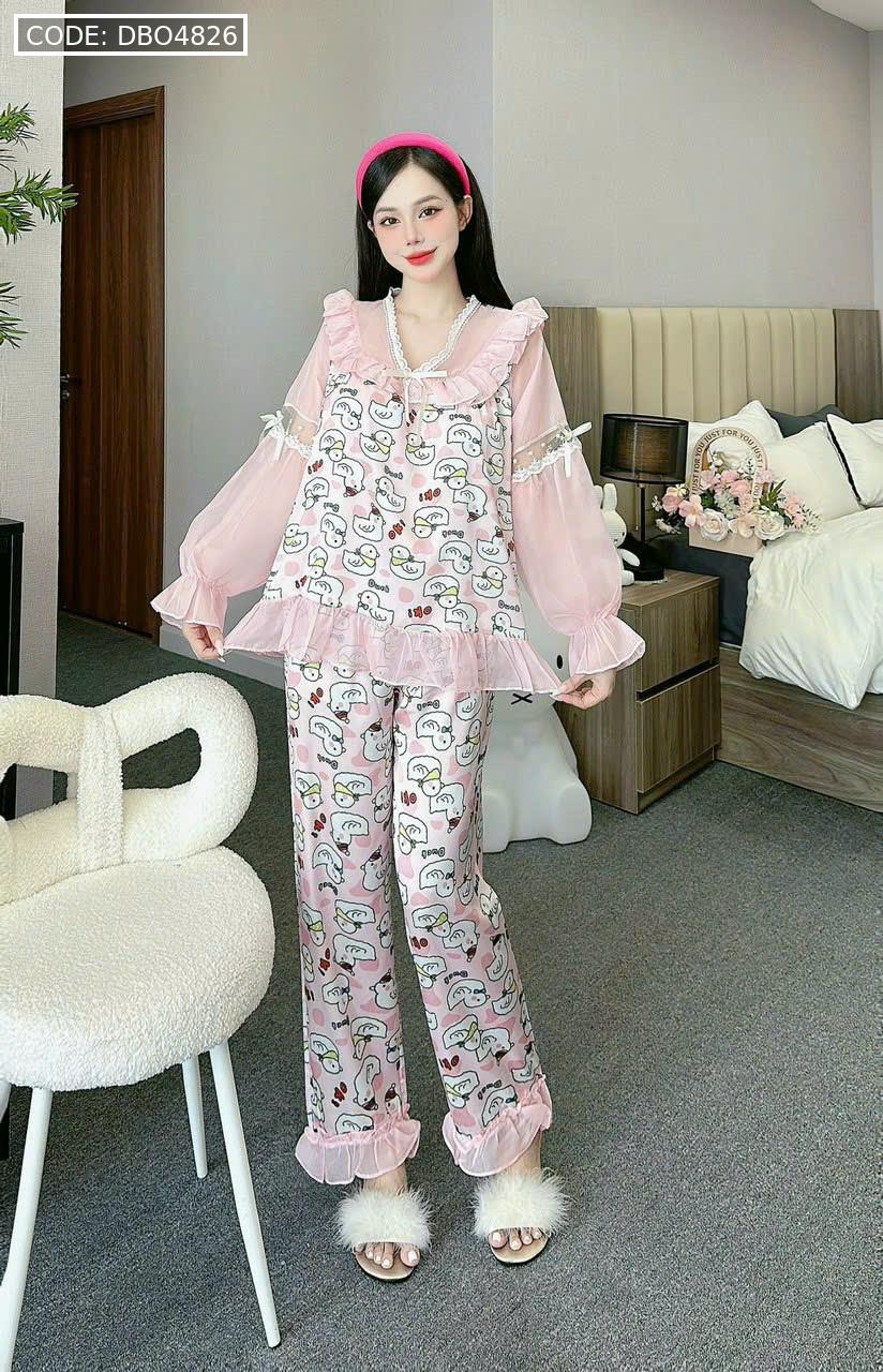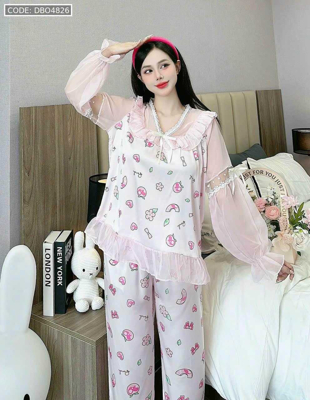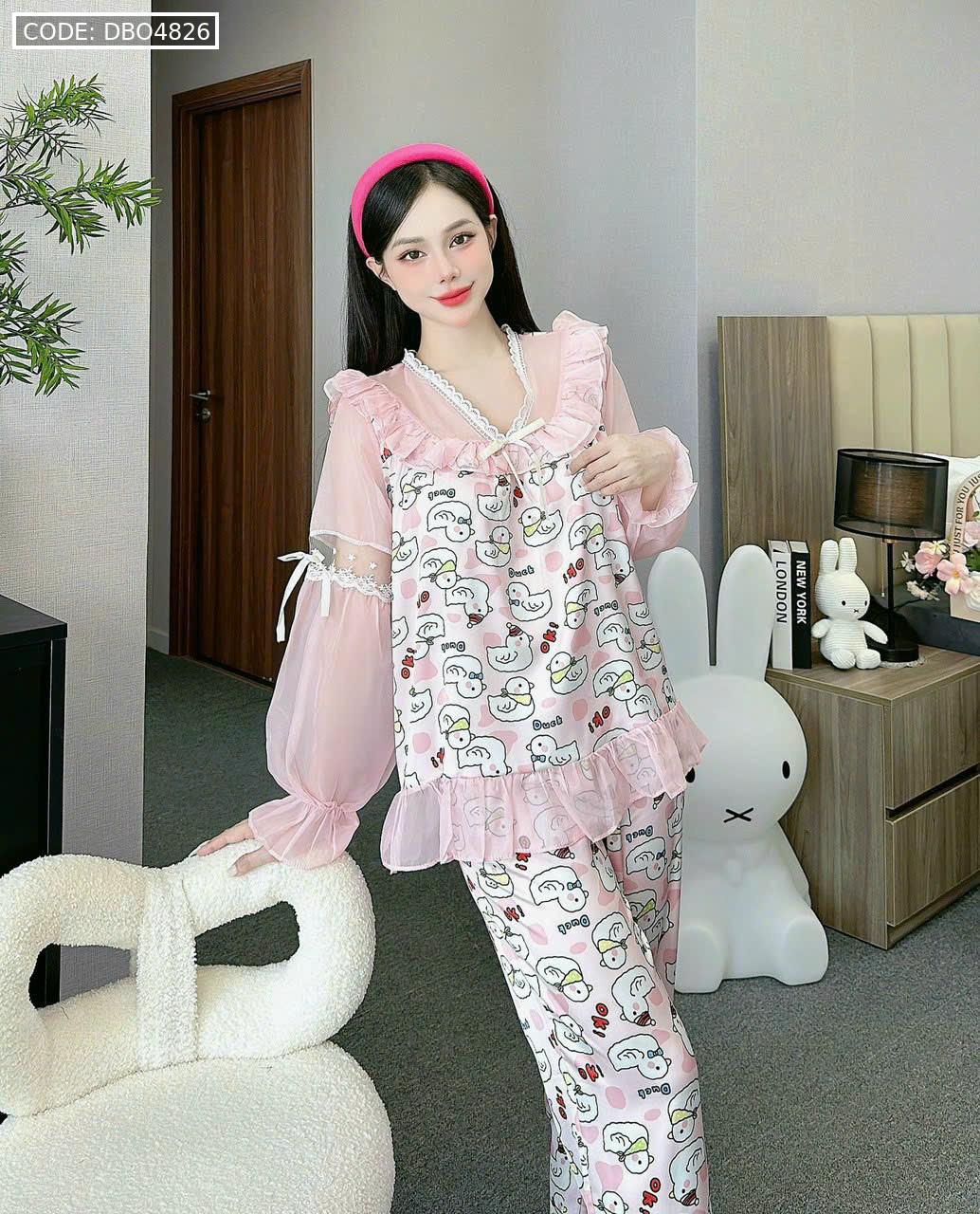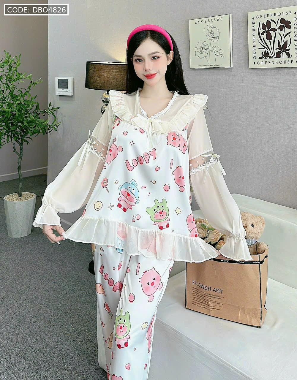 đồ bộ quần dài áo tay dài vải latin phối ren nơ