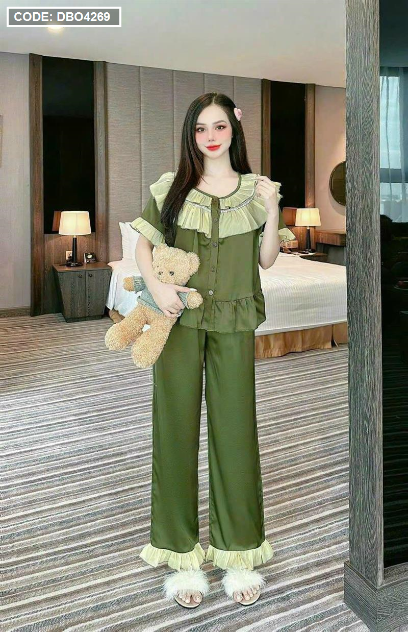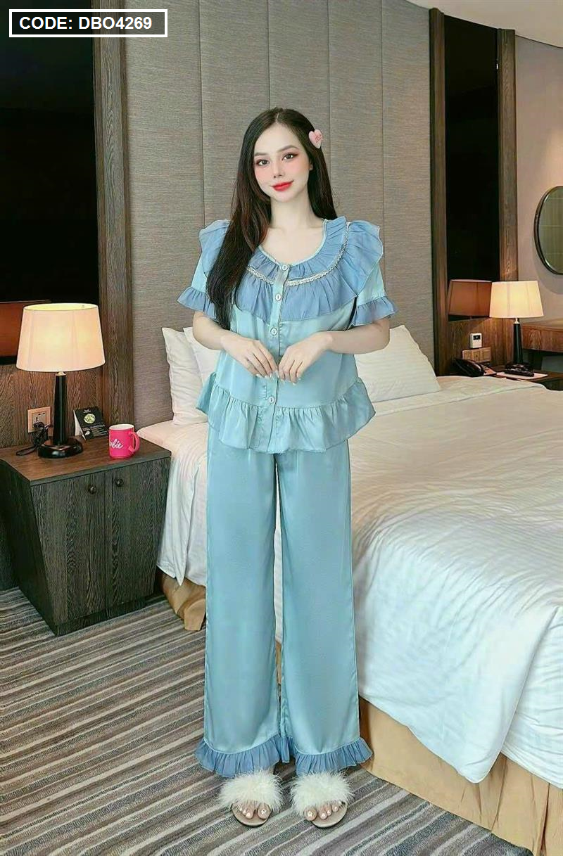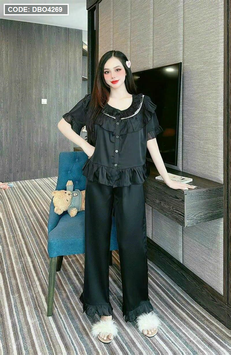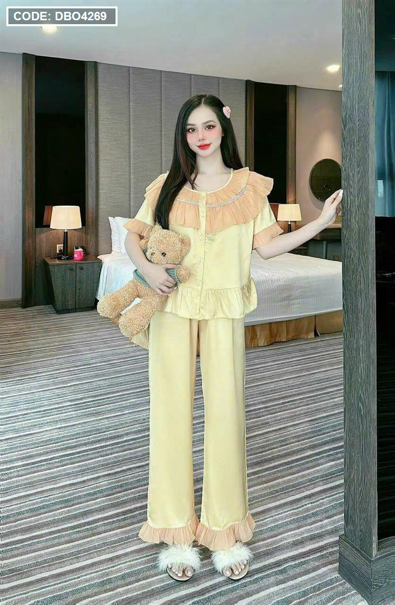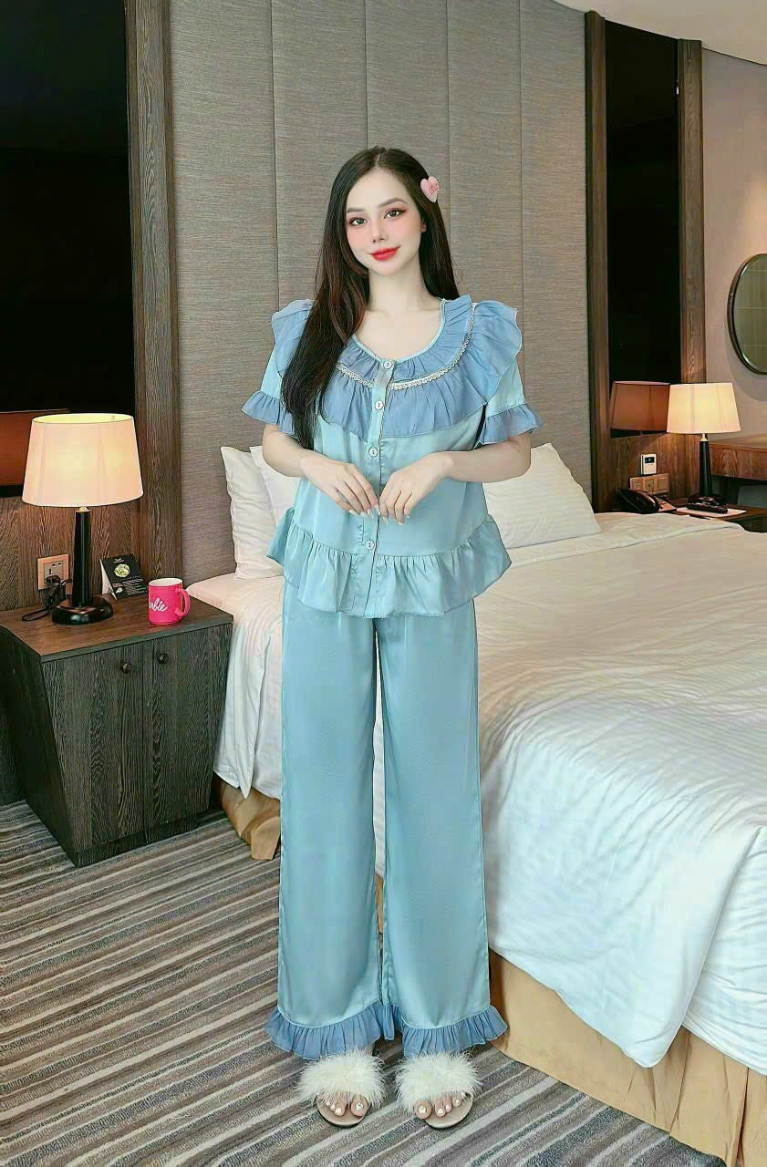 Đồ bộ quần dài áo tay ngắn bèo cổ tròn bèo màu trơn