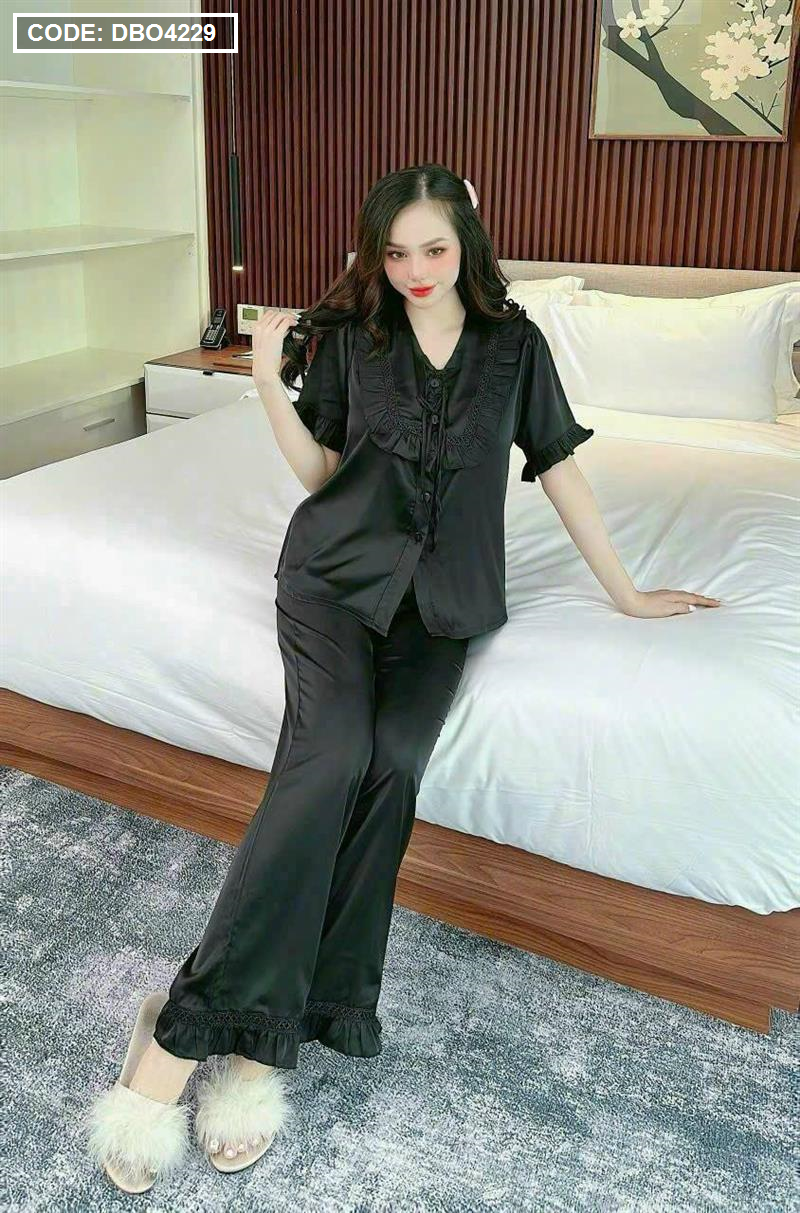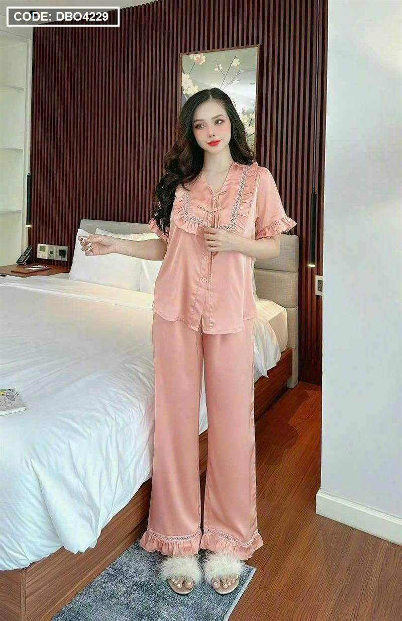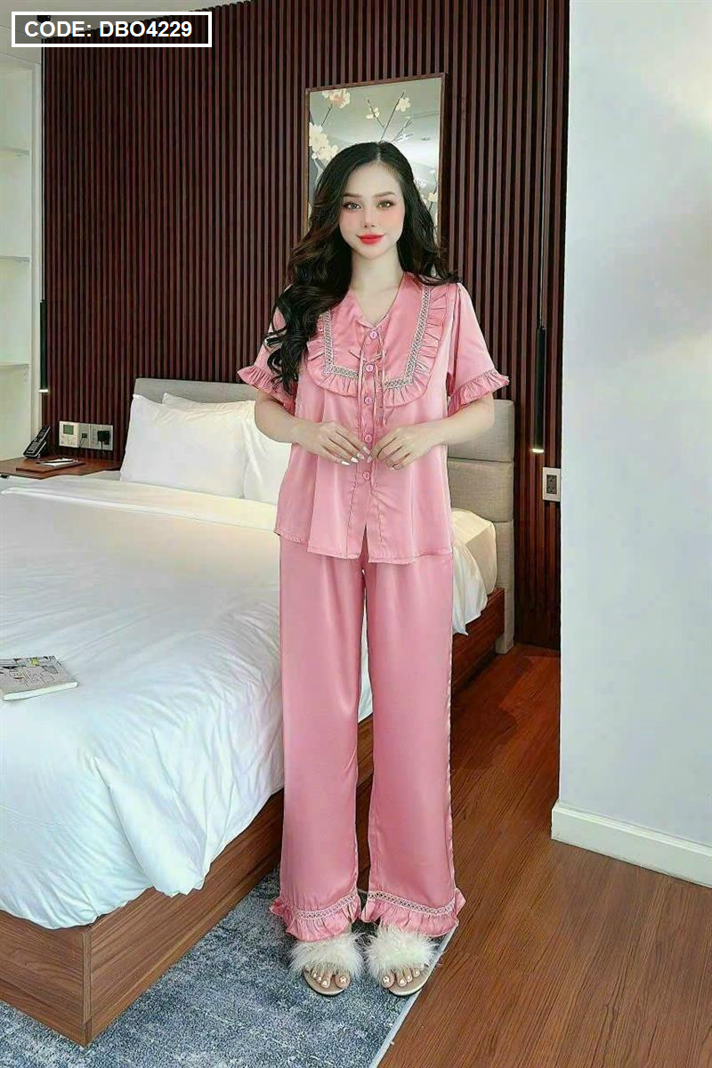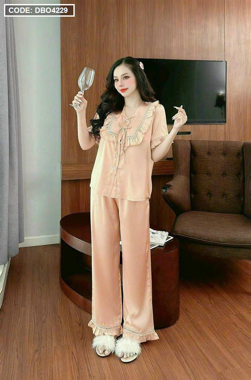 Đồ bộ quần dài áo tay ngắn bèo cổ vuông bèo màu trơn