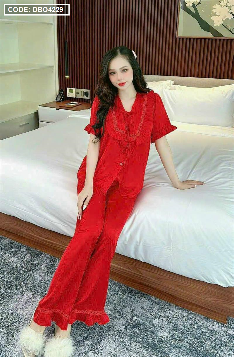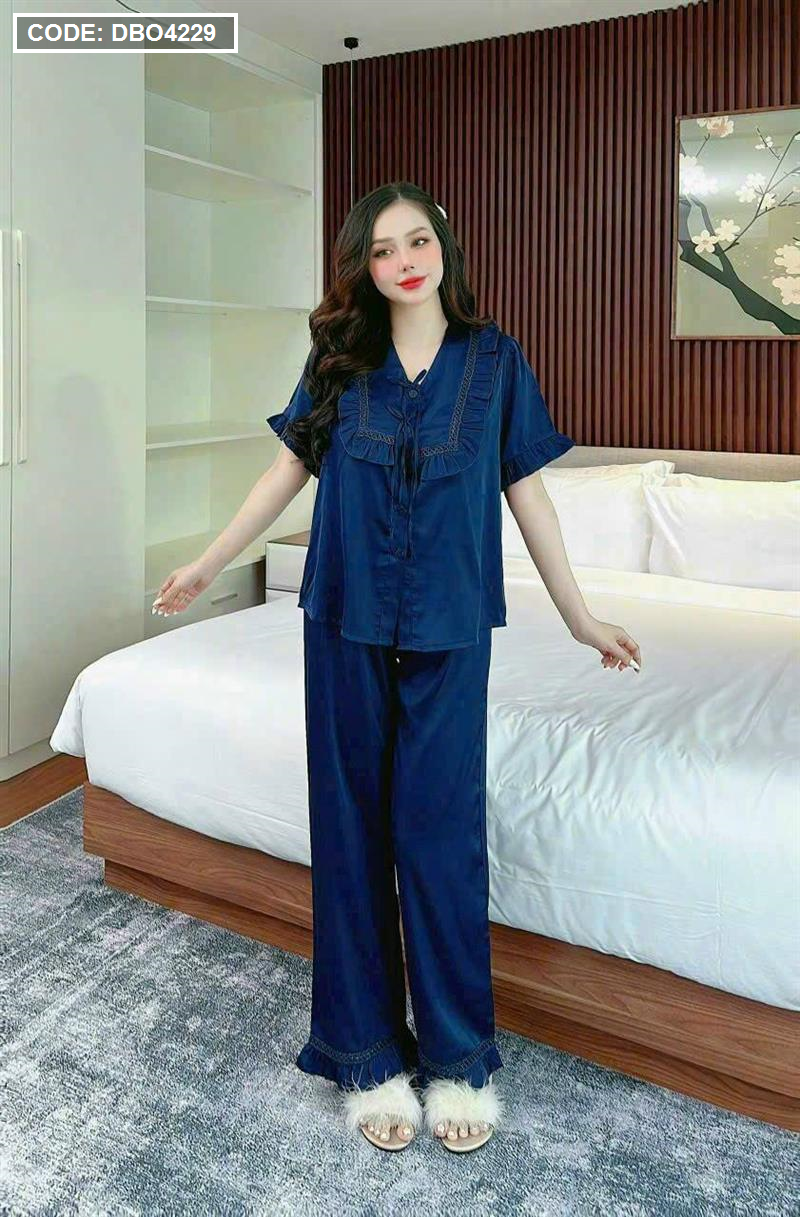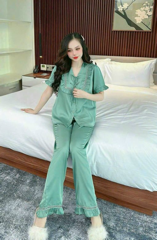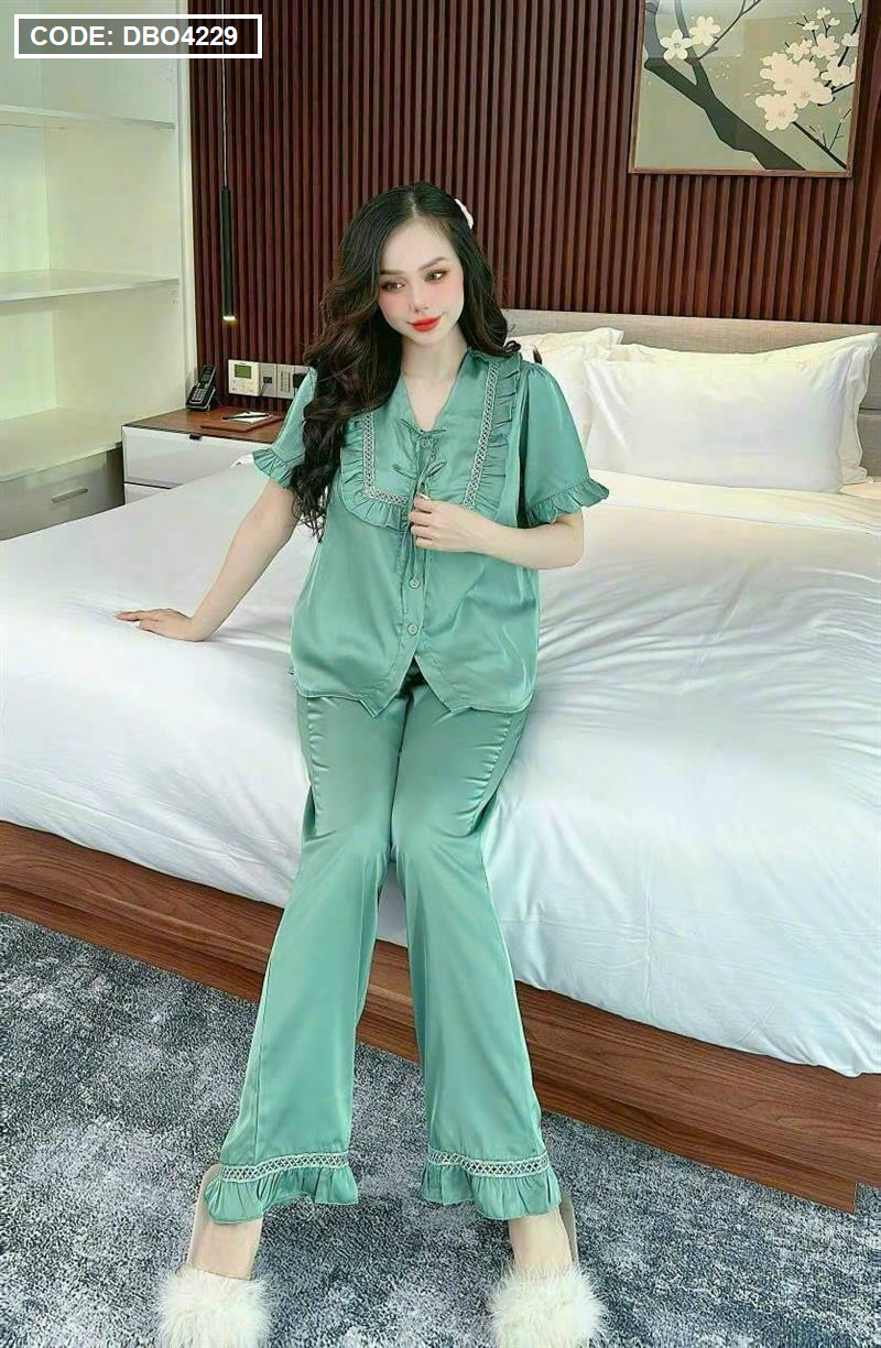 Đồ bộ quần dài áo tay ngắn bèo cổ vuông bèo màu trơn