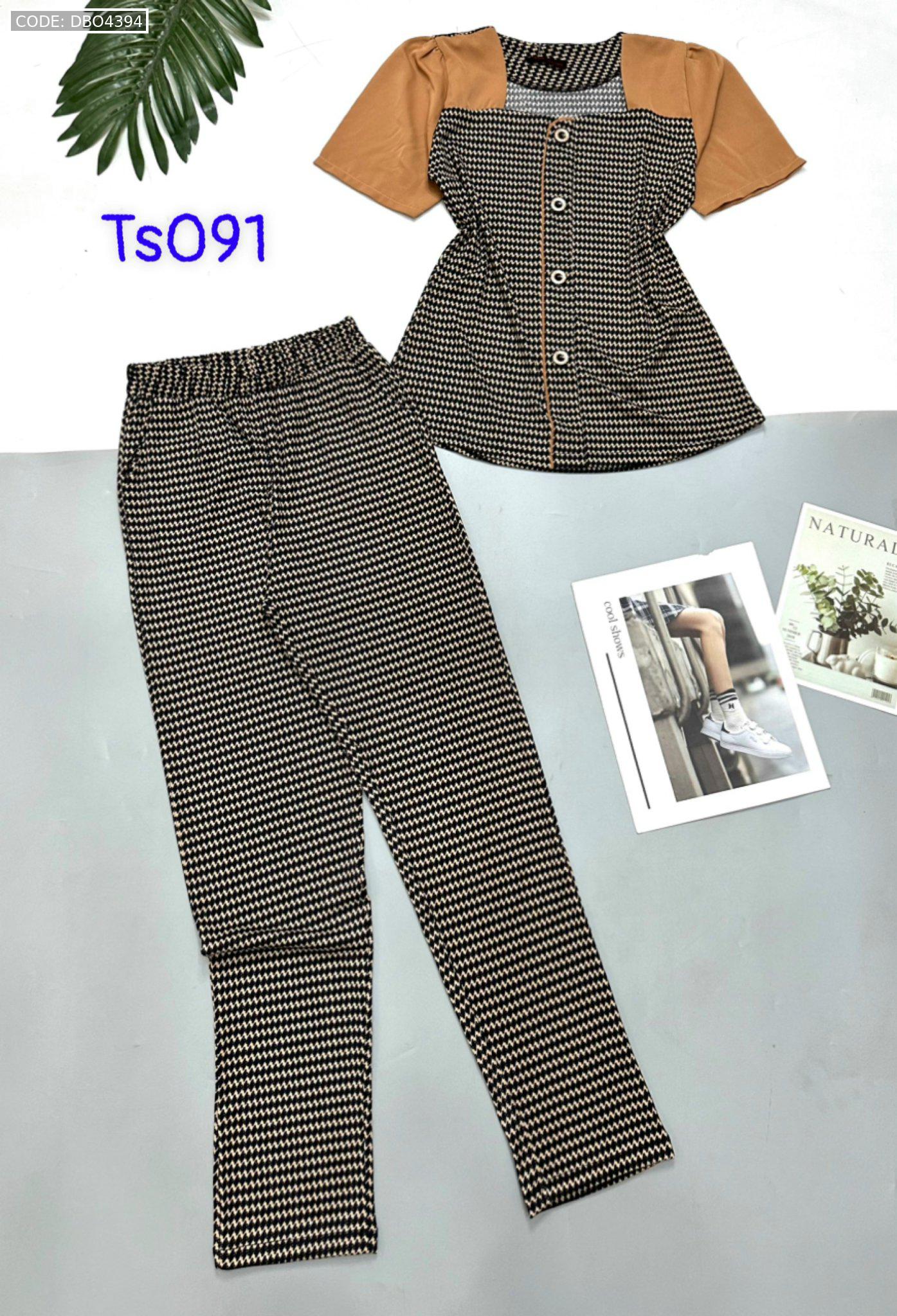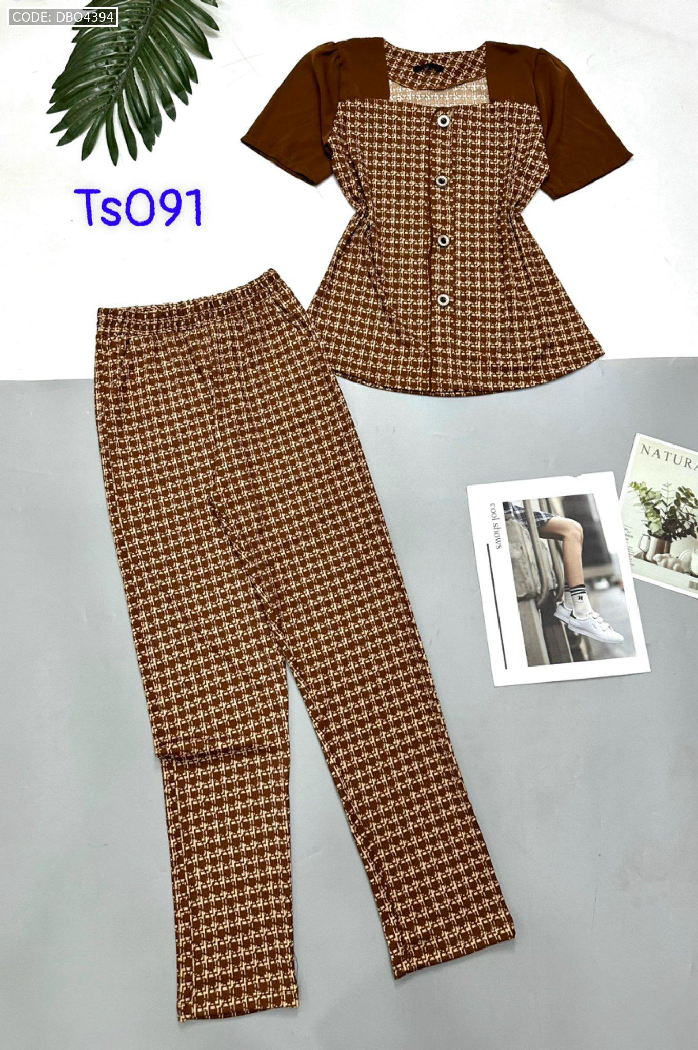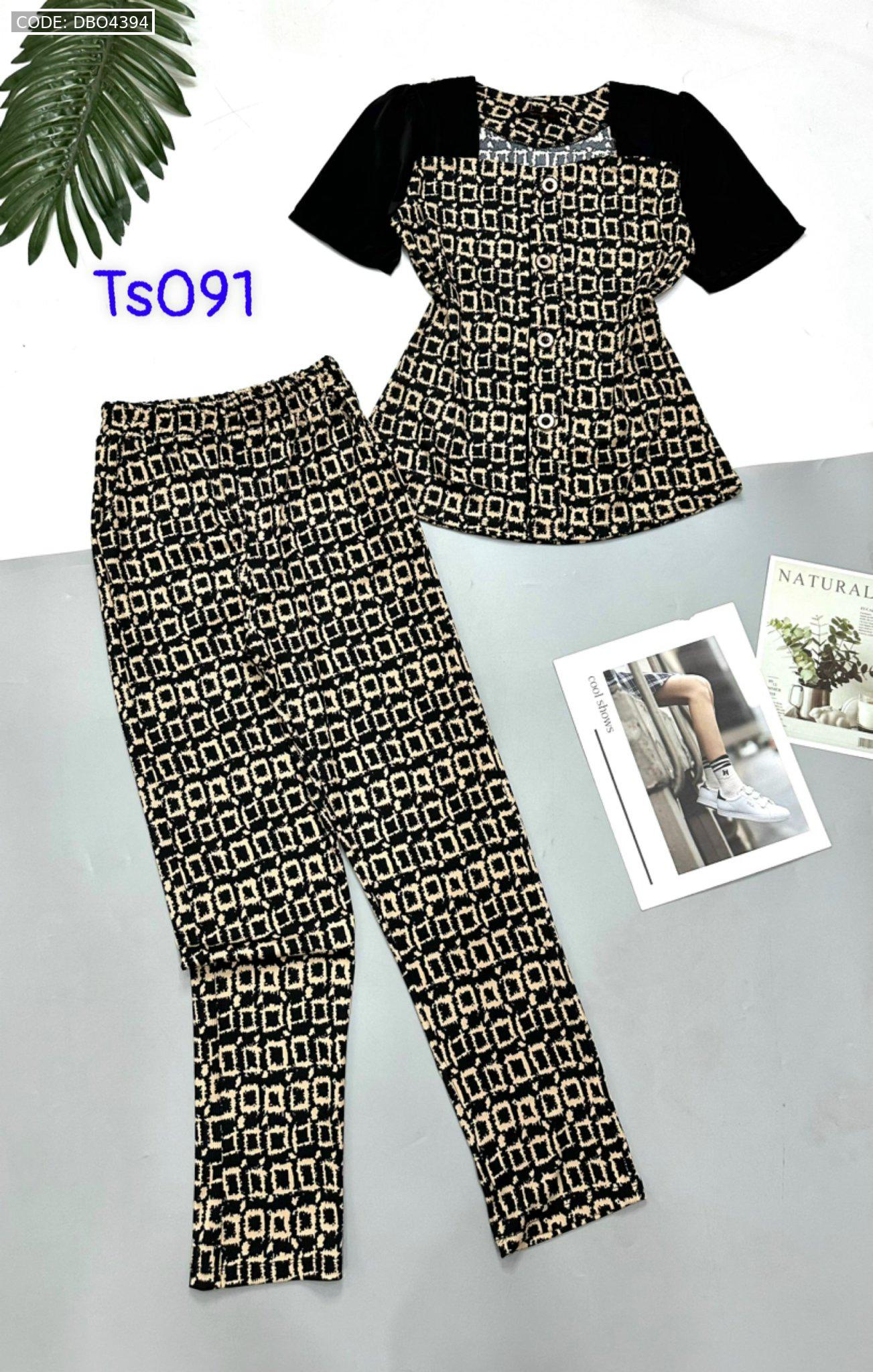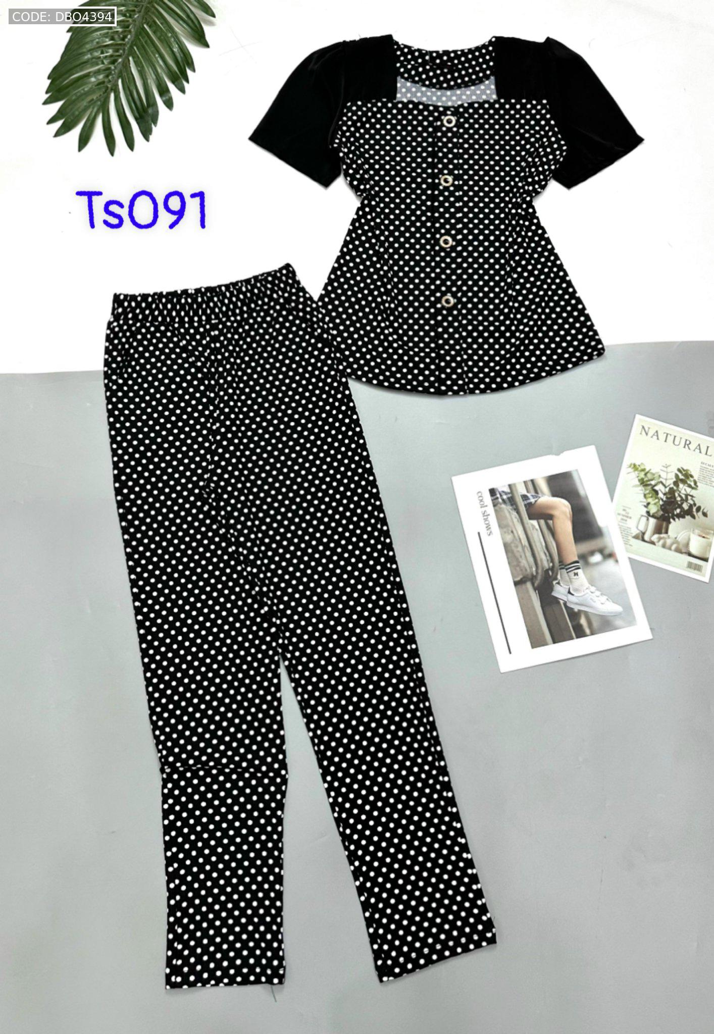 Đồ bộ quần dài áo tay ngắn cổ vuông có nút in hoạ tiết nhỏ