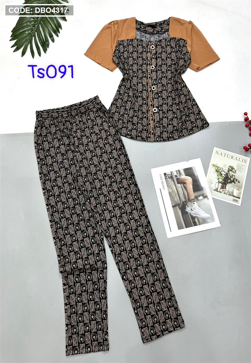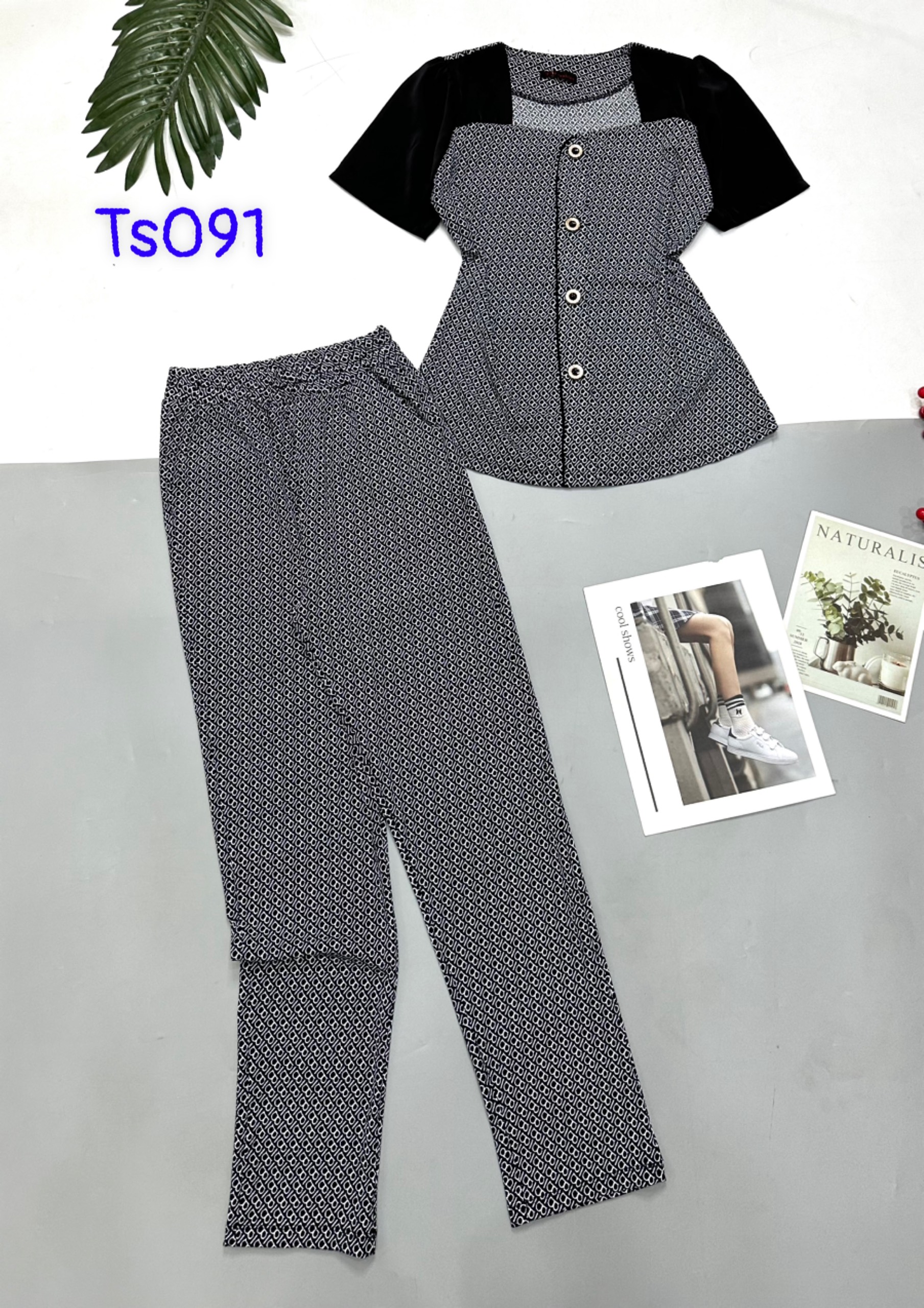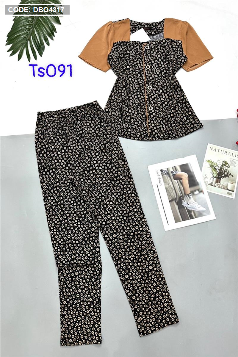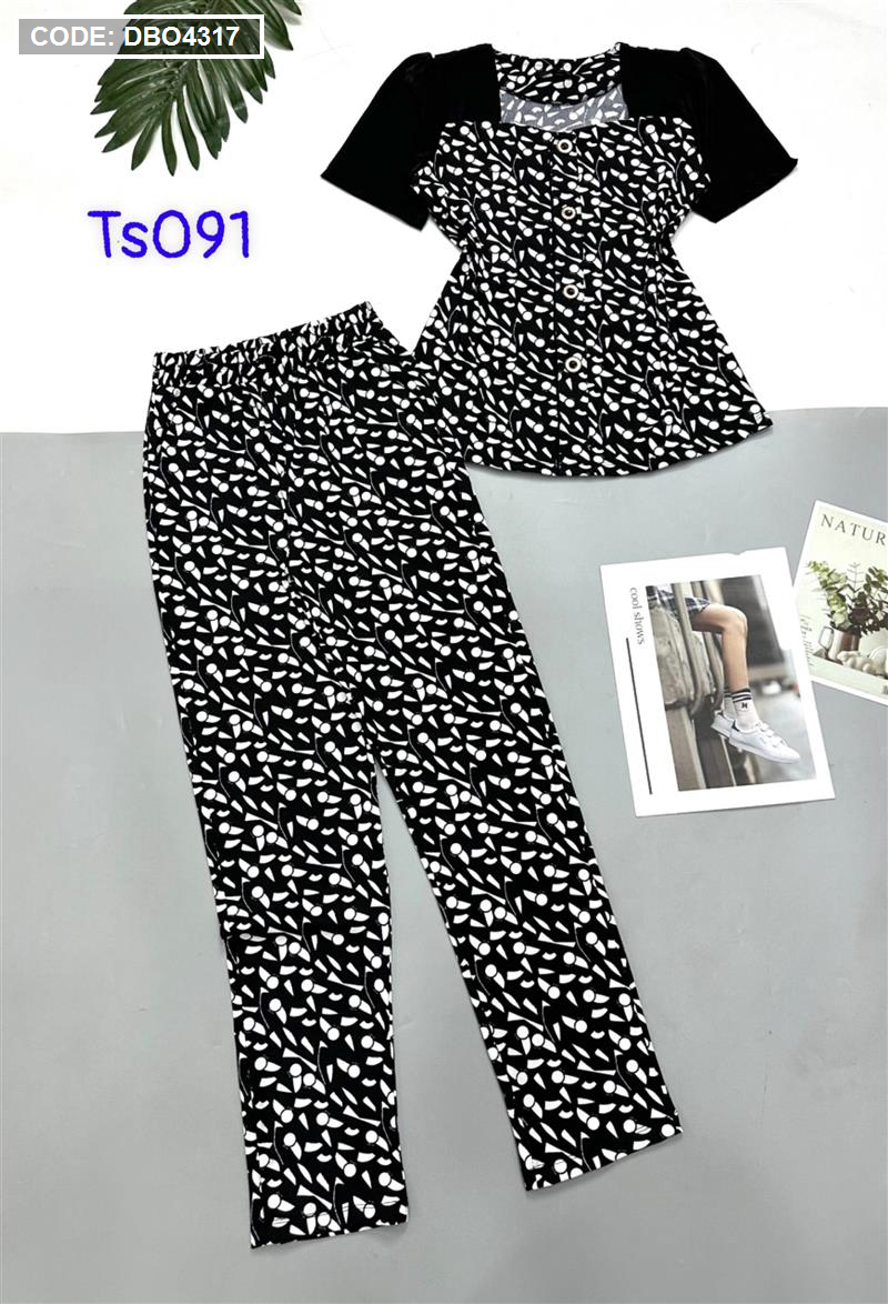 Đồ bộ quần dài áo tay ngắn cổ vuông in hoạ tiết nhỏ