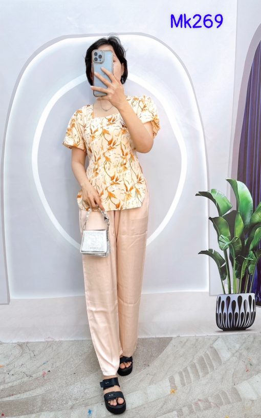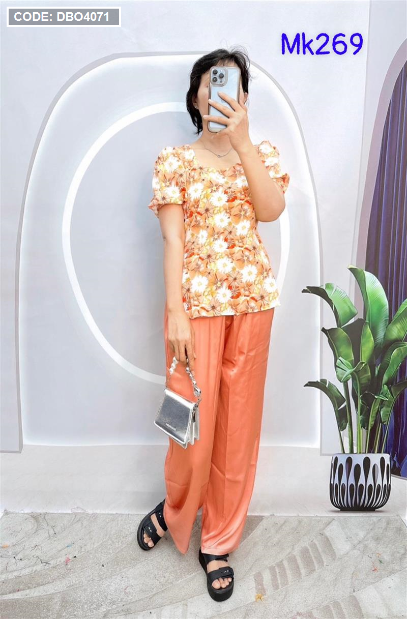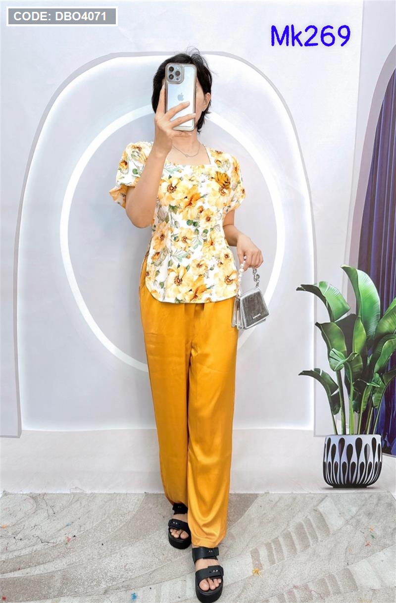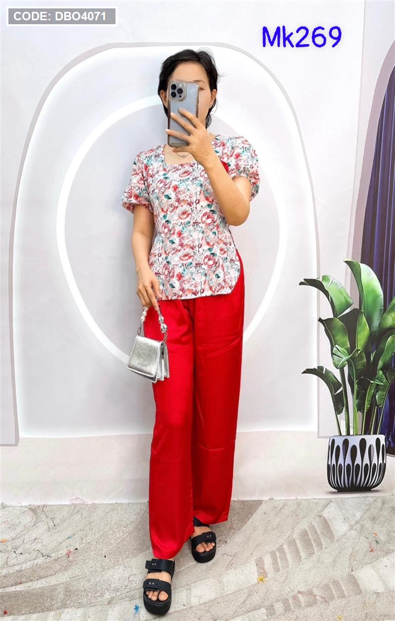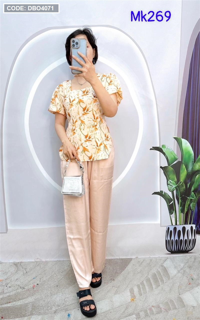 Đồ bộ quần dài áo tay ngắn phồng cồ vuông hoạ tiết