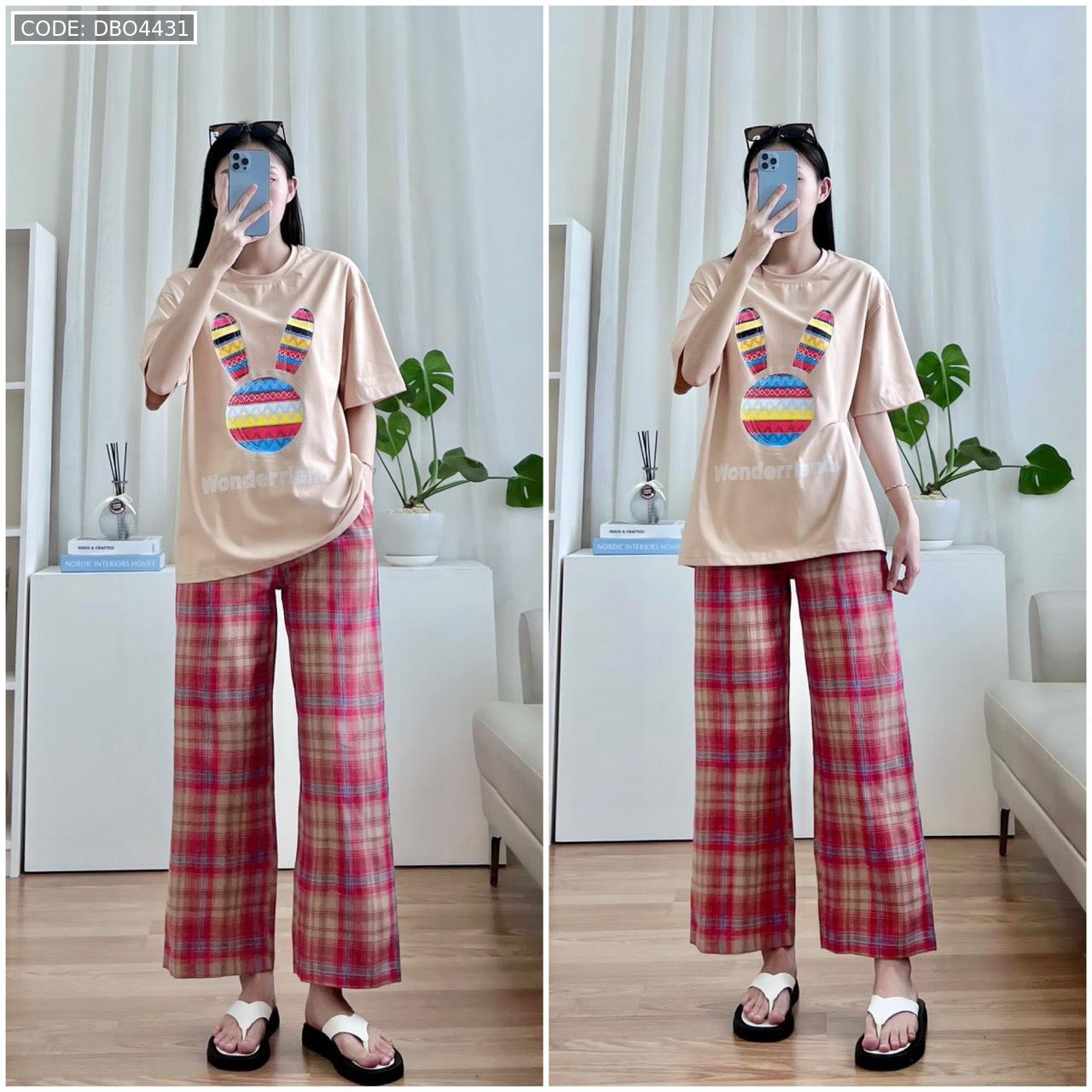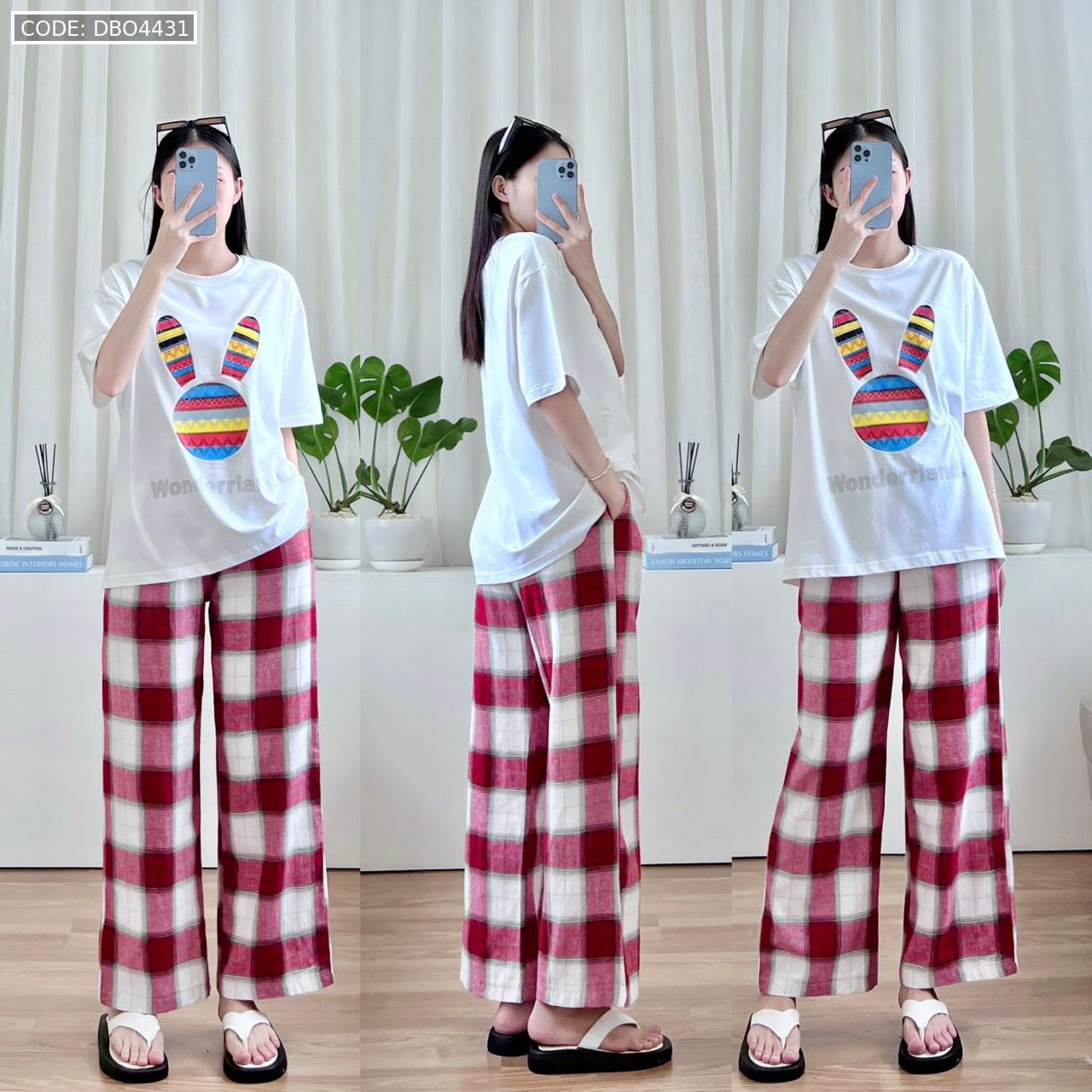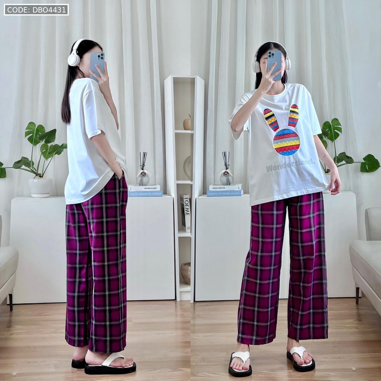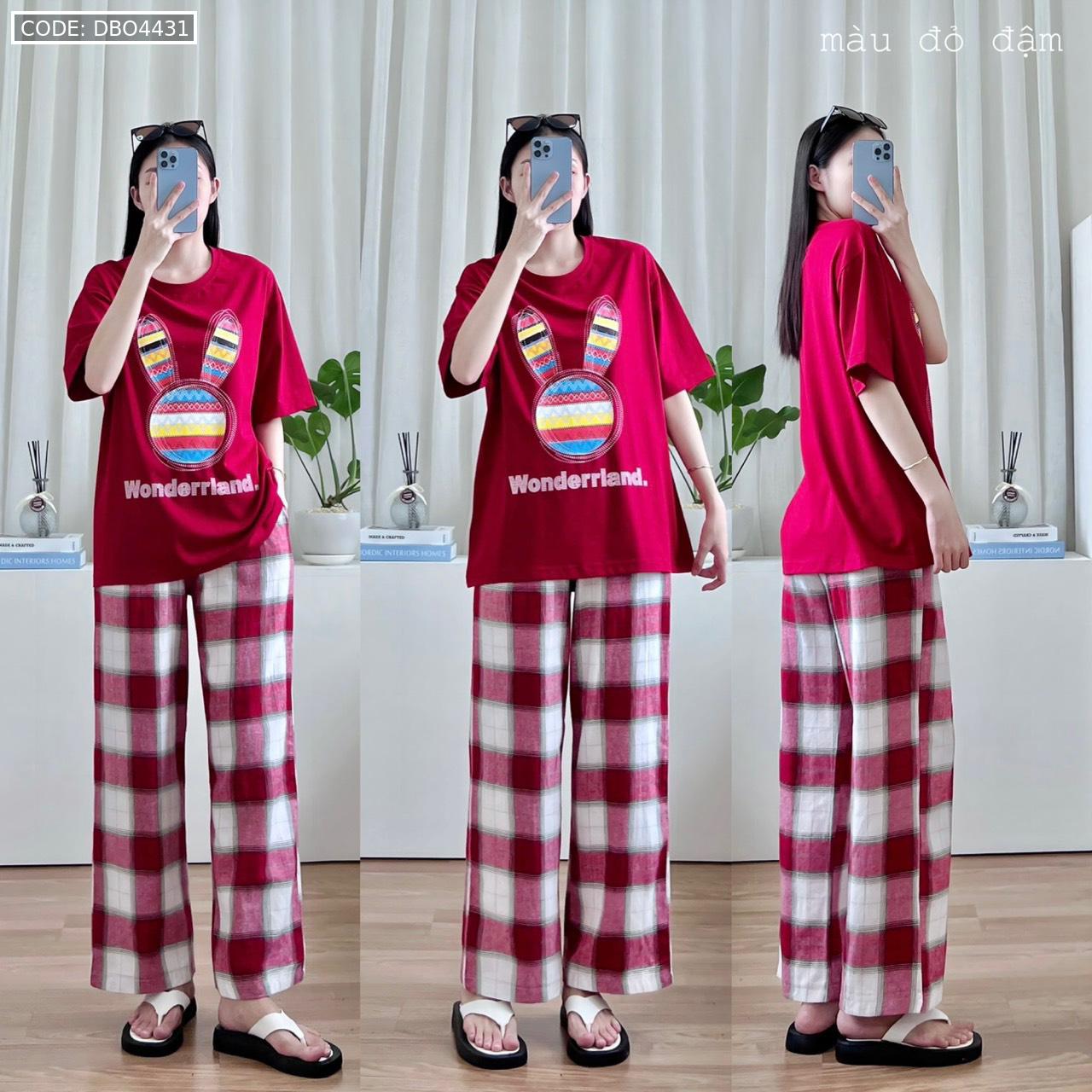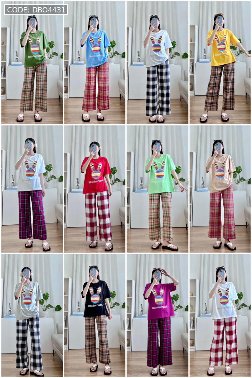Đồ bộ quần dài caro áo tay ngắn in đầu thỏ màu