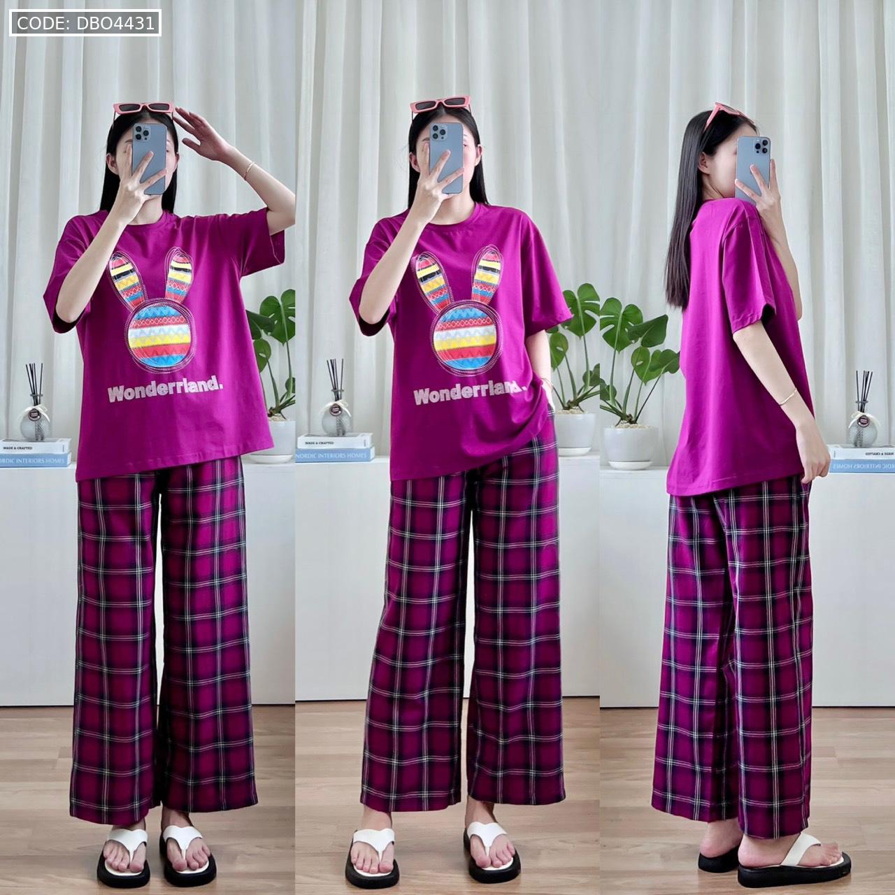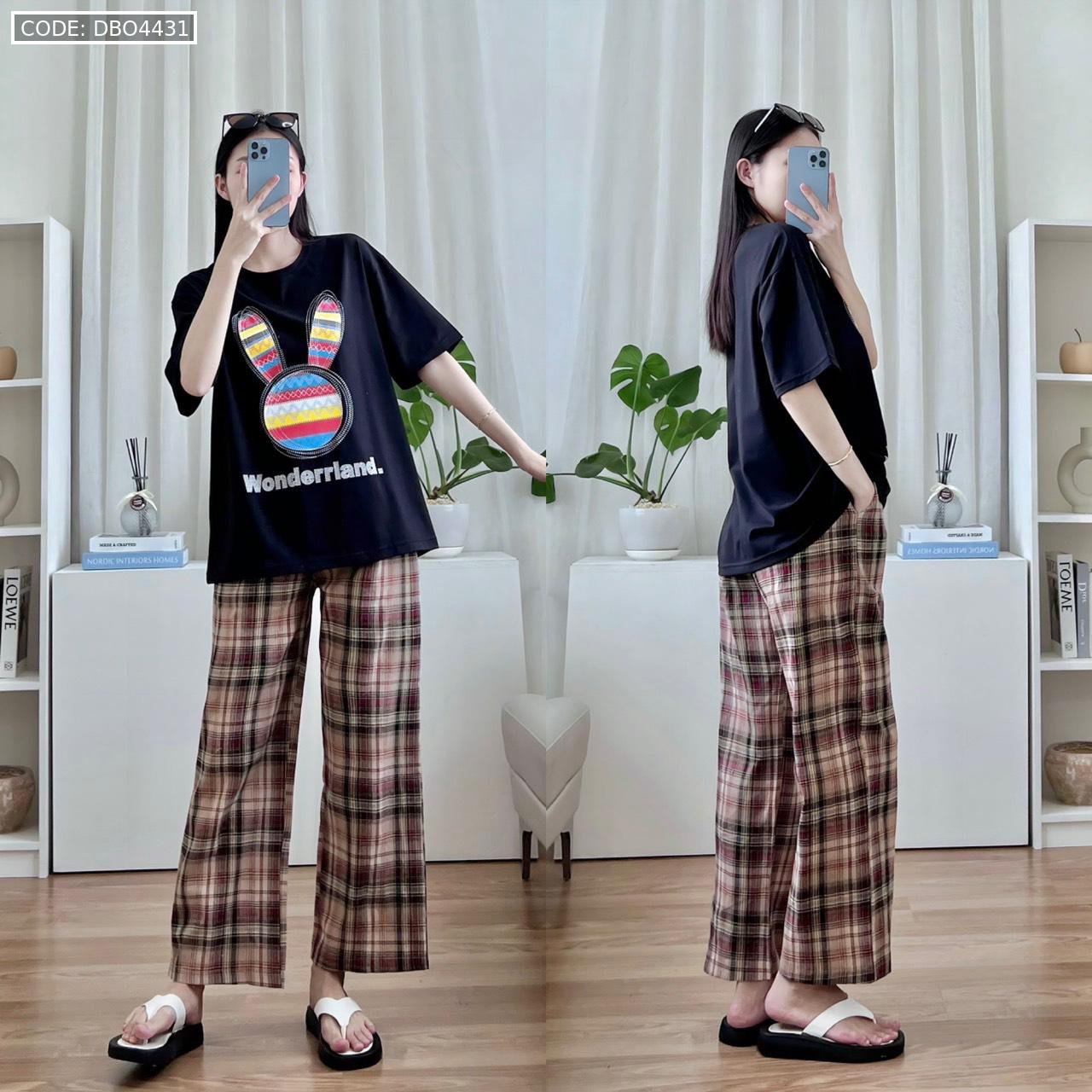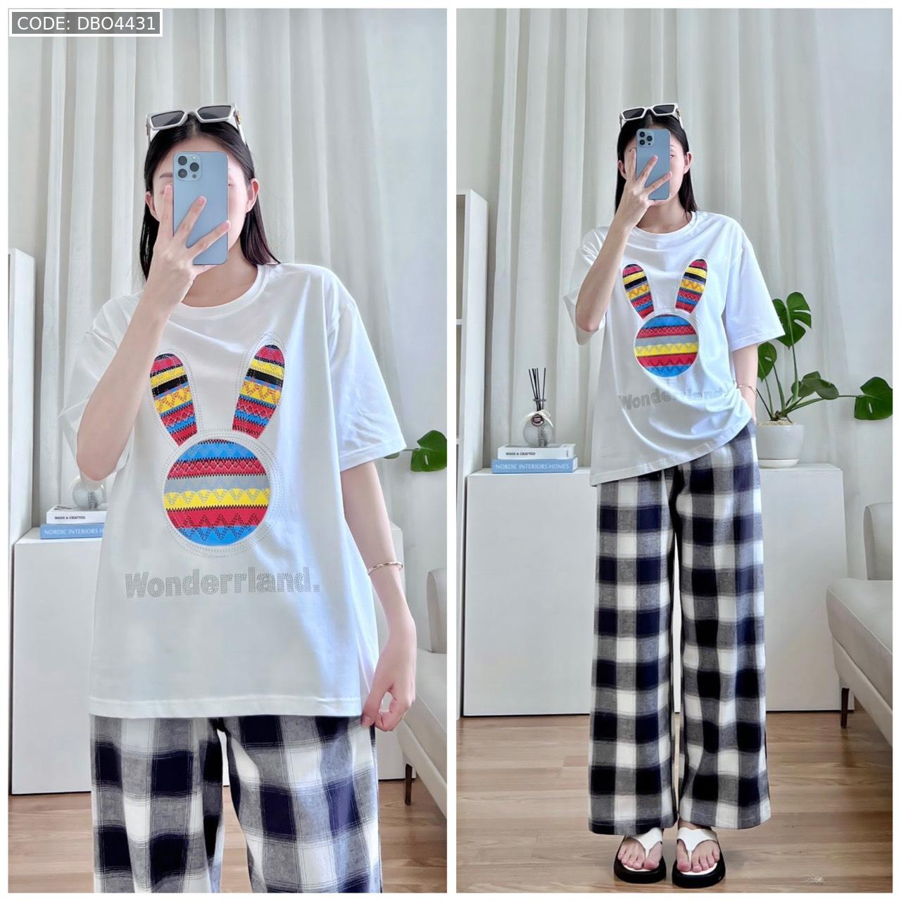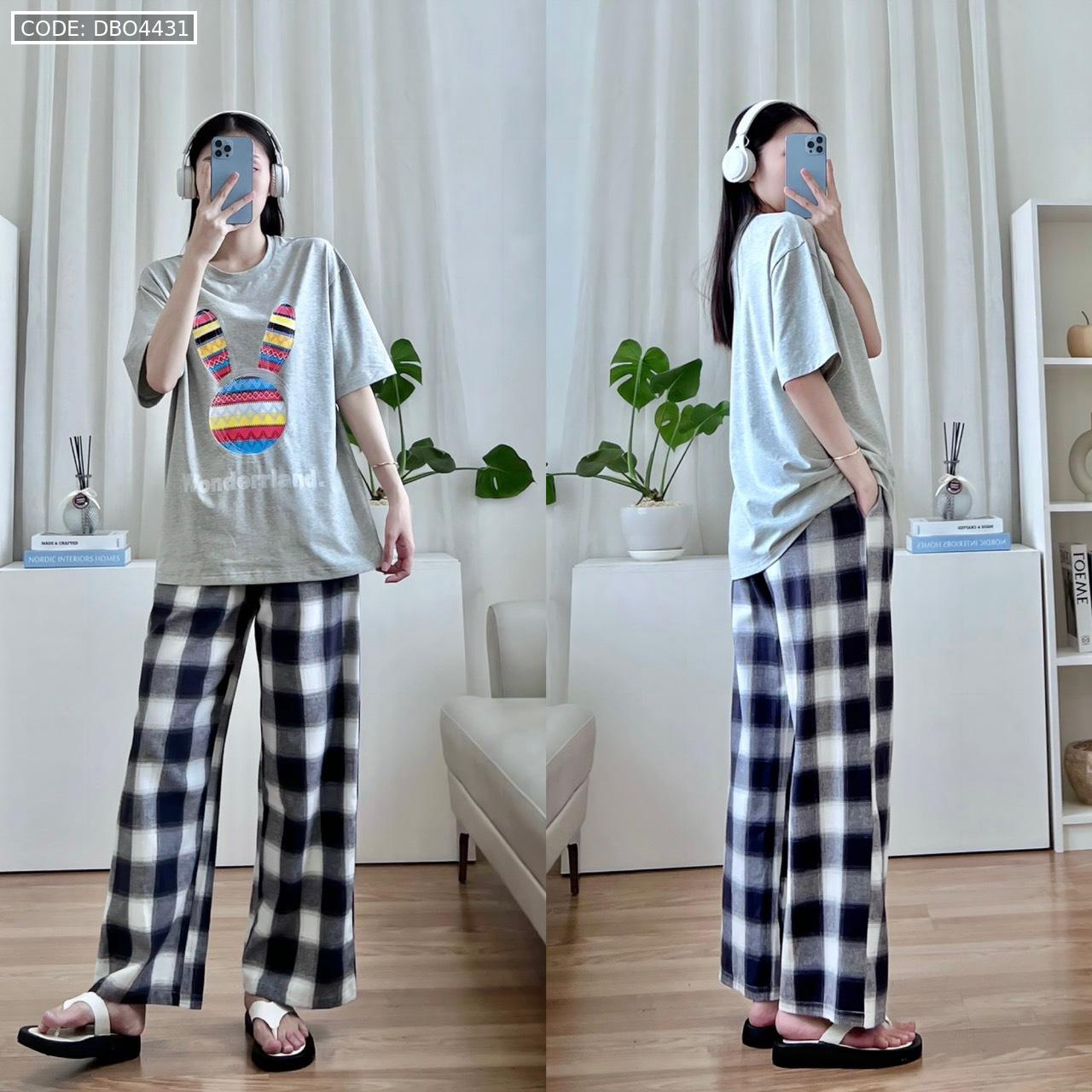 Đồ bộ quần dài caro áo tay ngắn in đầu thỏ màu