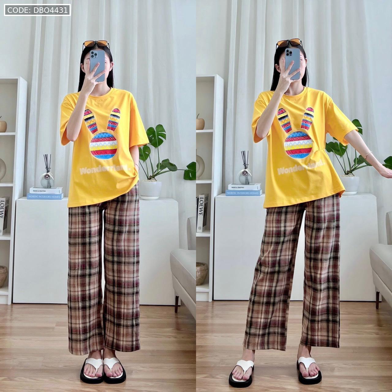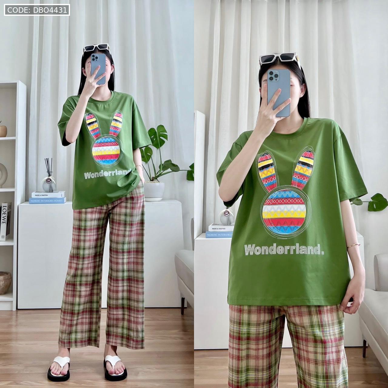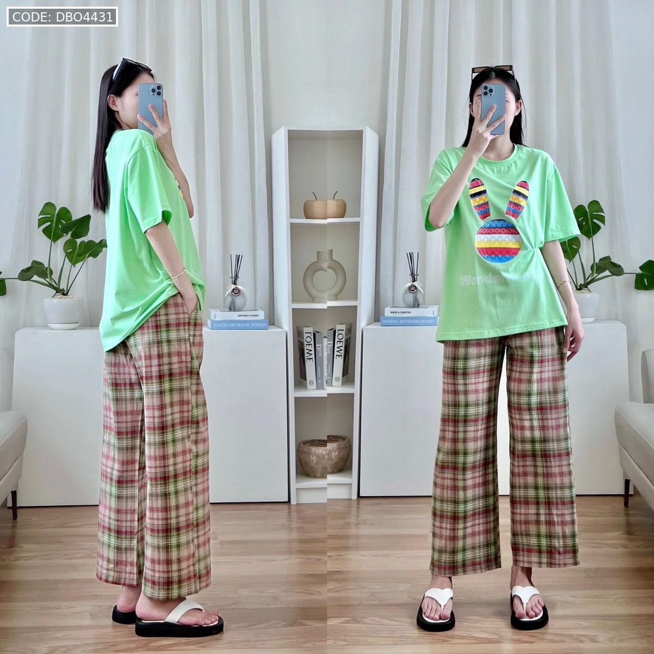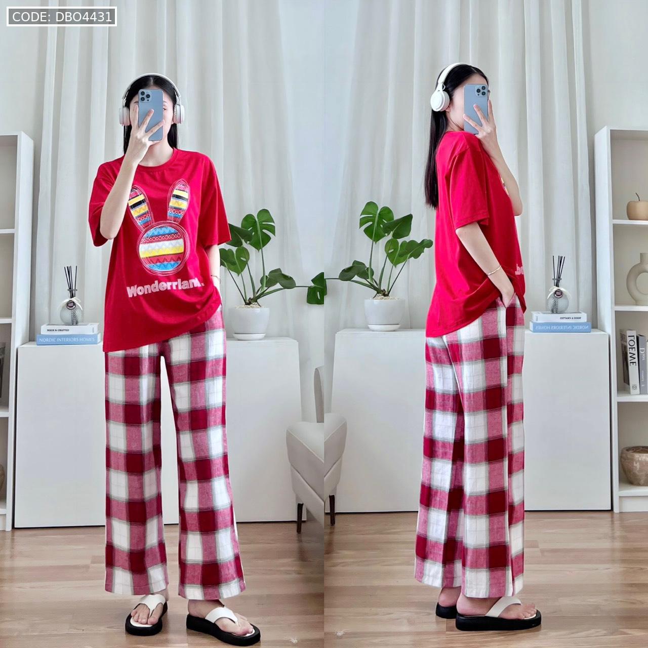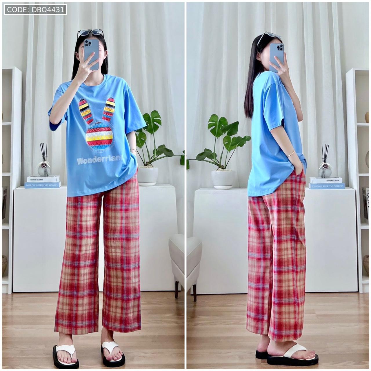 Đồ bộ quần dài caro áo tay ngắn in đầu thỏ màu