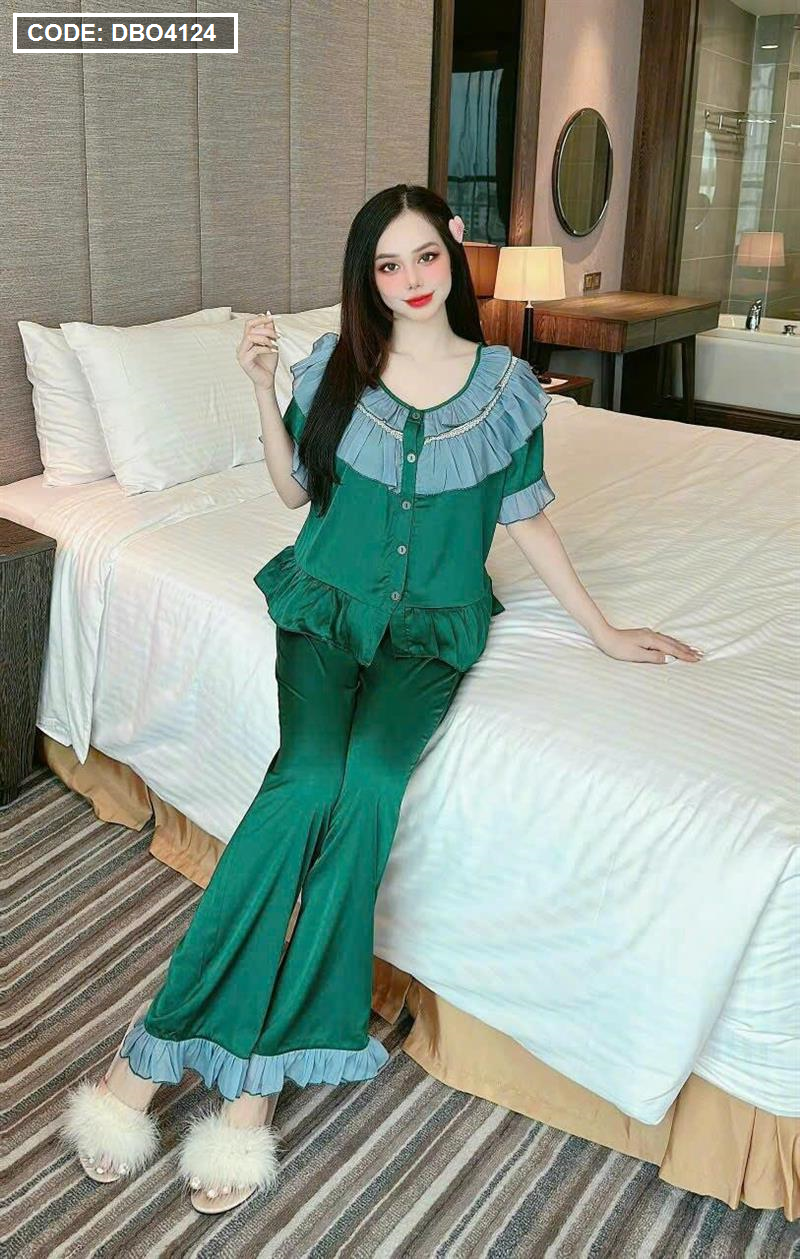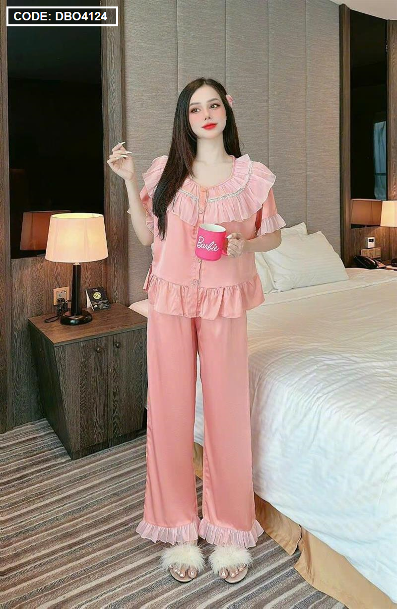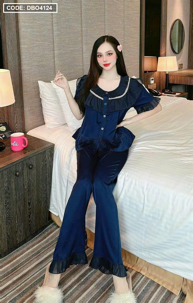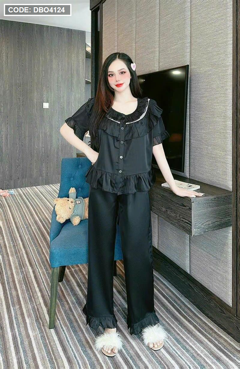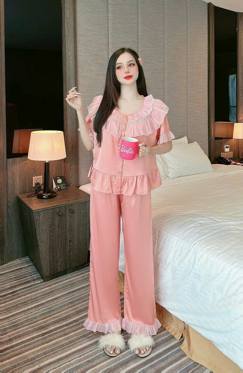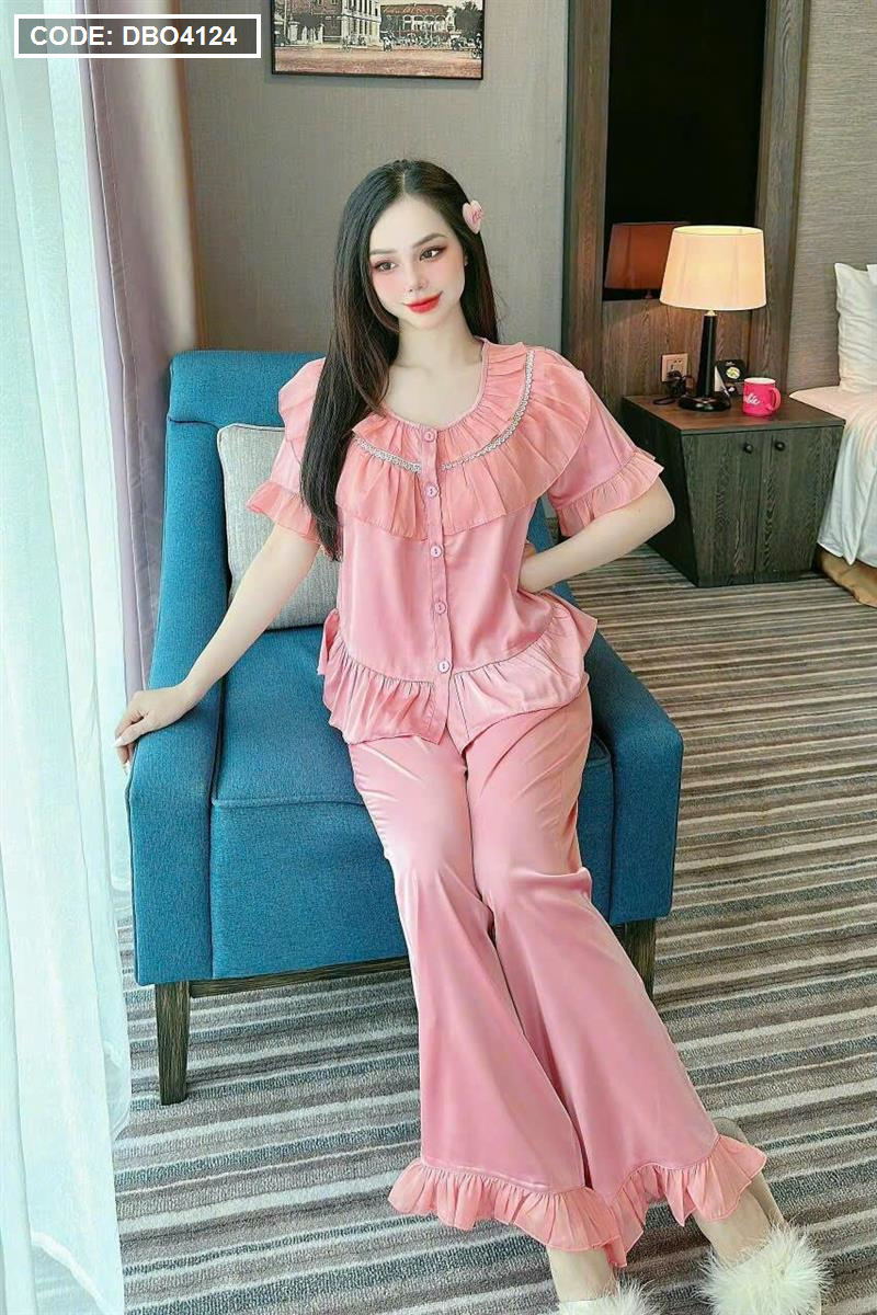 Đồ bộ quần dài pijama áo tay ngắn bèo cổ tròn viền bèo
