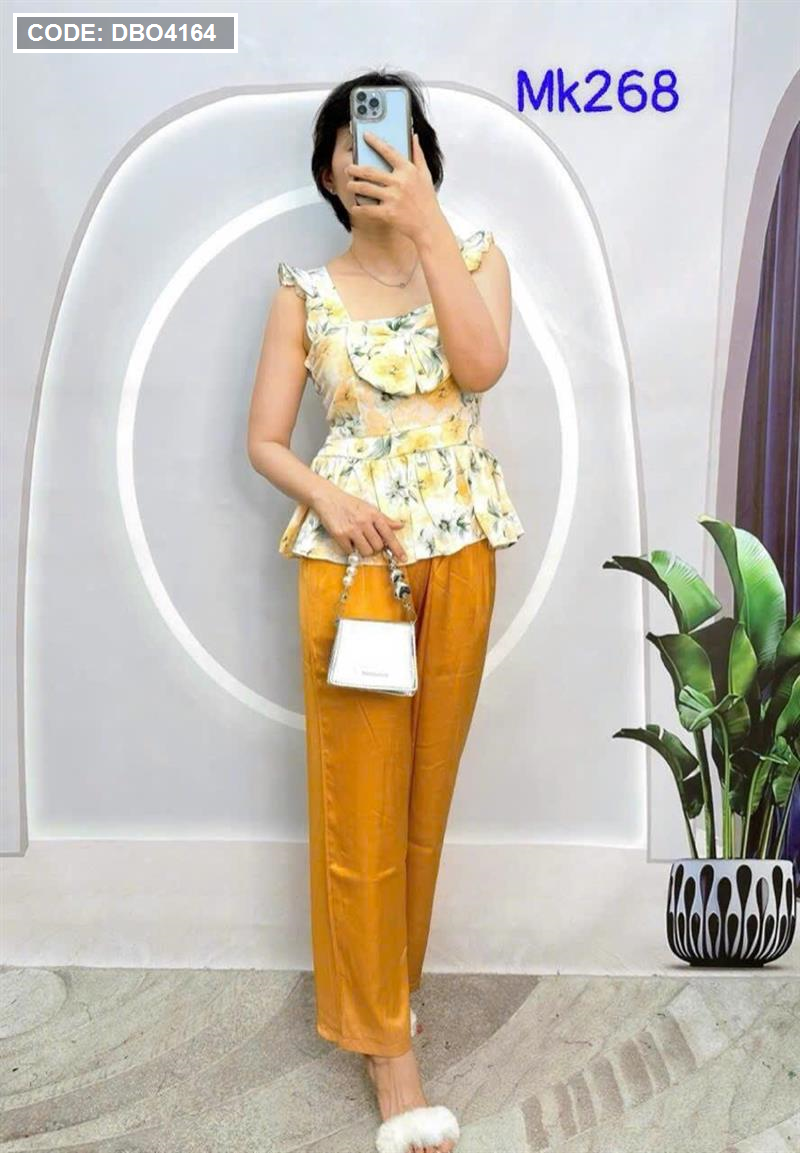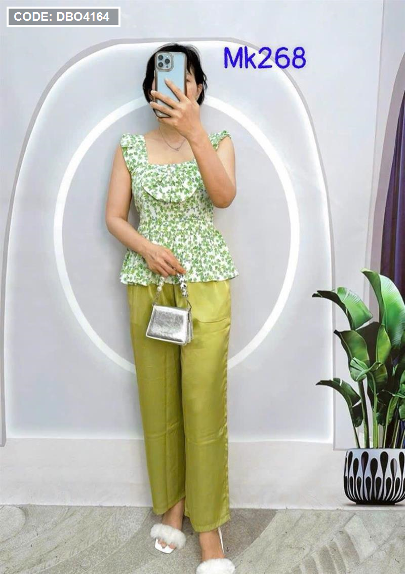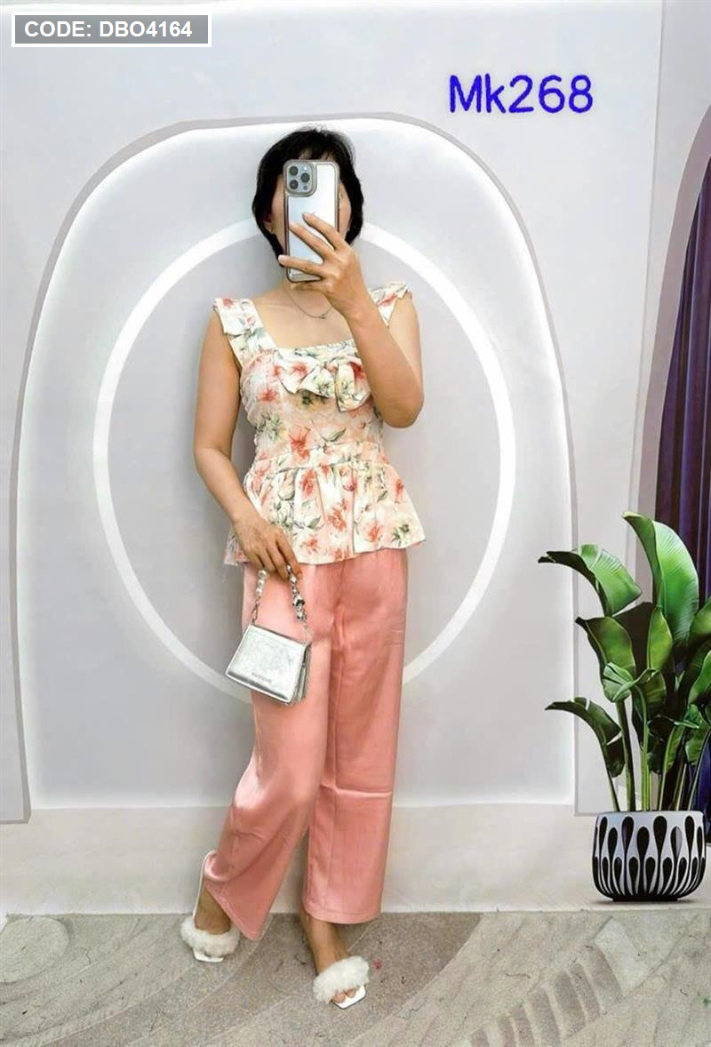 Đồ bộ quần dài trơn áo dây cổ vuông hoạ tiết