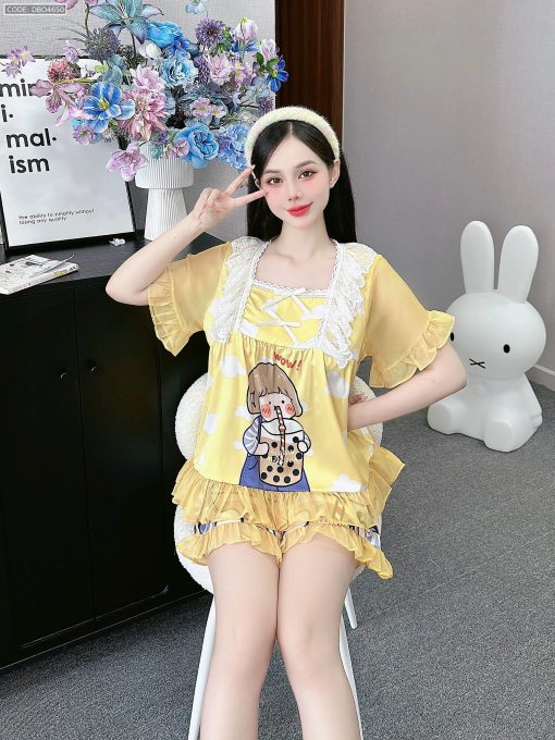 Đồ bộ quần đùi áo cổ vuông ren bèo nhiều hình dễ thương
