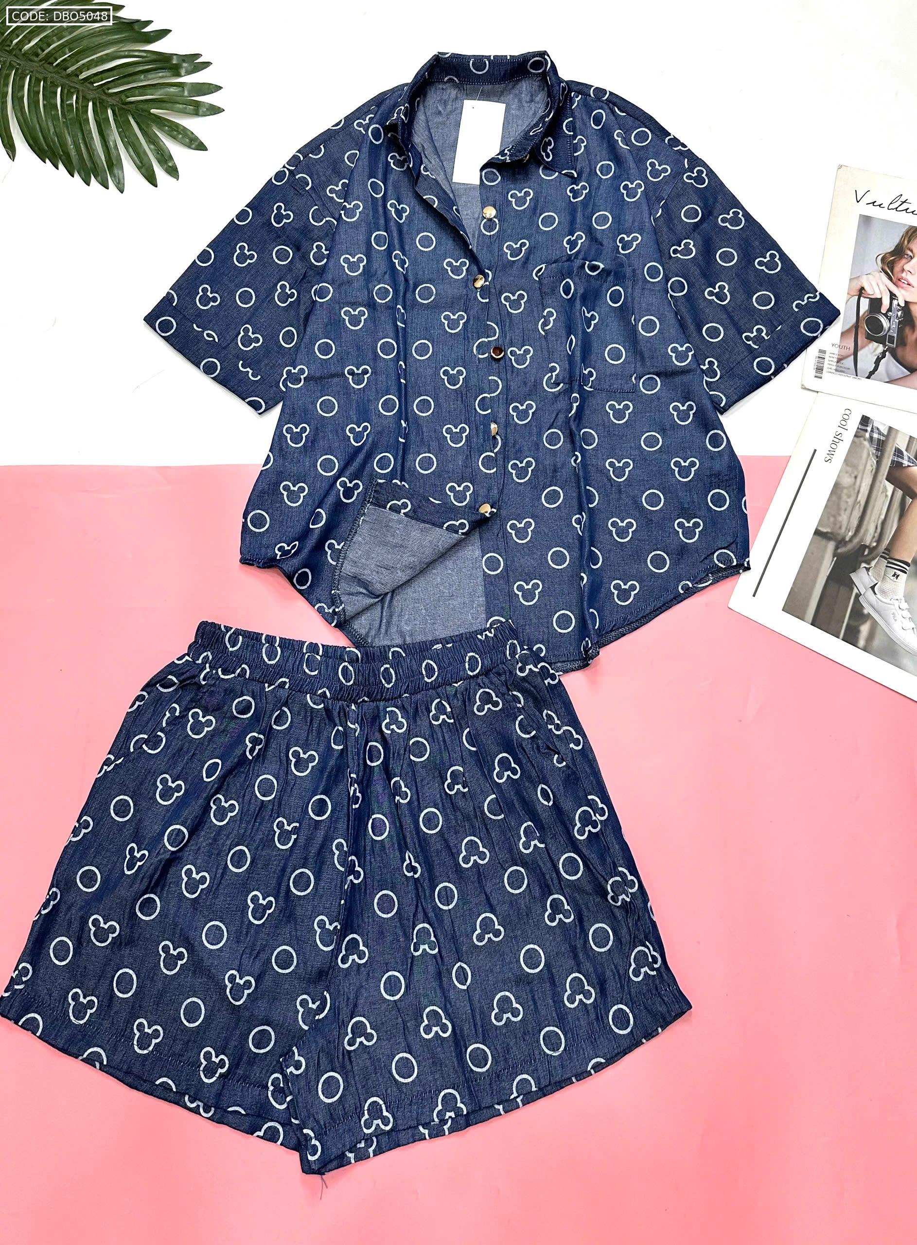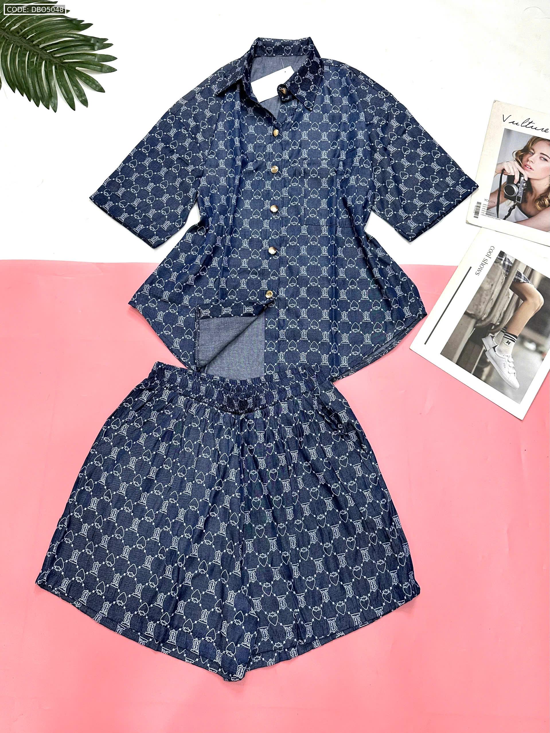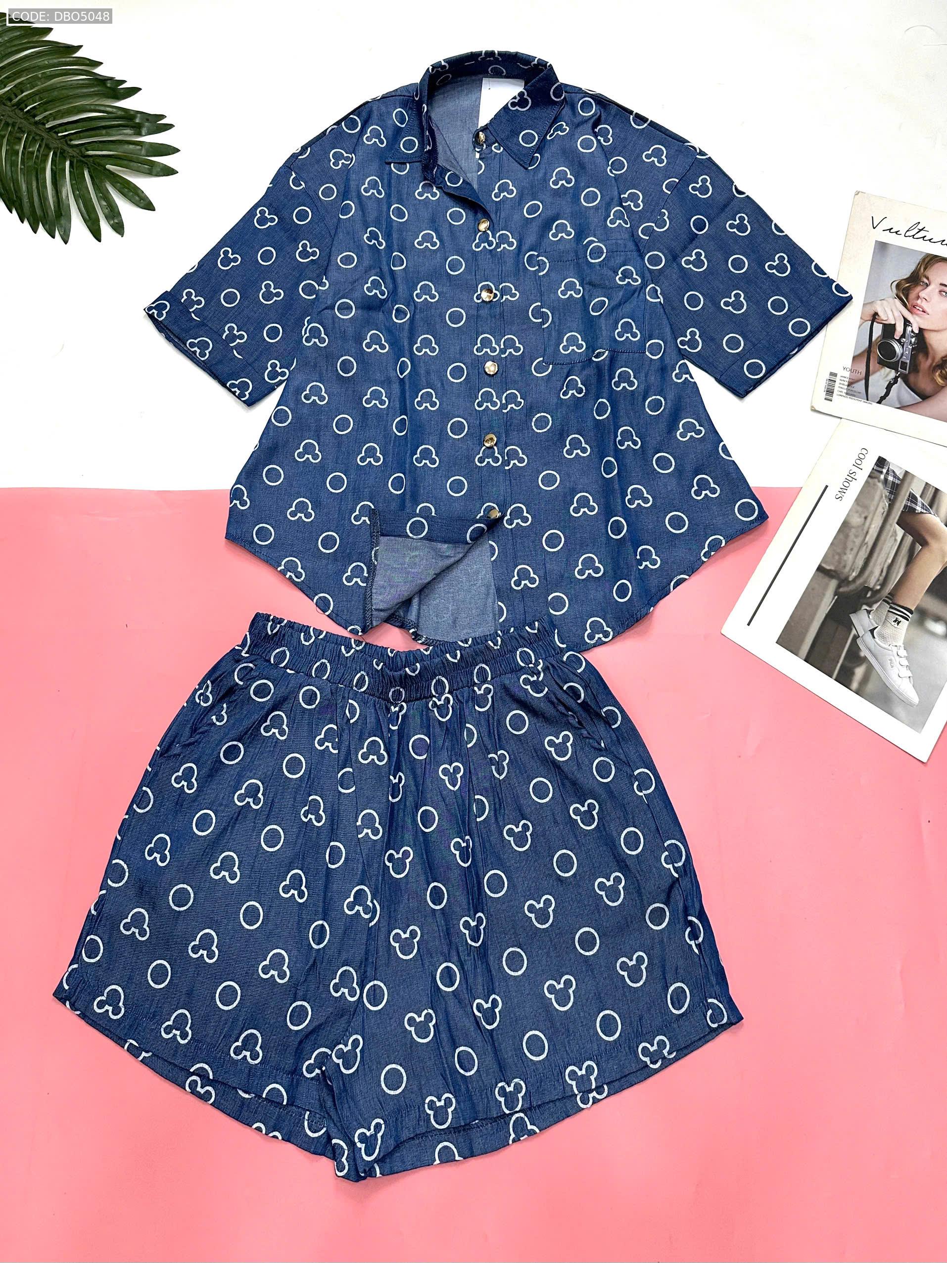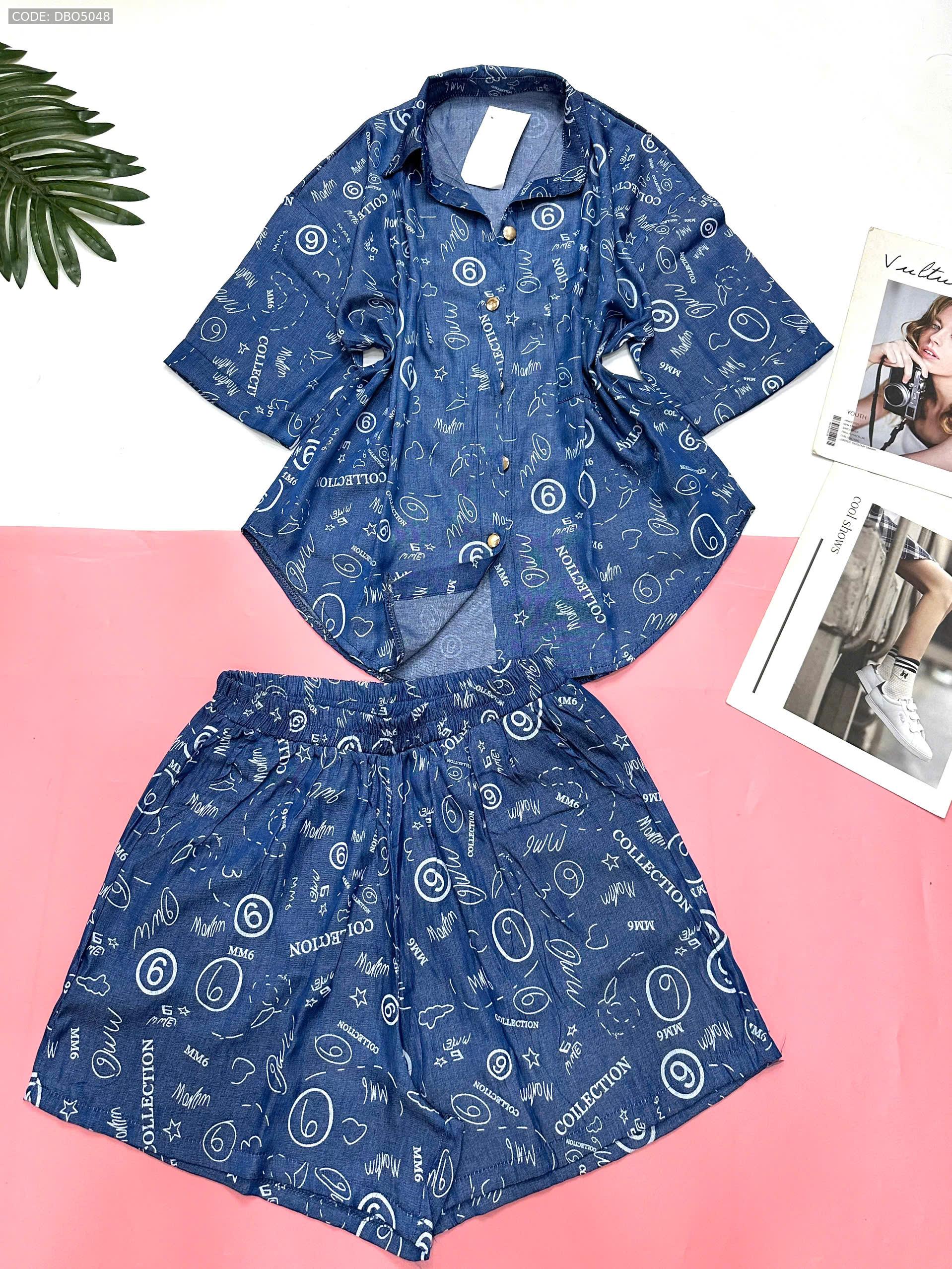 Đồ bộ quần đùi áo sơ mi tay ngắn jean in