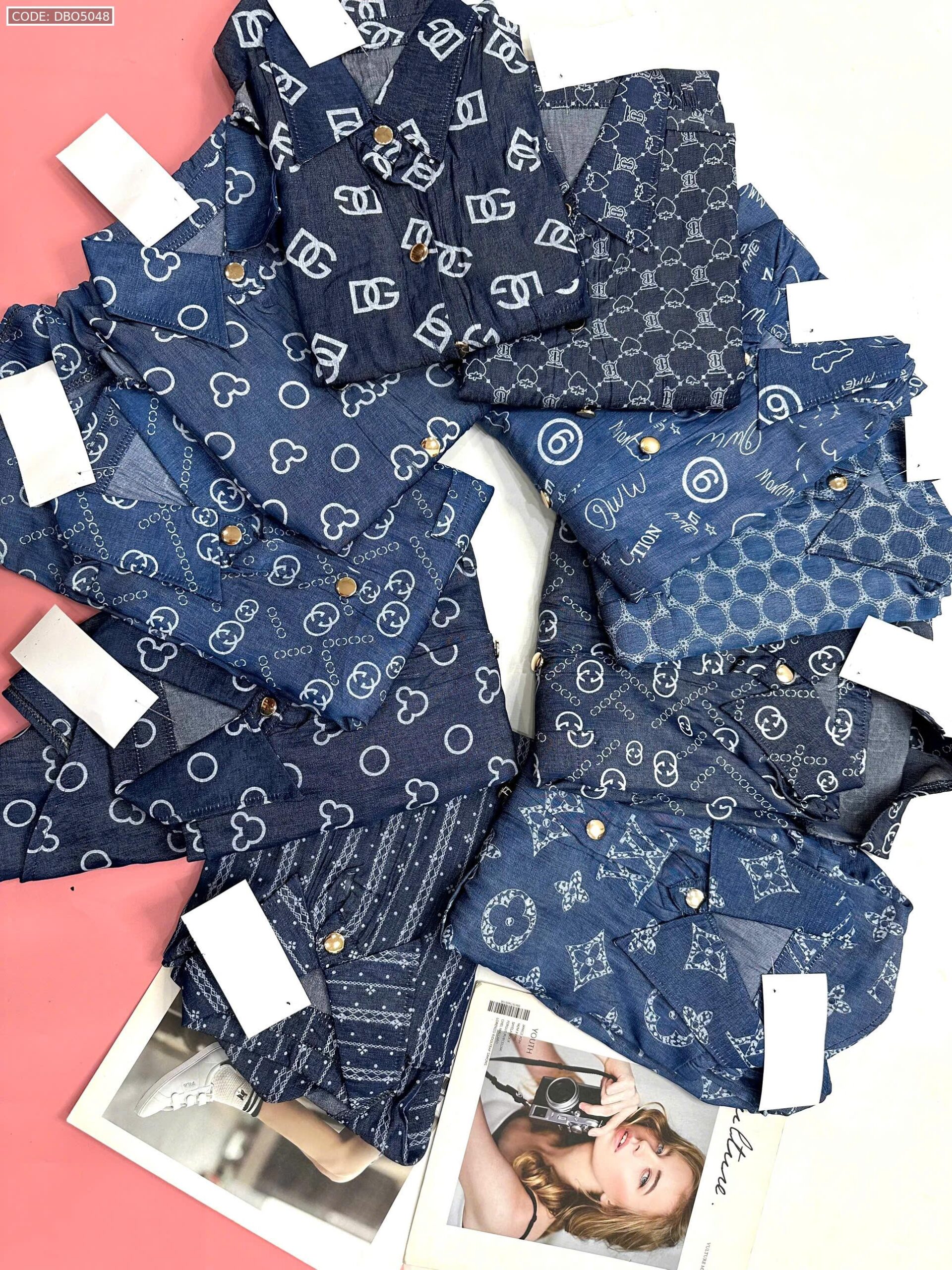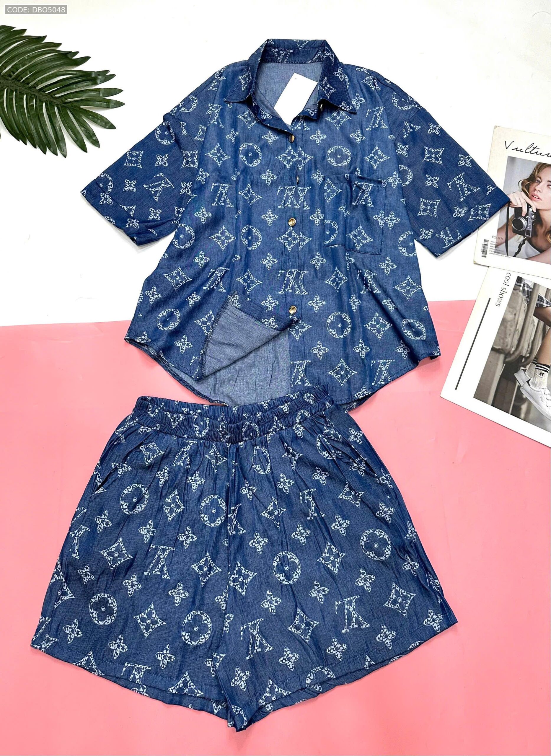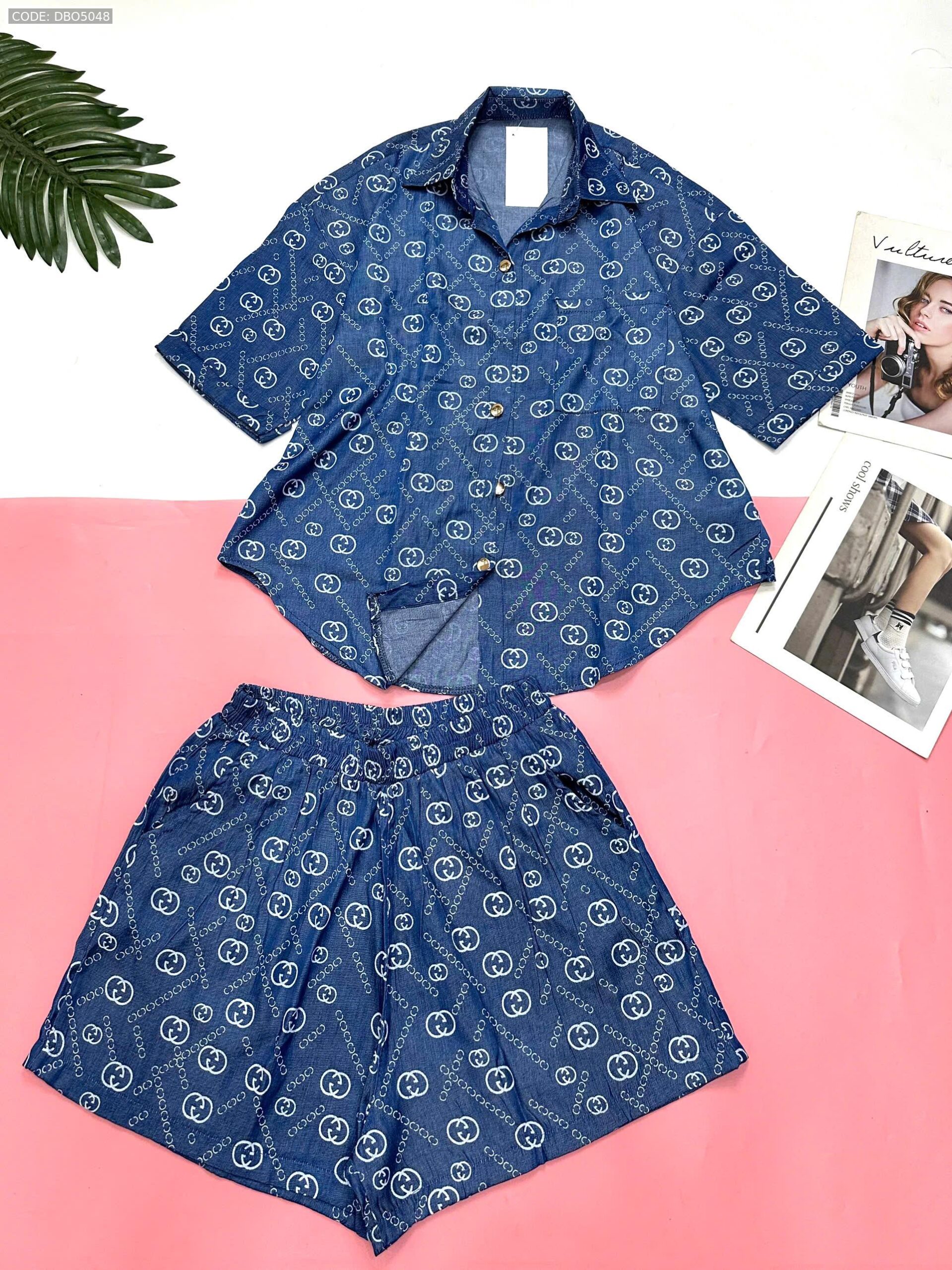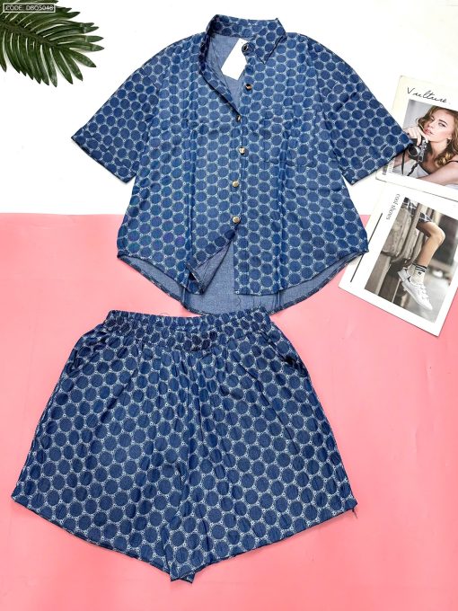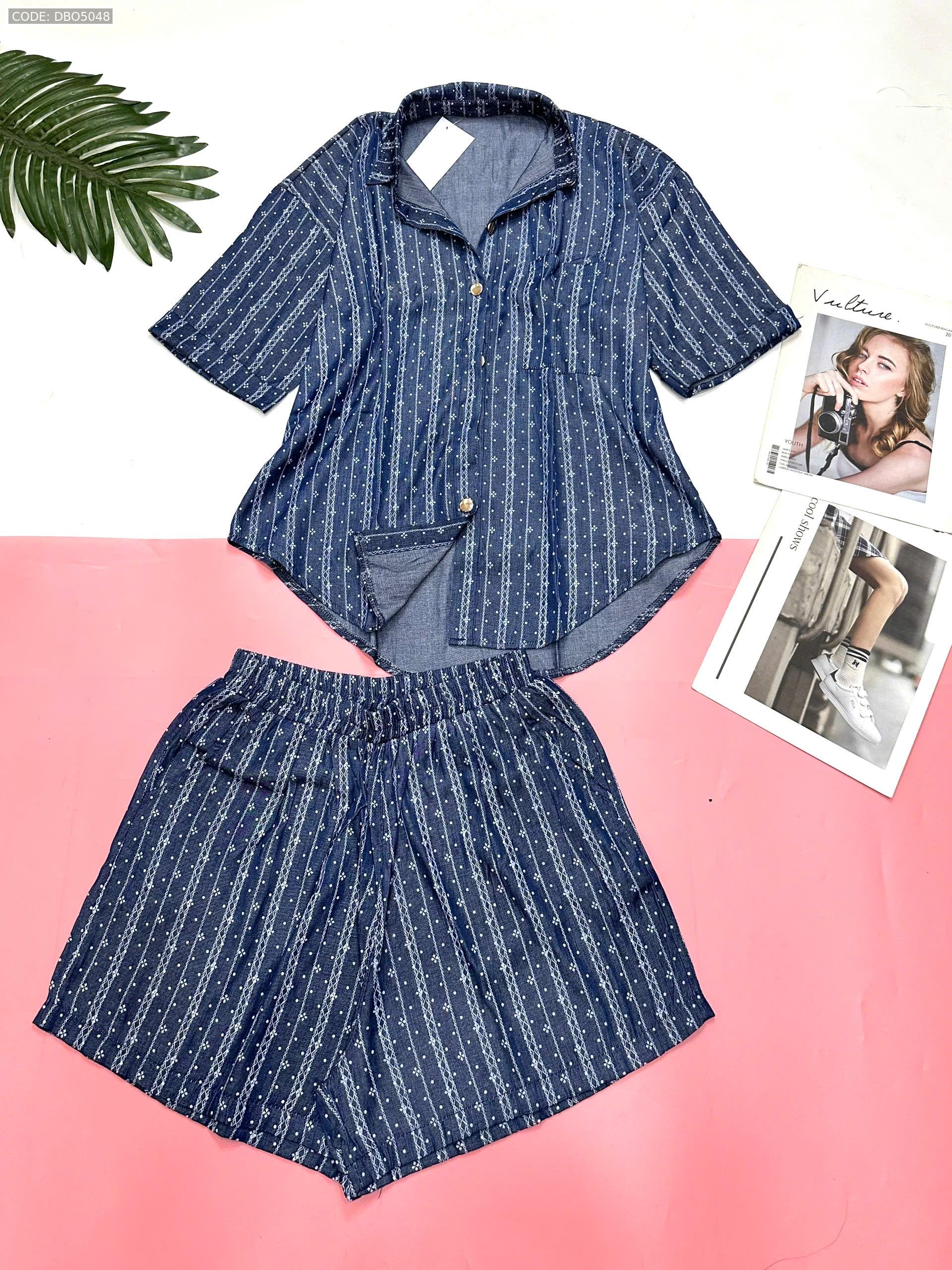 Đồ bộ quần đùi áo sơ mi tay ngắn jean in