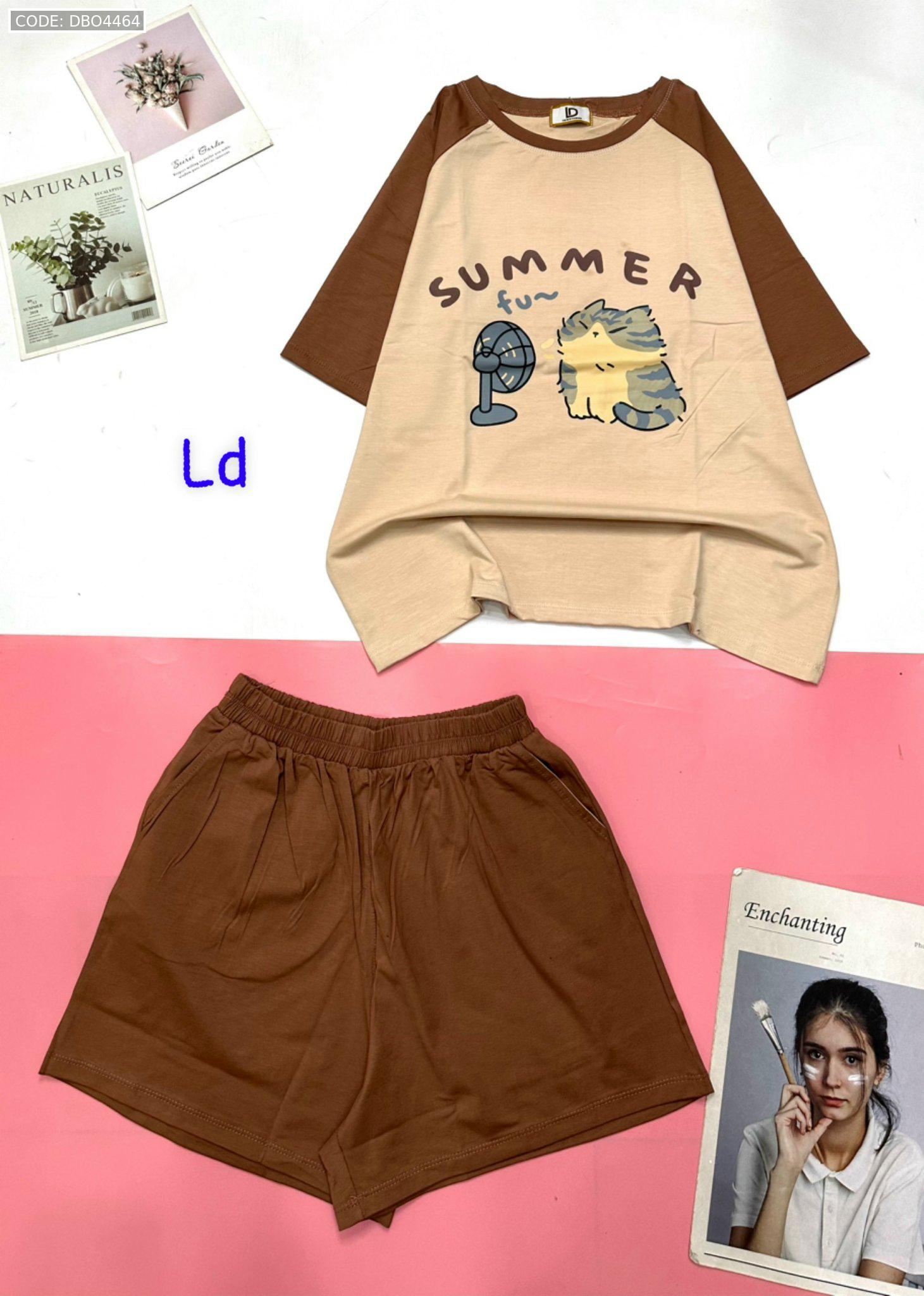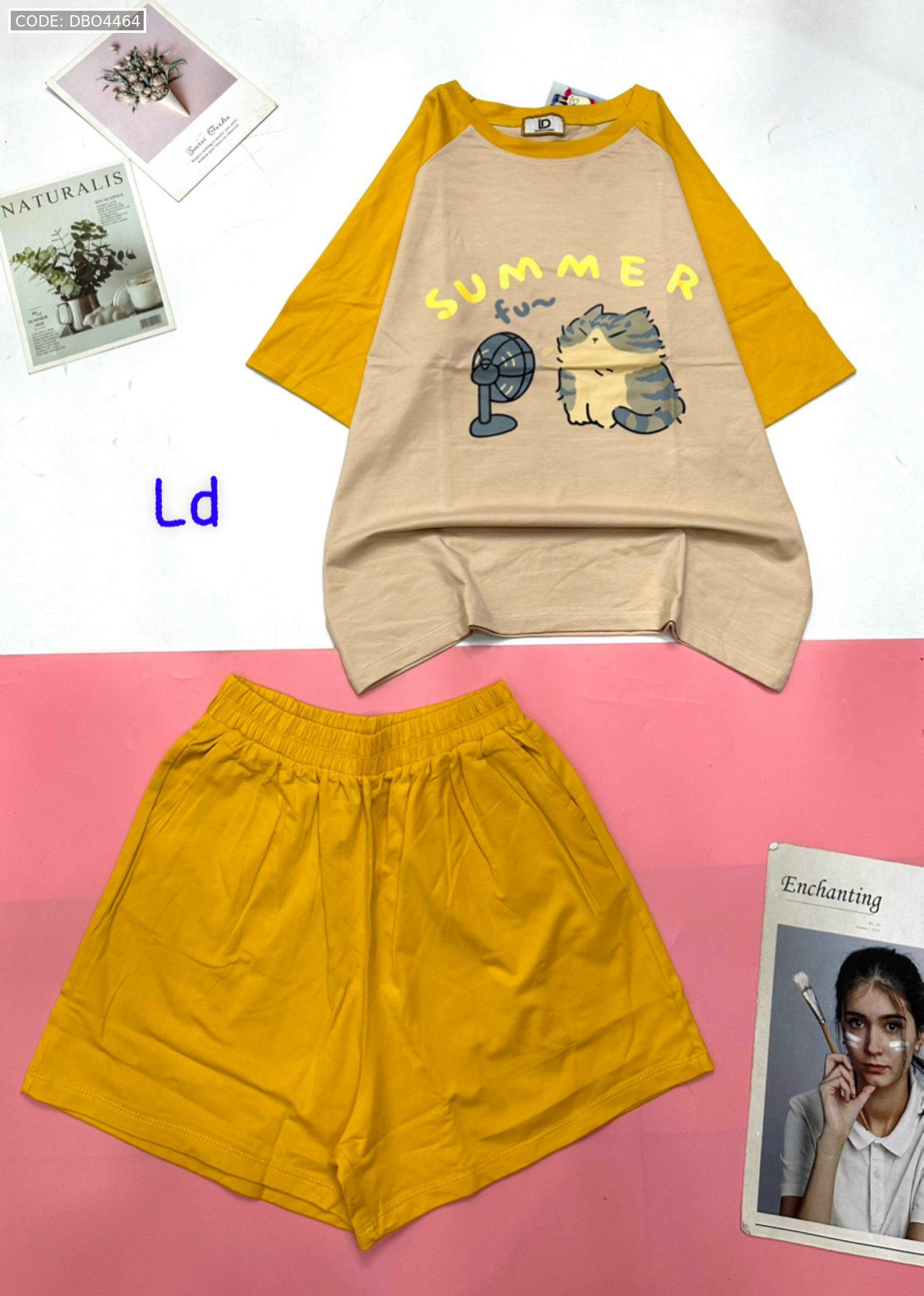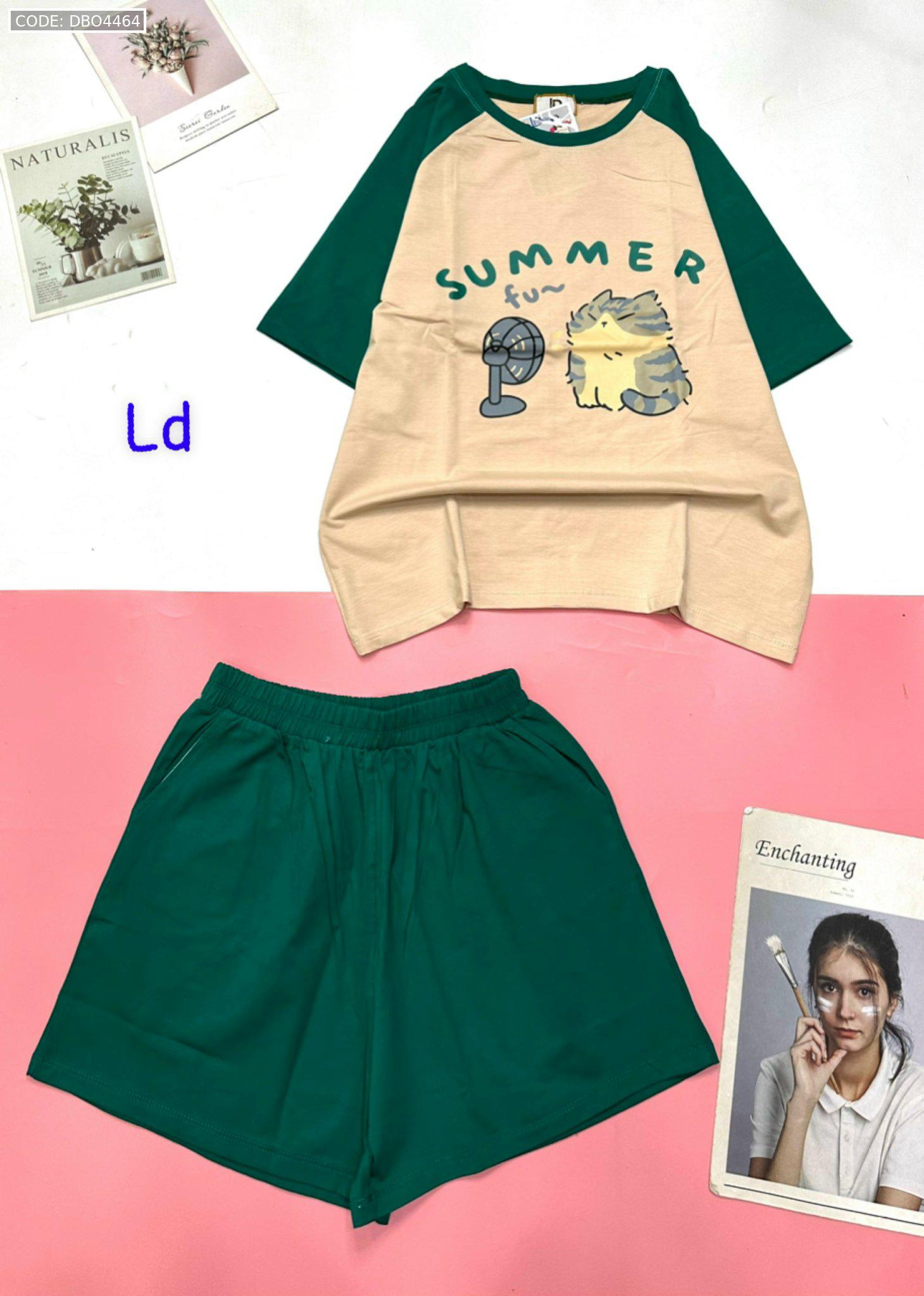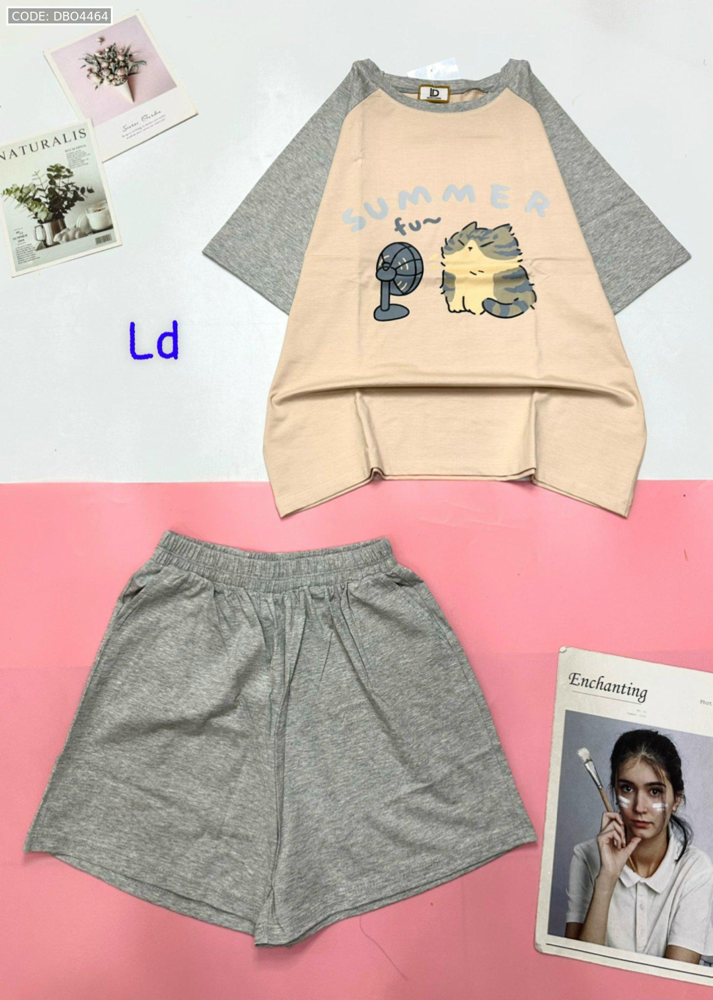 Đồ bộ quần đùi áo tay ngắn in hình chú mèo ngồi quạt