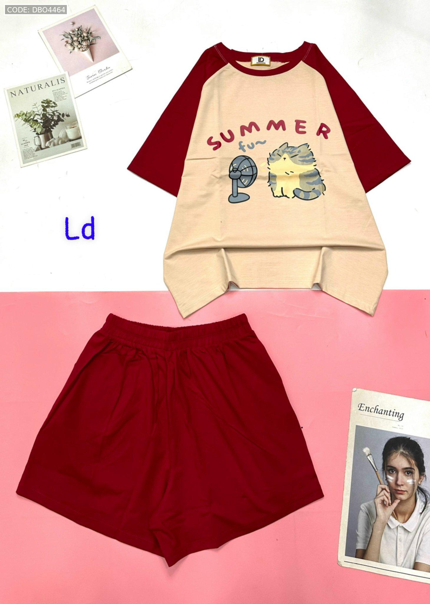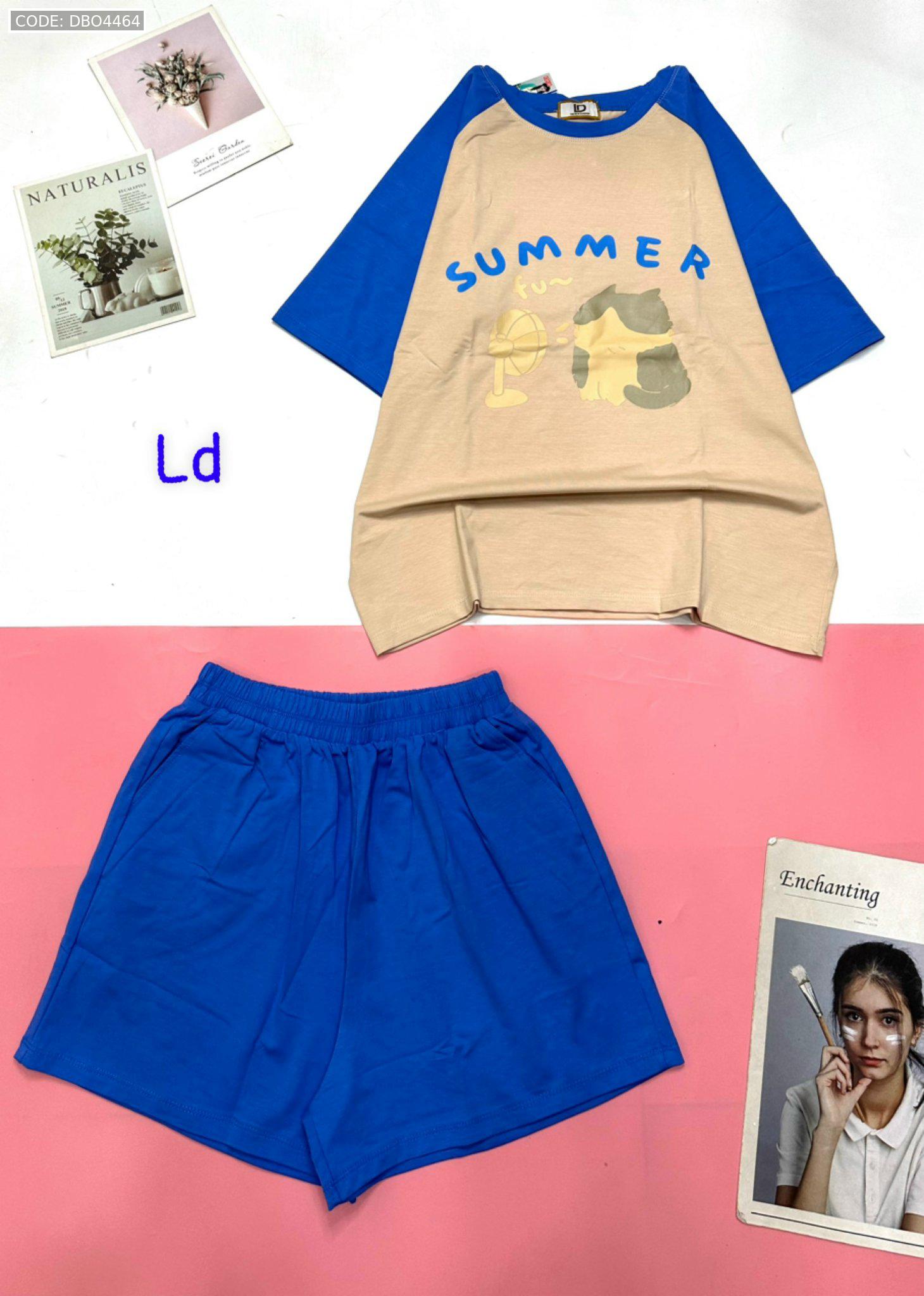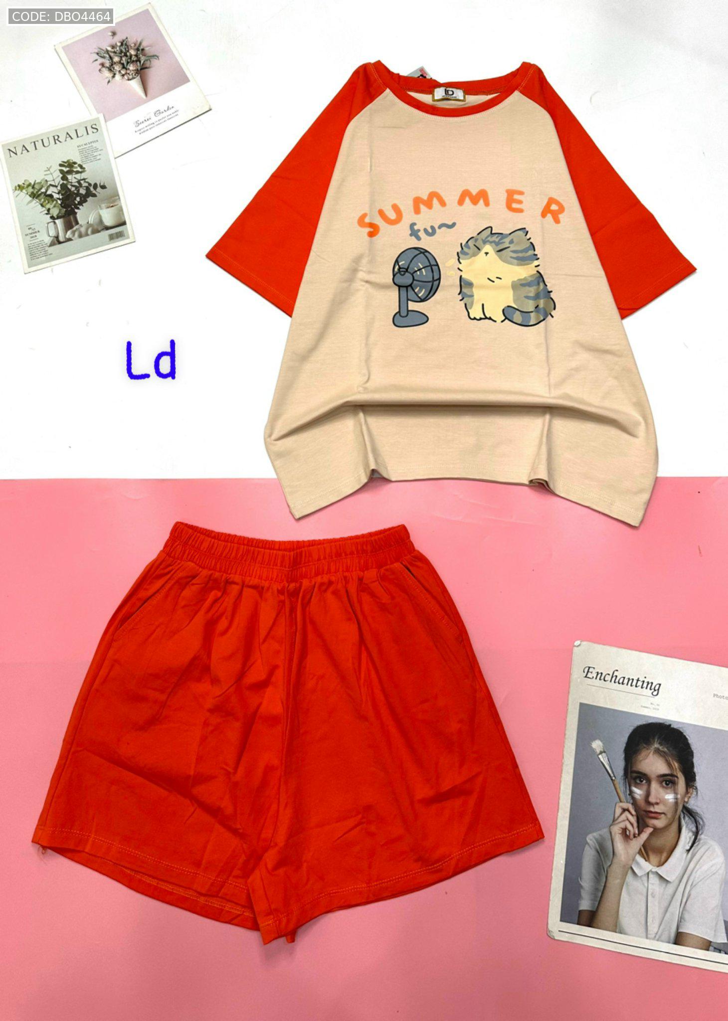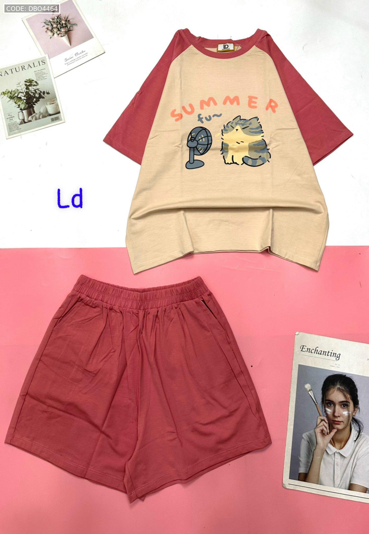 Đồ bộ quần đùi áo tay ngắn in hình chú mèo ngồi quạt