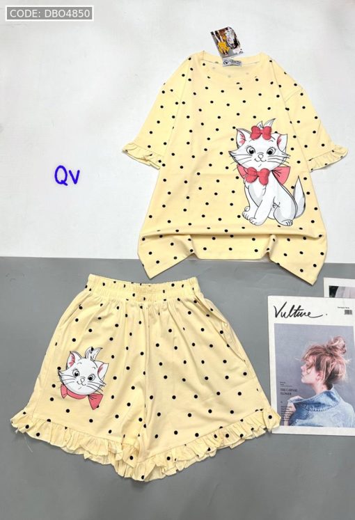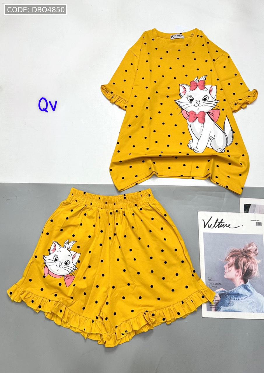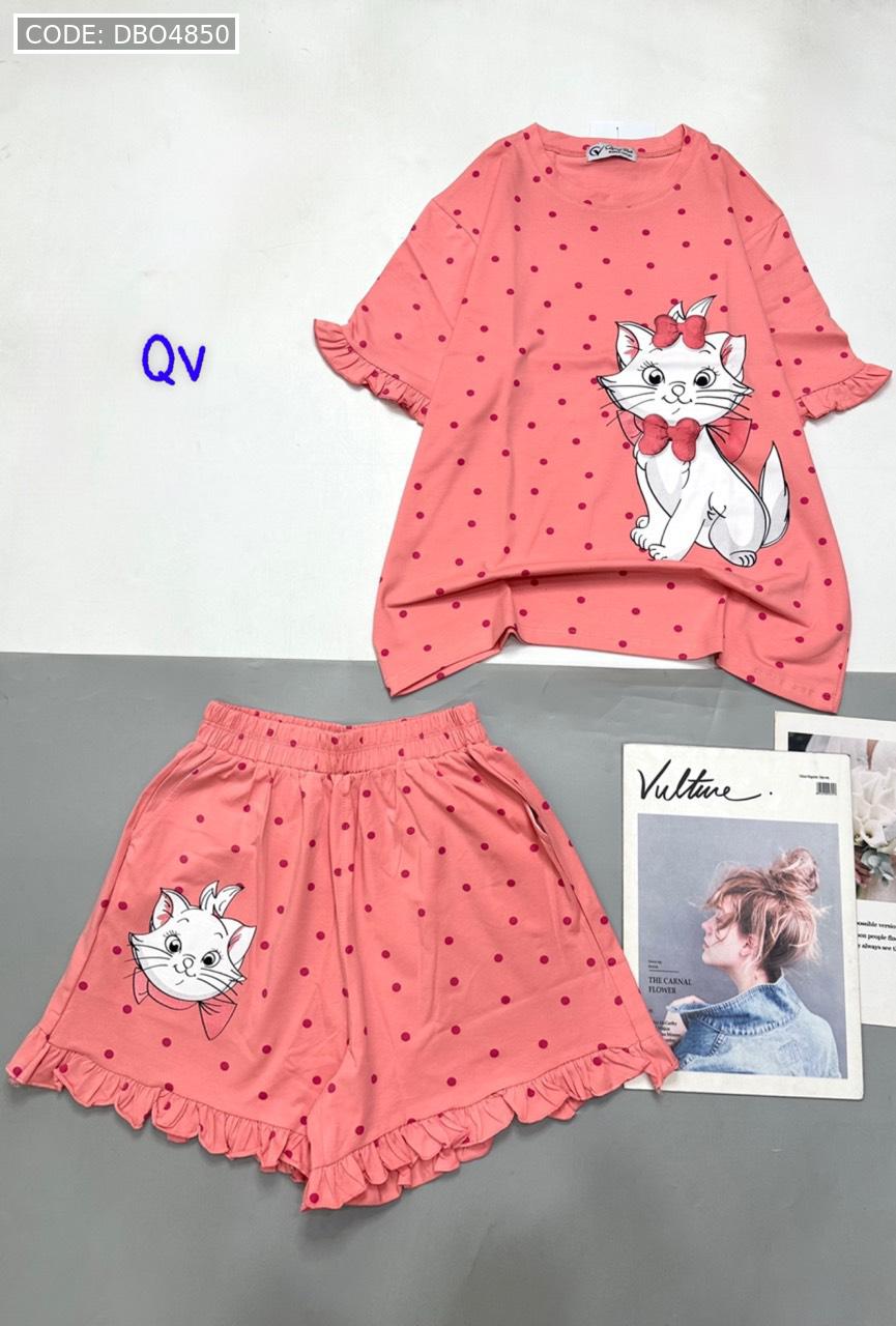 Đồ bộ quần đùi bèo áo tay phồng bèo in hình mèo kitty chấm bi