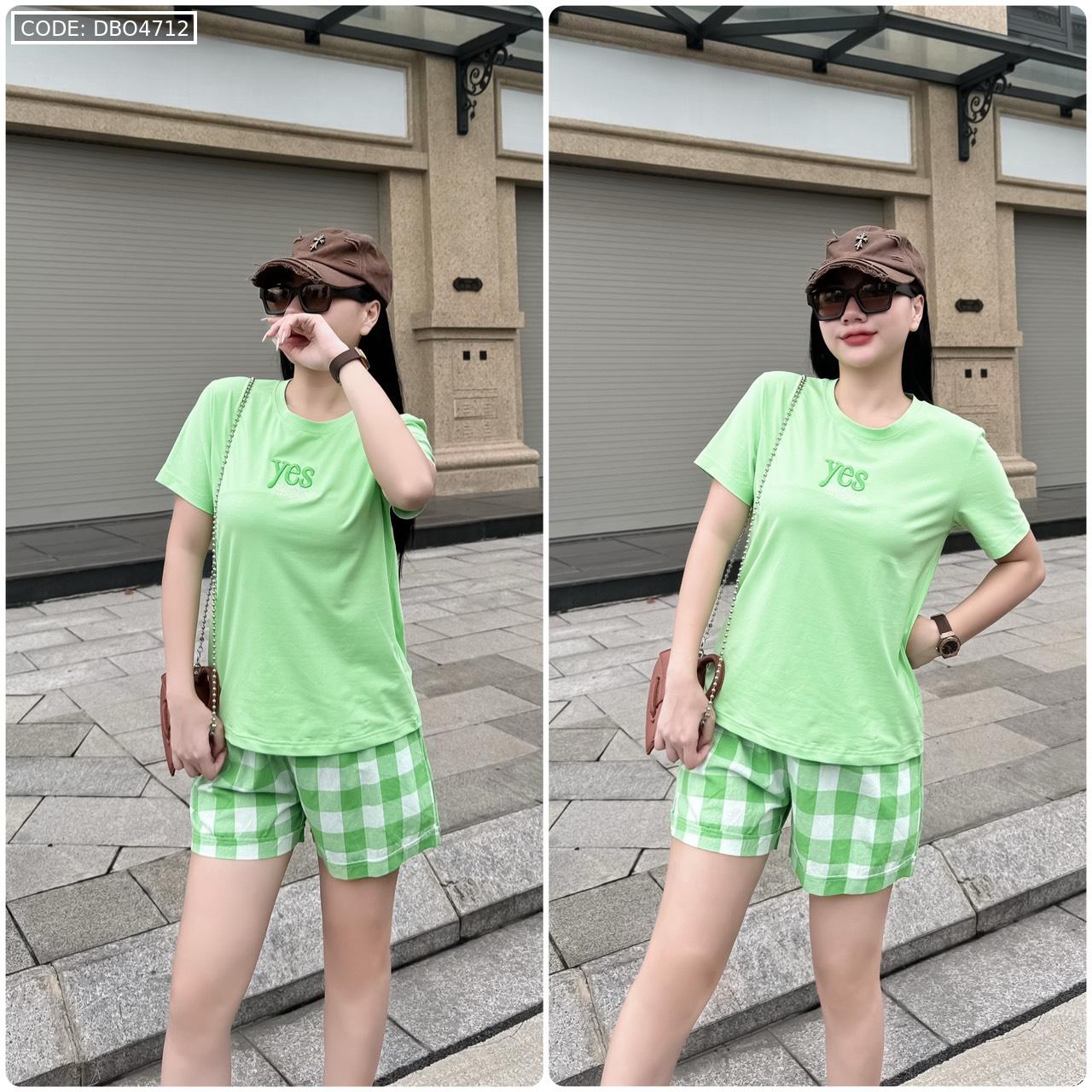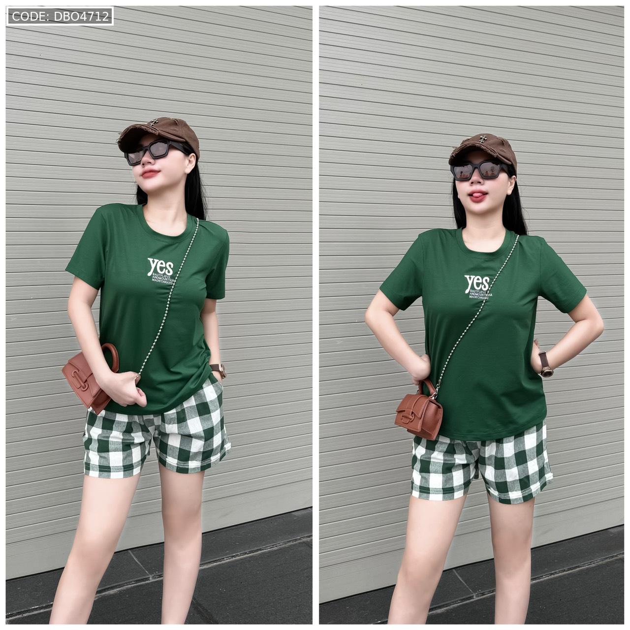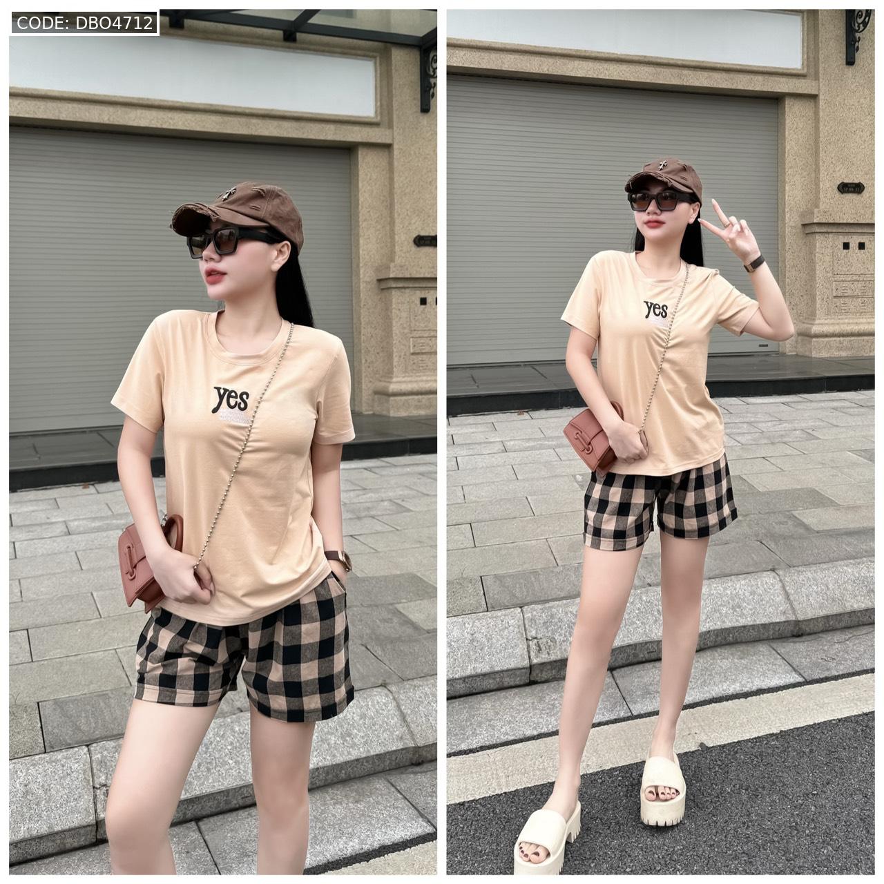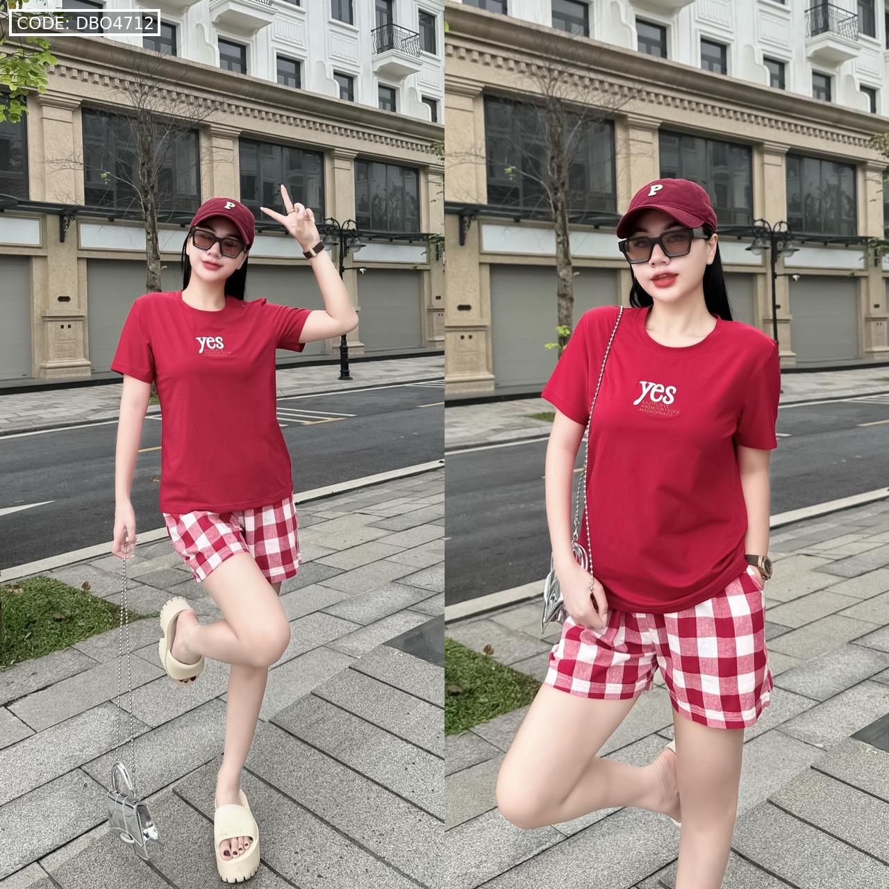 Đồ bộ quần đùi ca rô nhỏ áo thun in chữ Yes