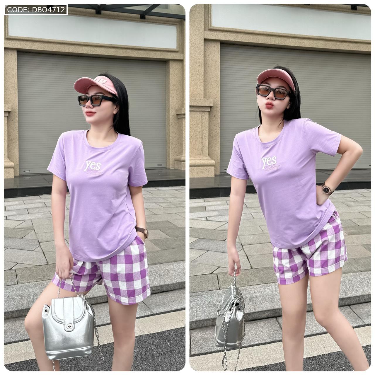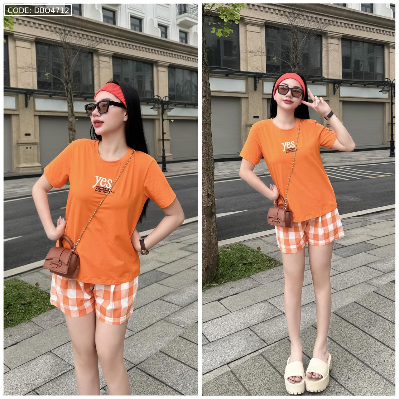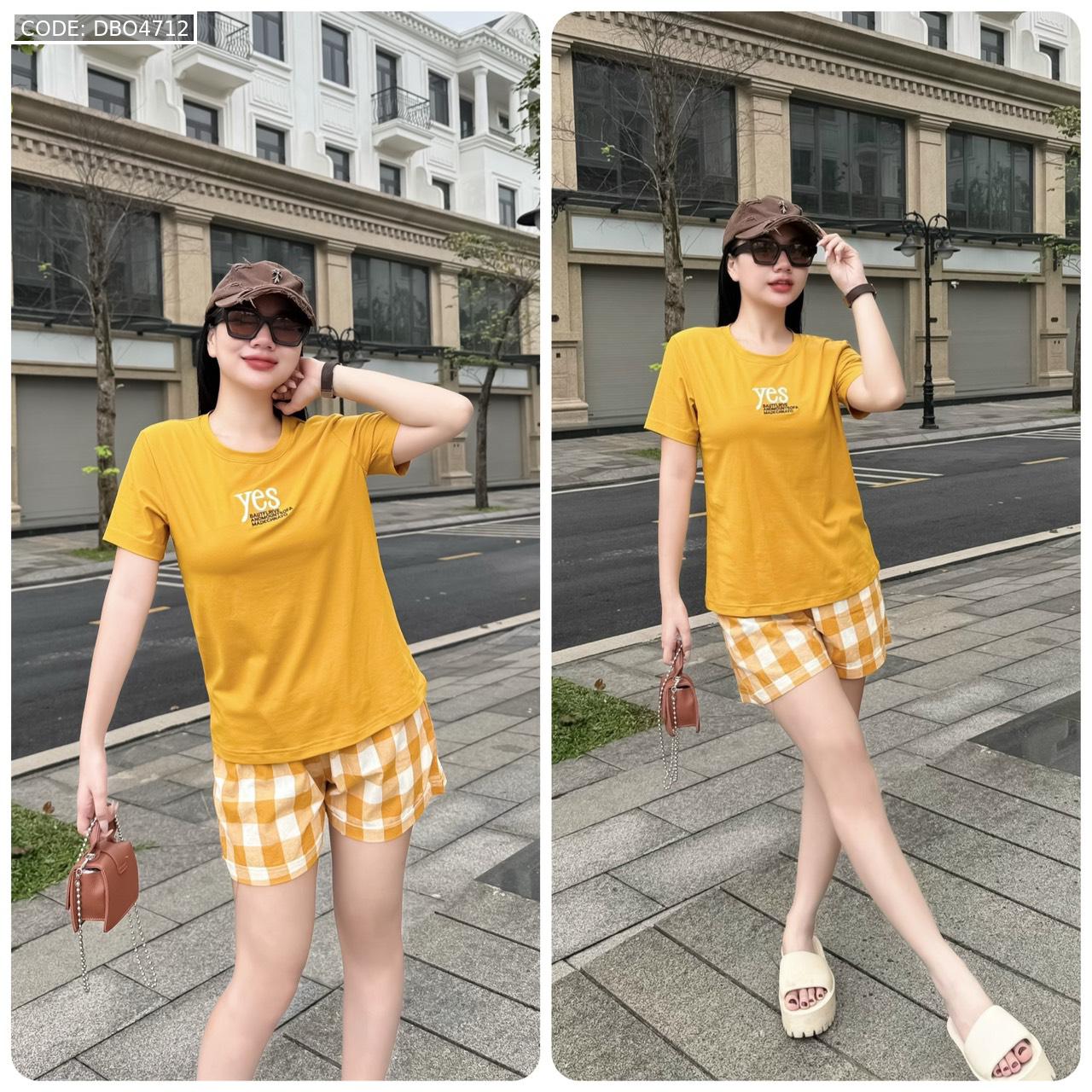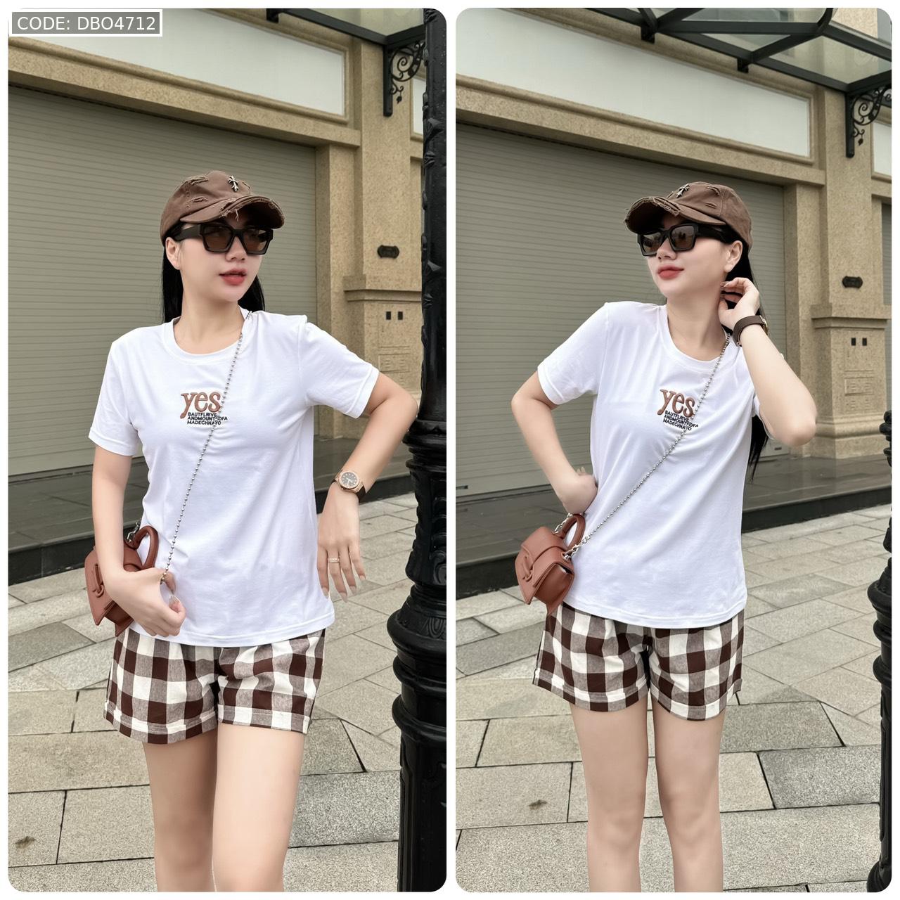 Đồ bộ quần đùi ca rô nhỏ áo thun in chữ Yes