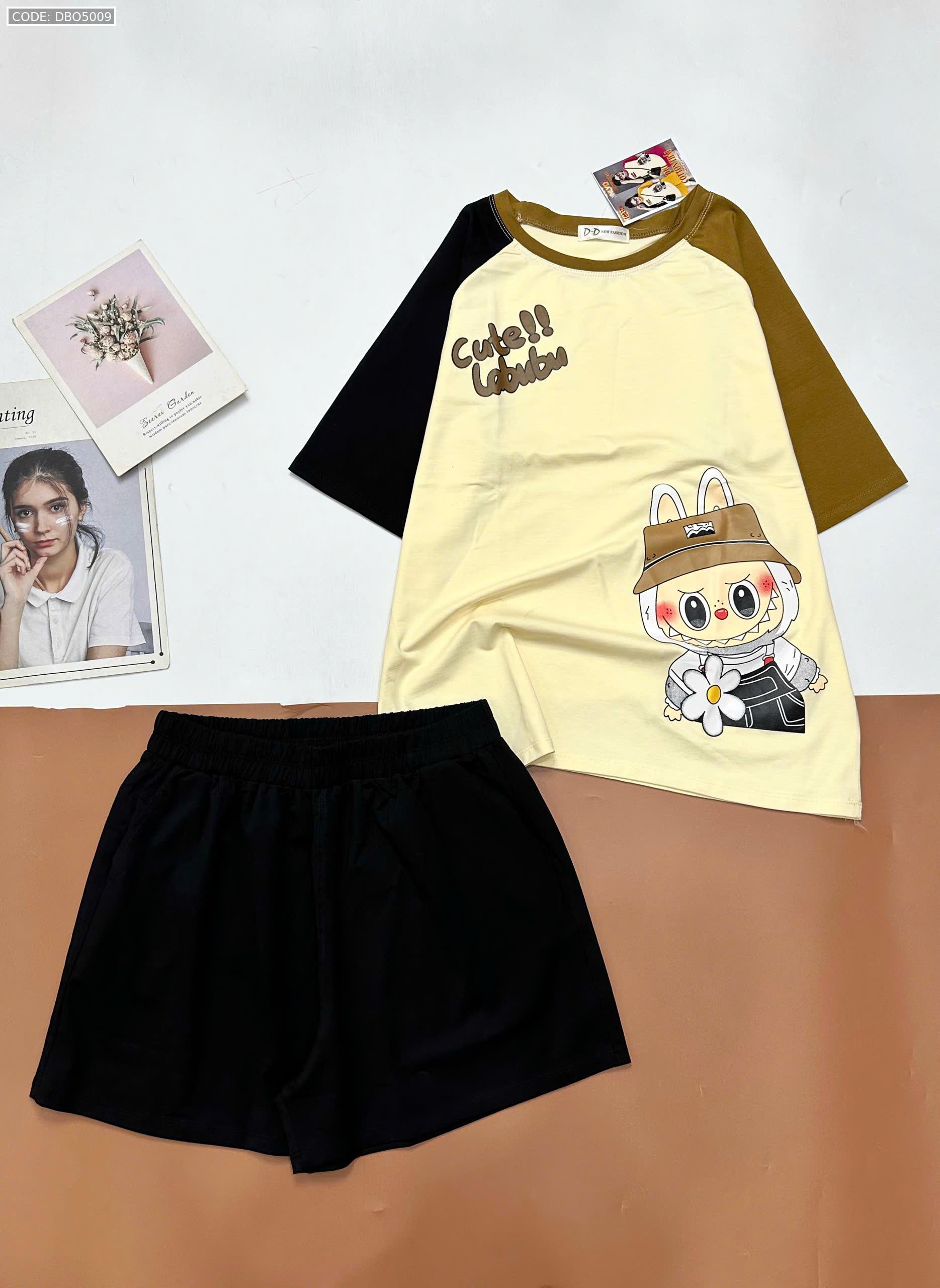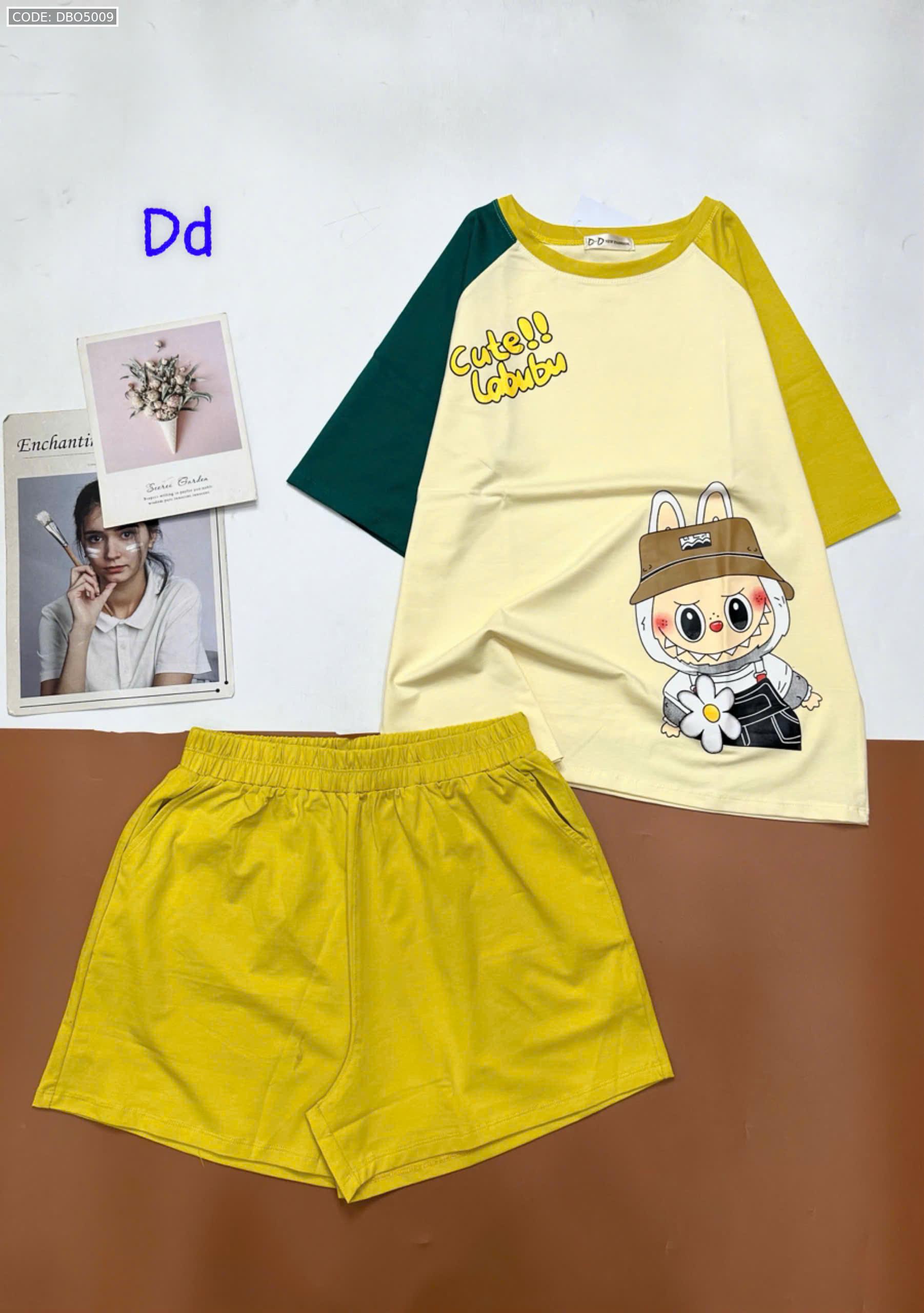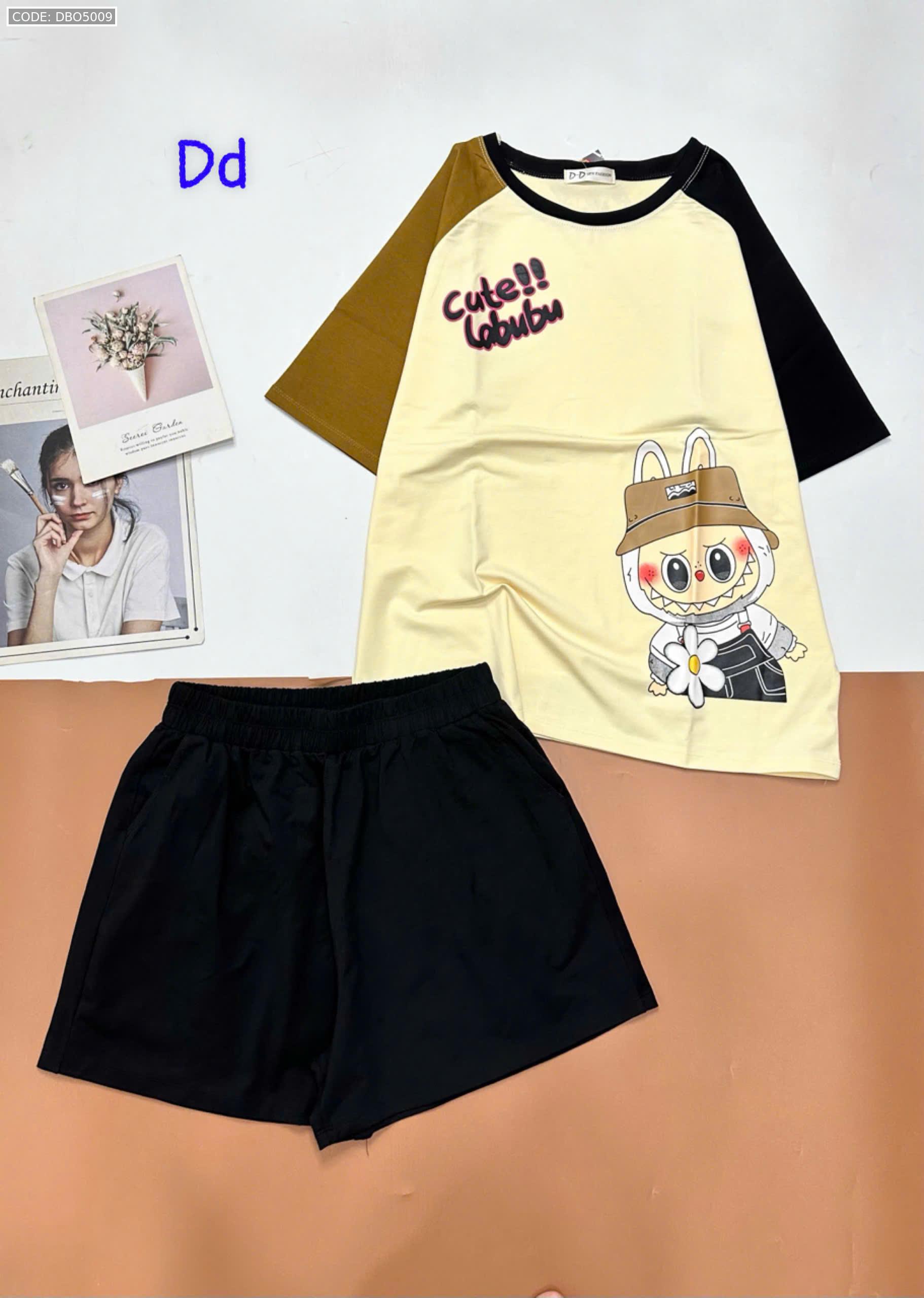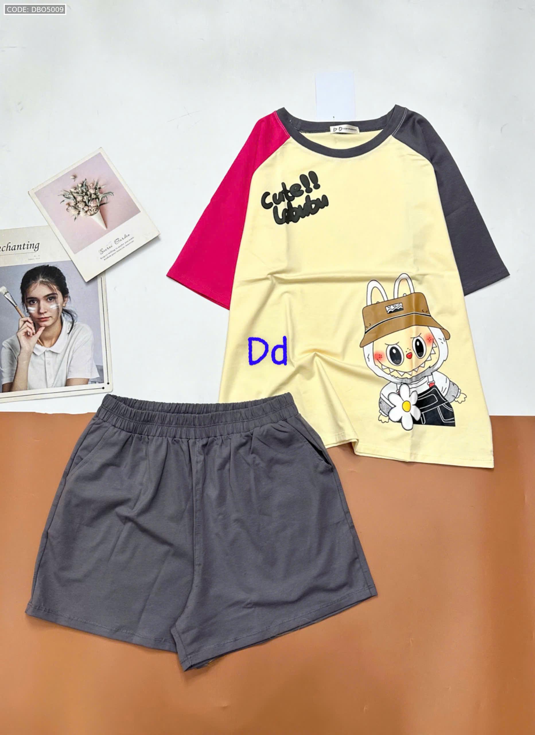 Đồ bộ quần đùi cùng màu tay áo bên phải áo tay ngắn tay 2 màu labubu