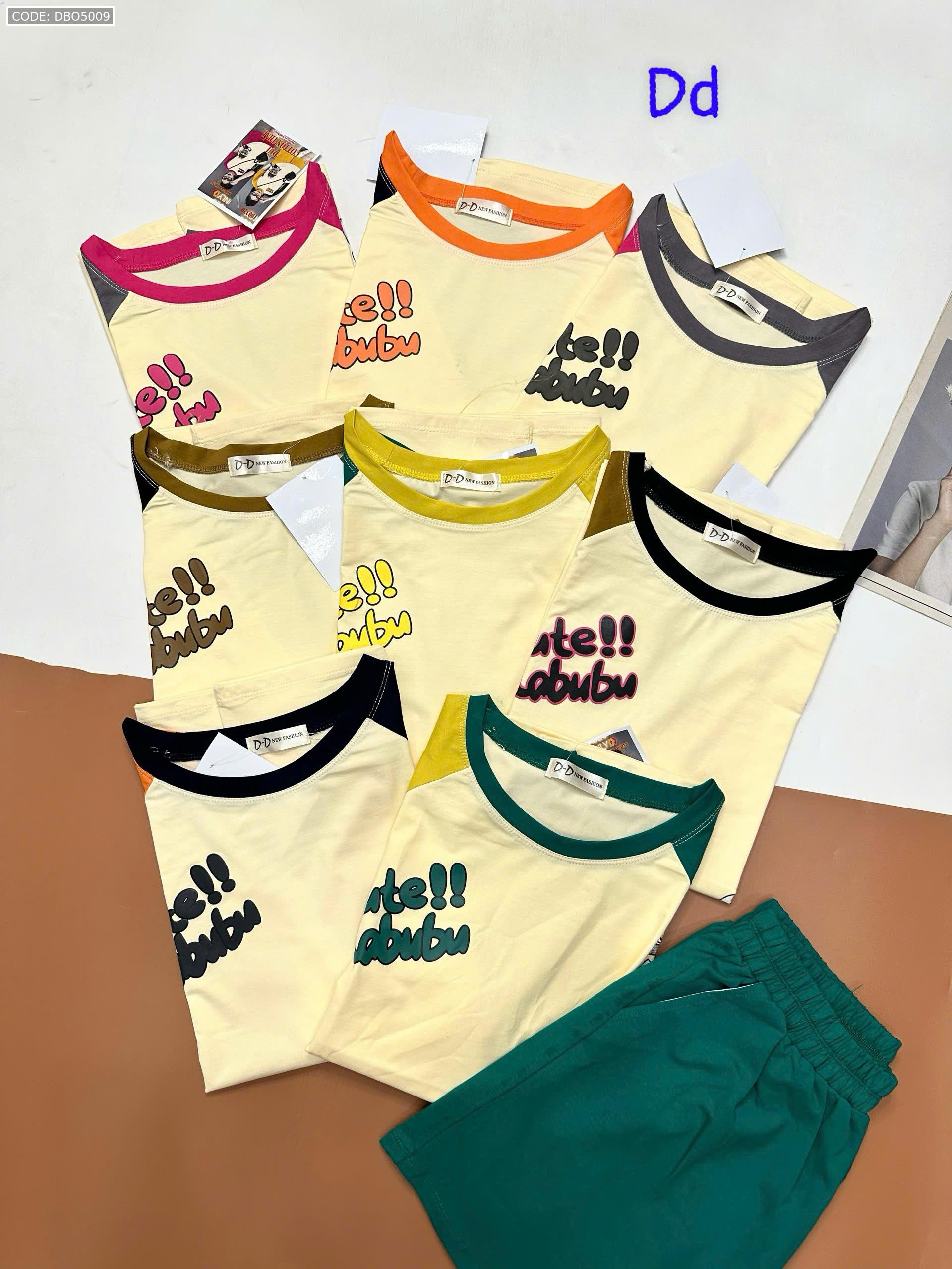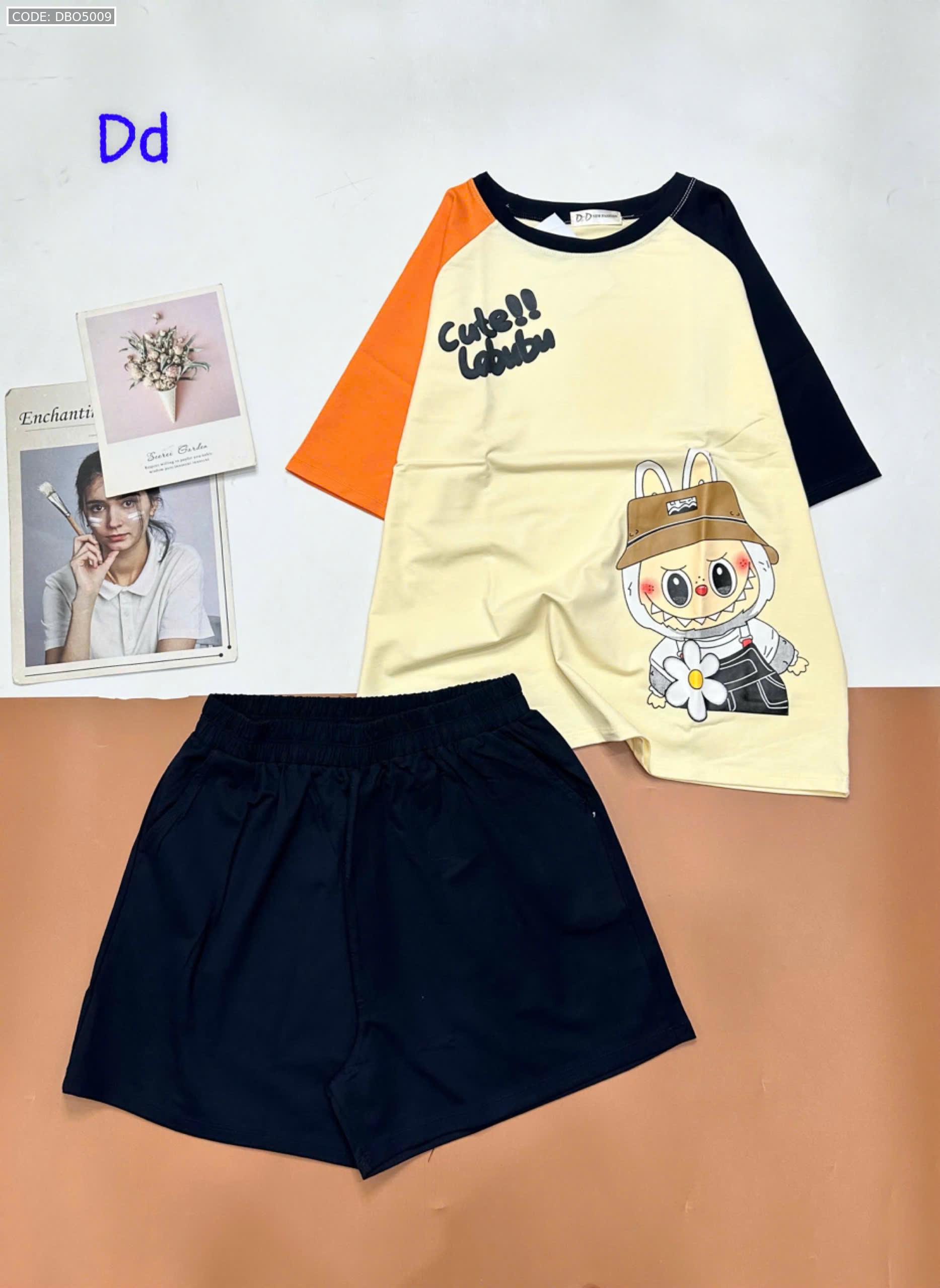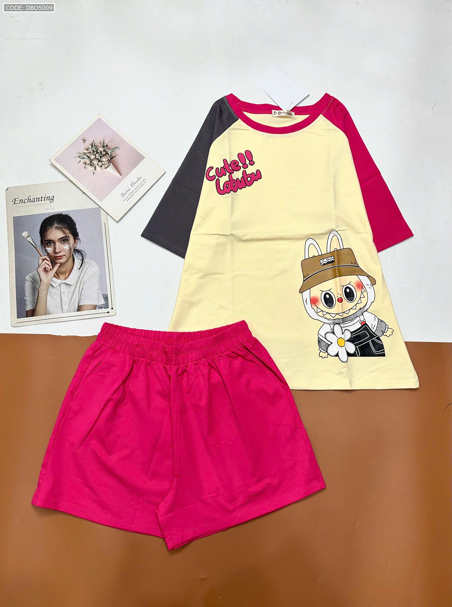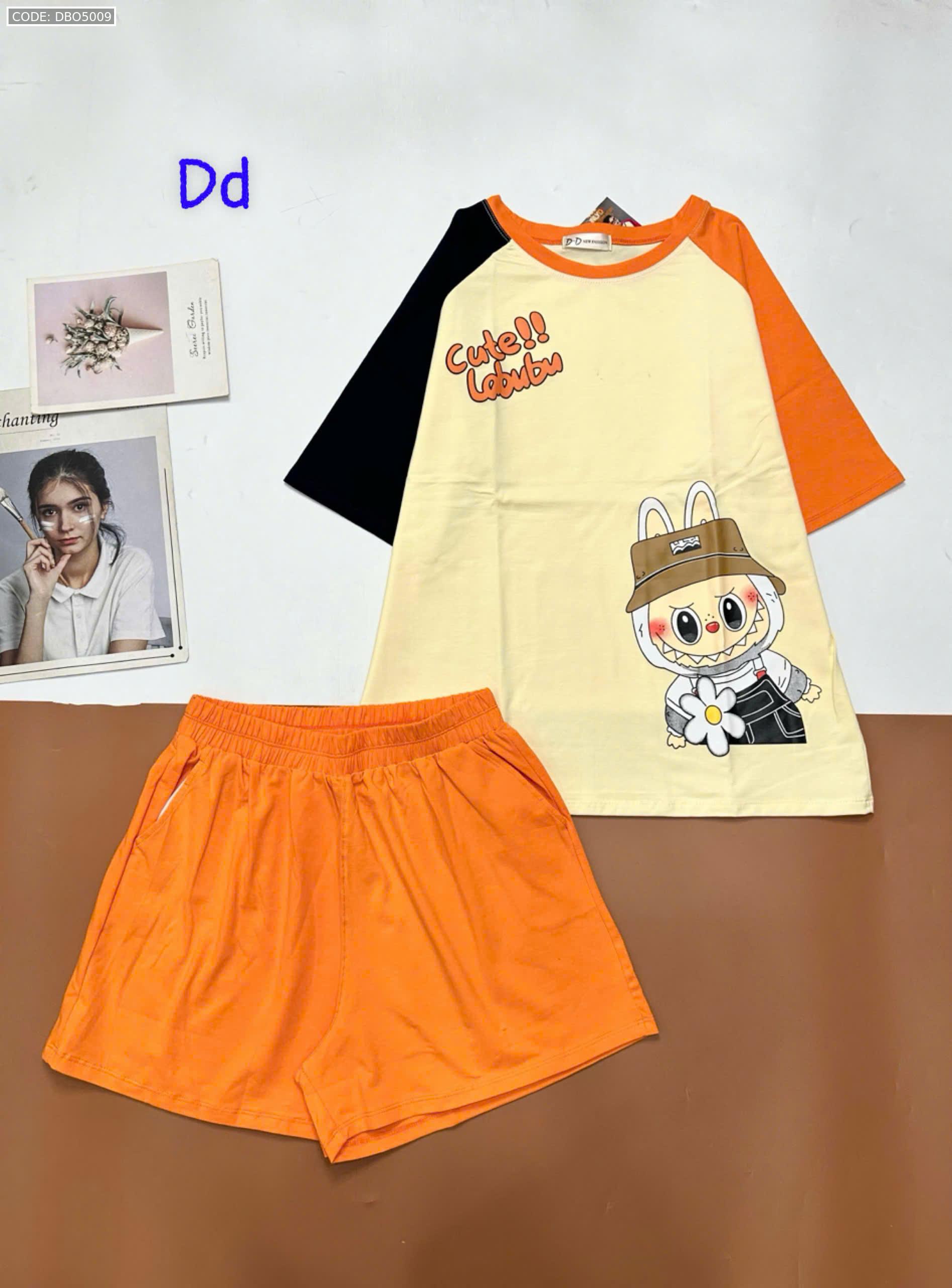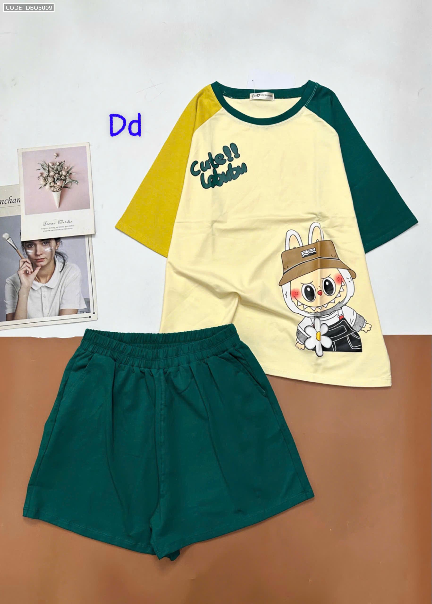 Đồ bộ quần đùi cùng màu tay áo bên phải áo tay ngắn tay 2 màu labubu