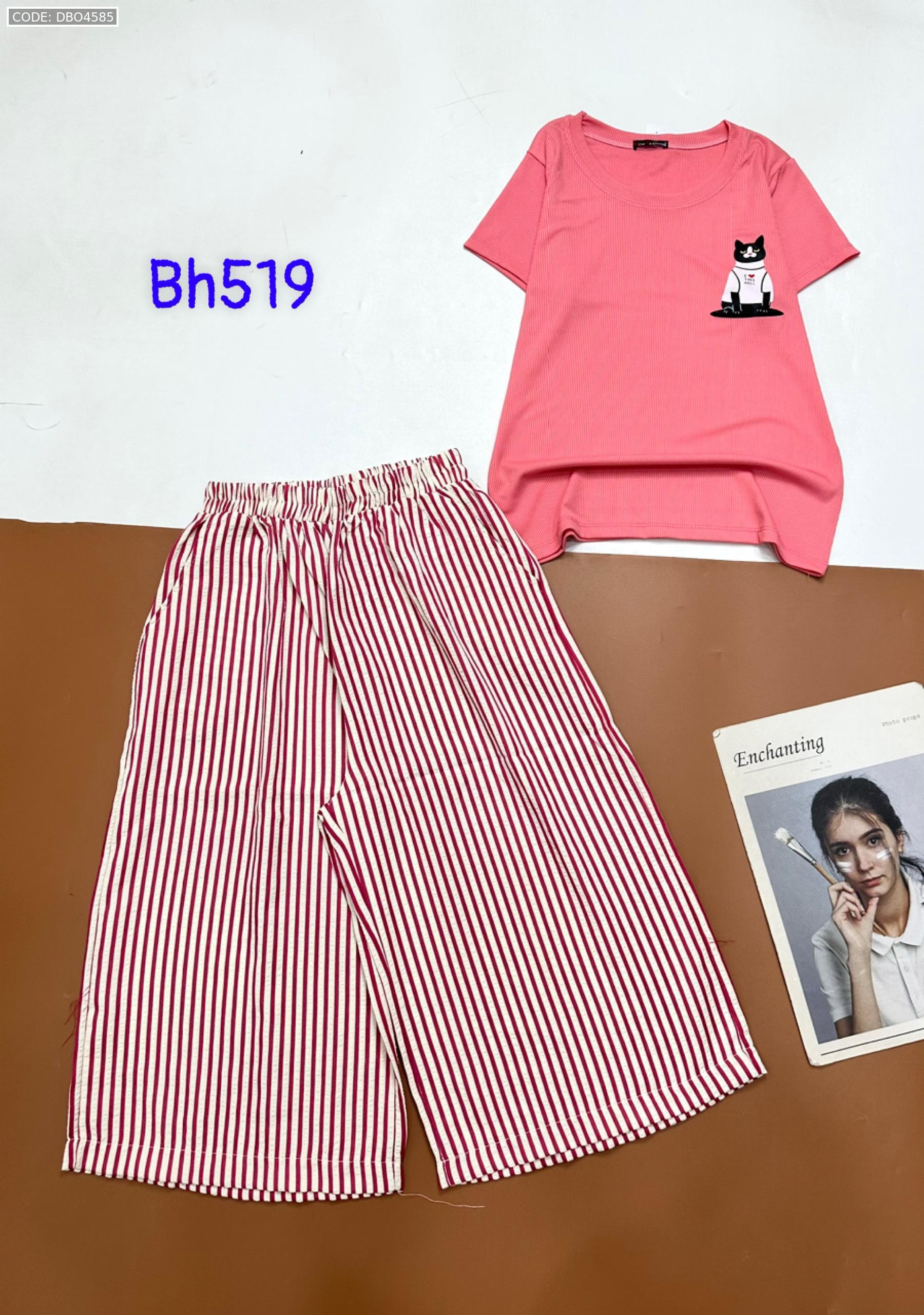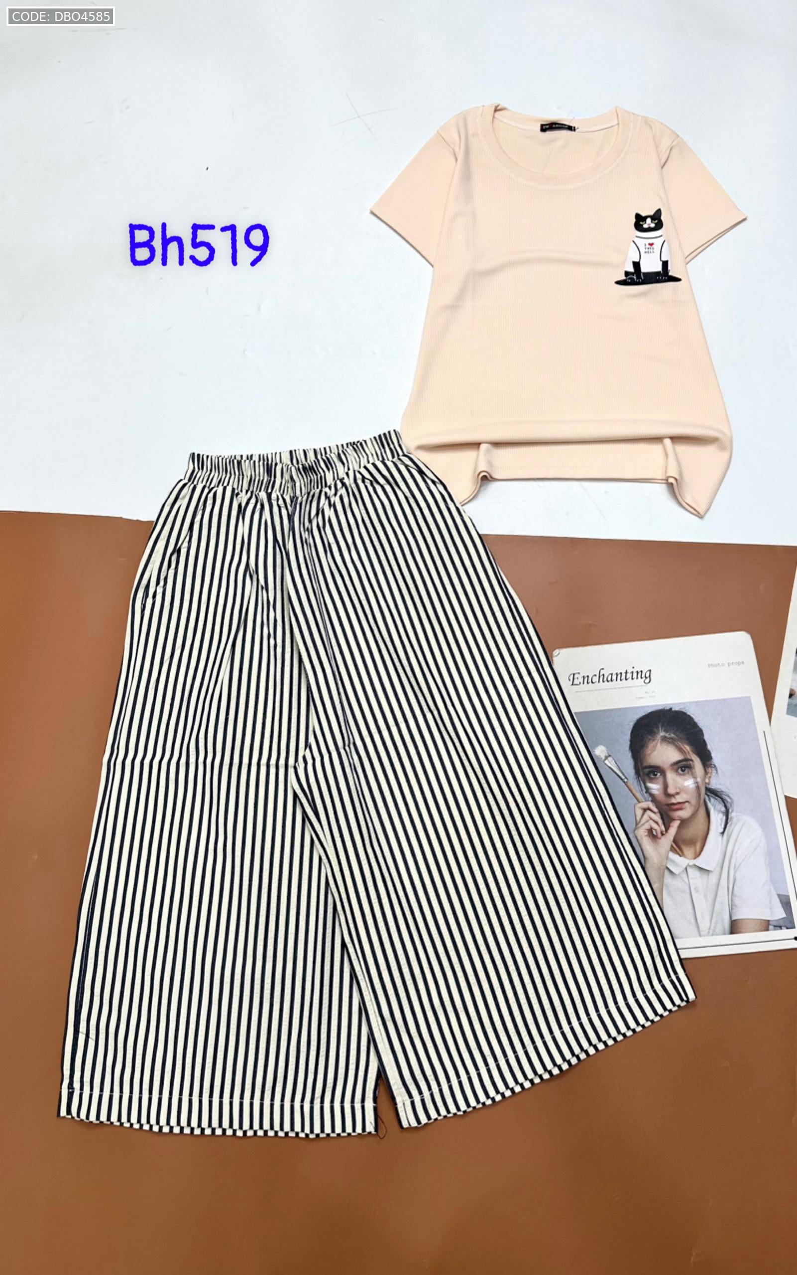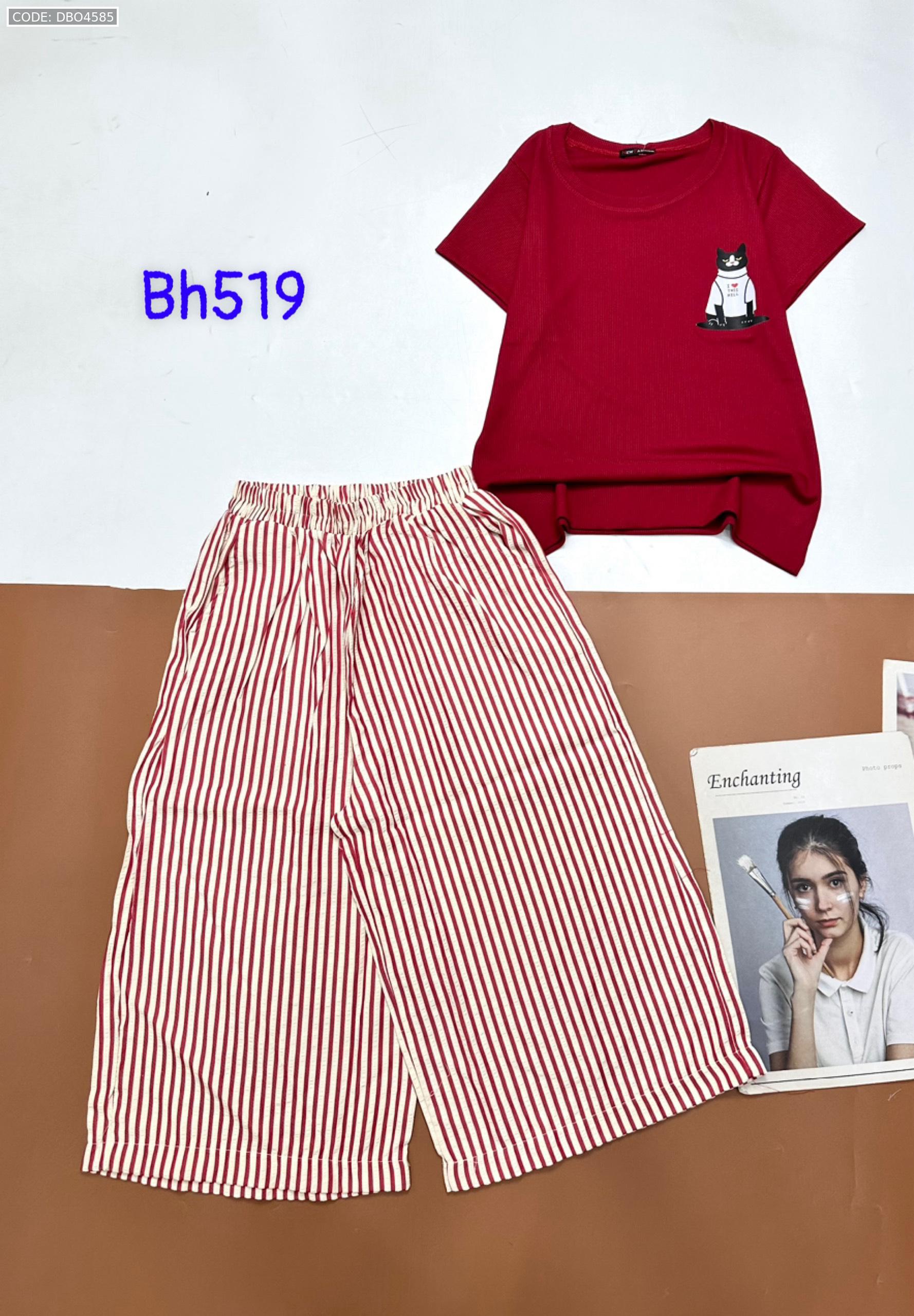 Đồ bộ quần lửng sọc áo tay ngắn in mèo mặt cười gấu