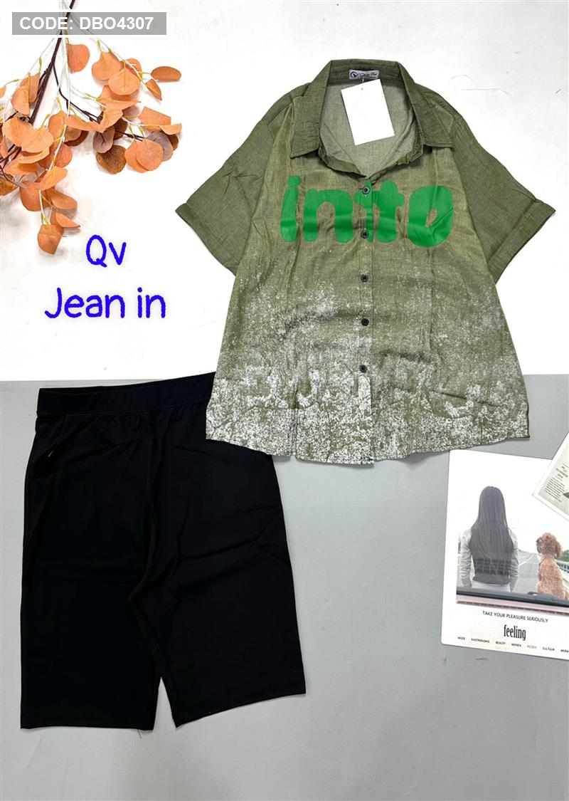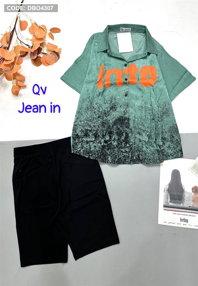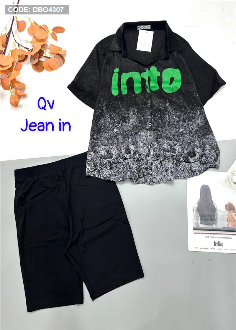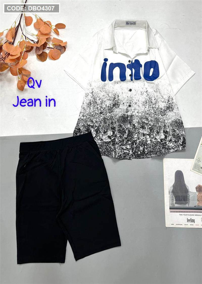 Đồ bộ quần ngố đen áo sơ mi tay ngắn cổ bẻ in chữ