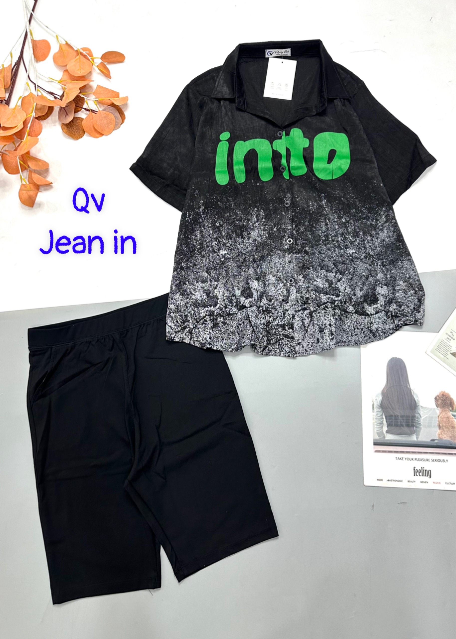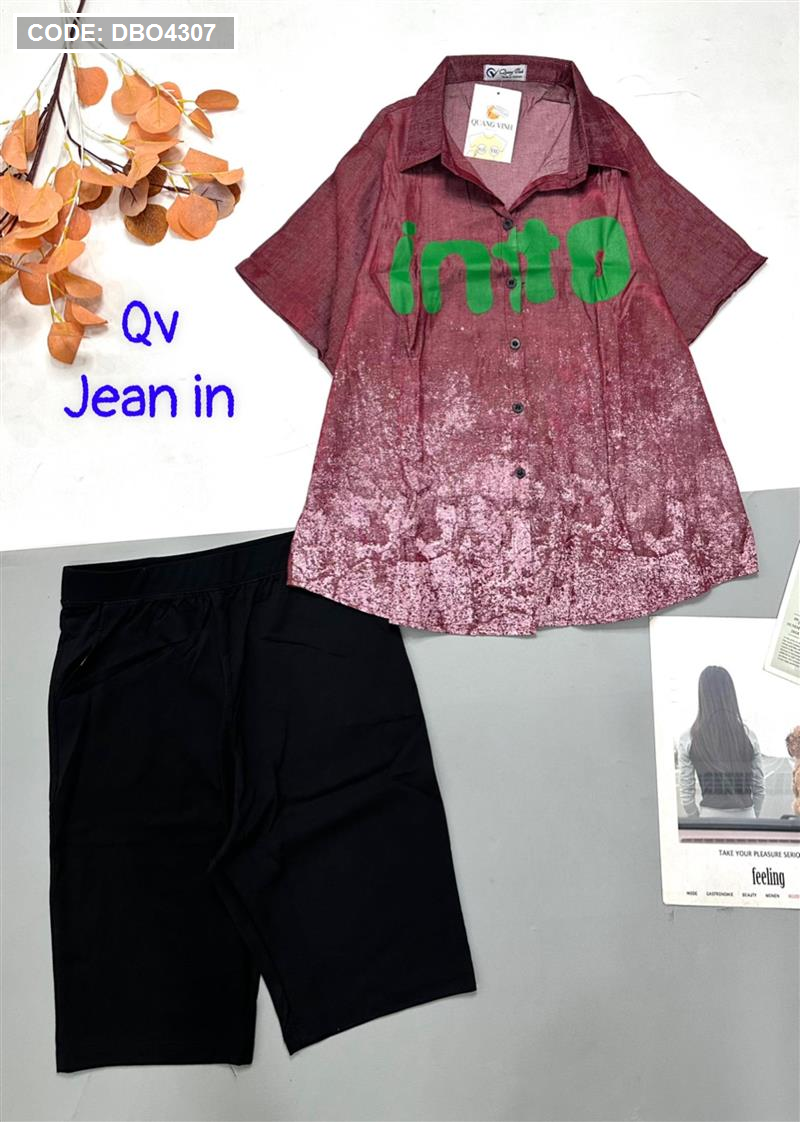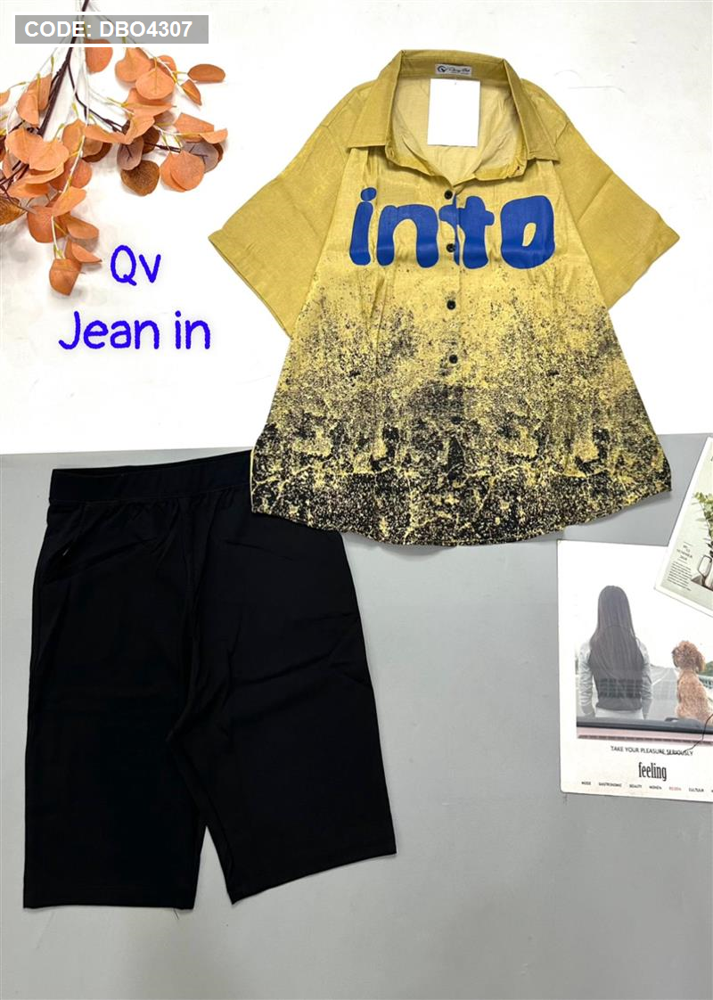 Đồ bộ quần ngố đen áo sơ mi tay ngắn cổ bẻ in chữ